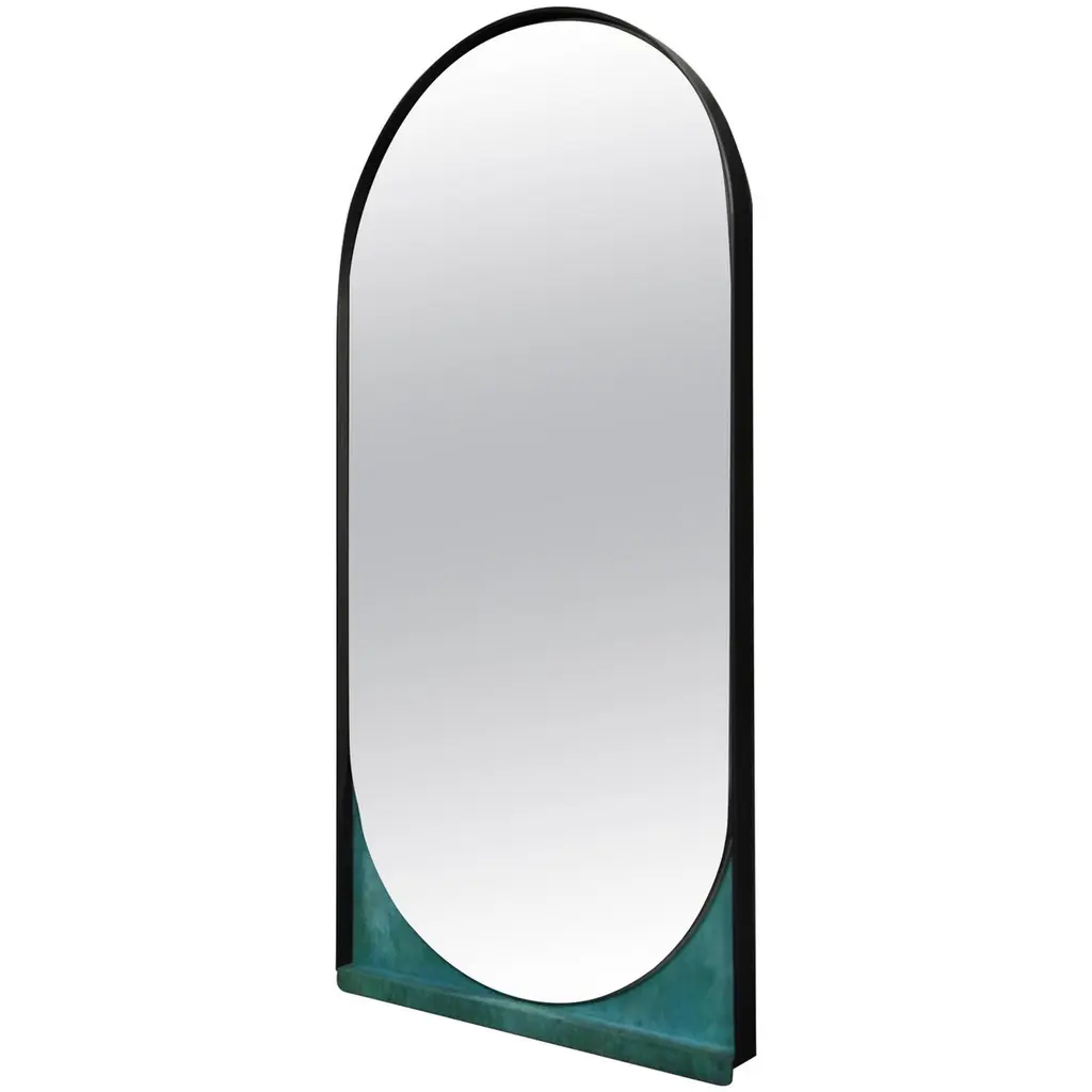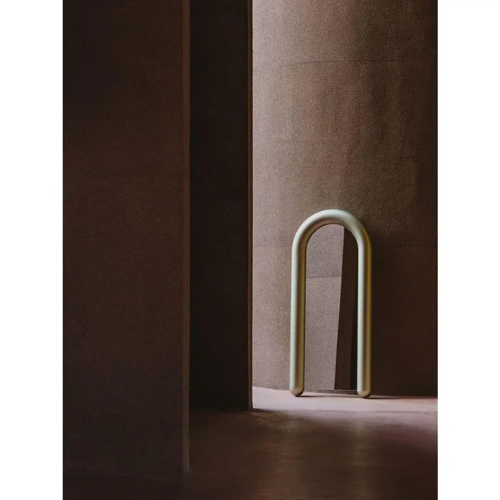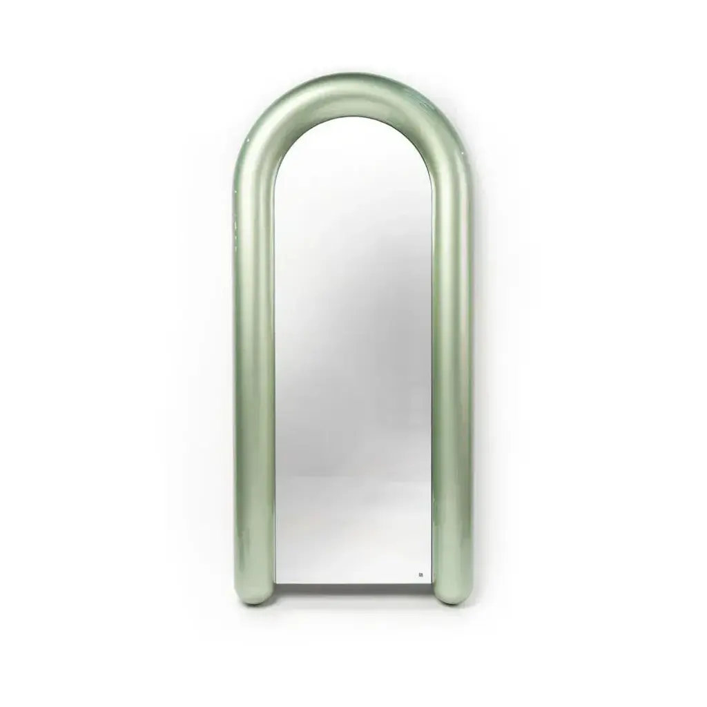 Soufflé mirror by luca nichetto. Materials: structure: menthol / coral / prune liquid-painted metal, mirror. Dimensions: w 91.5 x d 16 x h 200.5 cm. With a playful design and an inflated appearance, soufflé mirror borrows the french expression for ‘blown’ to name itself, emphasising its more evident and distinctive feature. A frame by the puffy and light appearance of a balloon hides inside a wooden structure and contains the arch-shaped surface of the full-length mirror. The tubular fixture, while guaranteeing a variable support point, both on the wall and on the ground, it allows the mirror to assume the ideal position, to adapt accordingly to the environment. Its finishing amplifies the reflectivity, making soufflé mirror to stand as a functional yet decorative object.