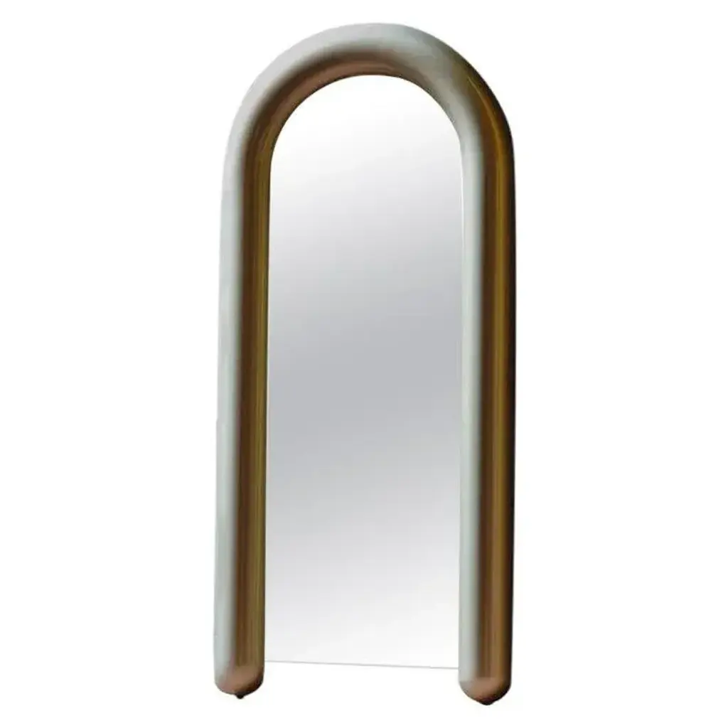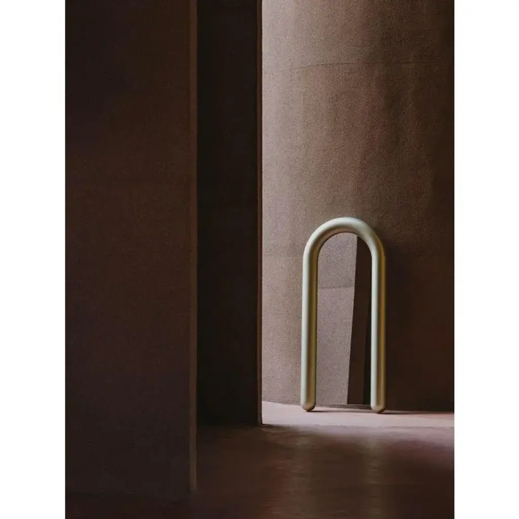 Soufflé mirror by luca nichetto materials: structure: menthol ncs 2020 g40y/coral ncs 2570 y70r/prune ncs 8010 r50b liquid-painted metal, mirror dimensions: w91.5 x d16x h200.5 cm with a playful design and an inflated appearance, soufflé mirror borrows the french expression for ‘blown’ to name itself, emphasising its more evident and distinctive feature. A frame by the puffy and light appearance of a balloon hides inside a wooden structure and contains the arch-shaped surface of the full-length mirror. The tubular fixture, while guaranteeing a variable support point, both on the wall and on the ground, it allows the mirror to assume the ideal position, to adapt accordingly to the environment. Its finishing amplifies the reflectivity, making soufflé mirror to stand as a functional yet decorative object.