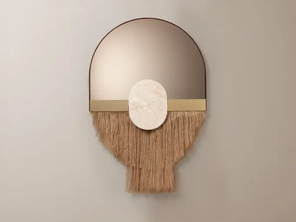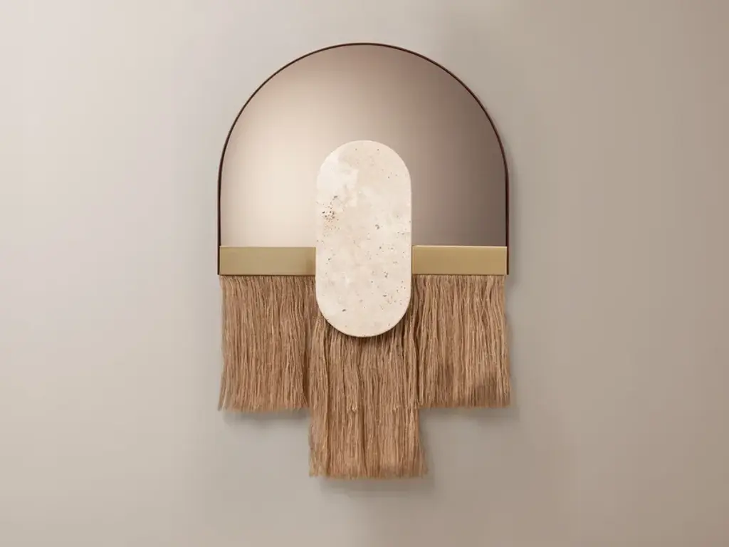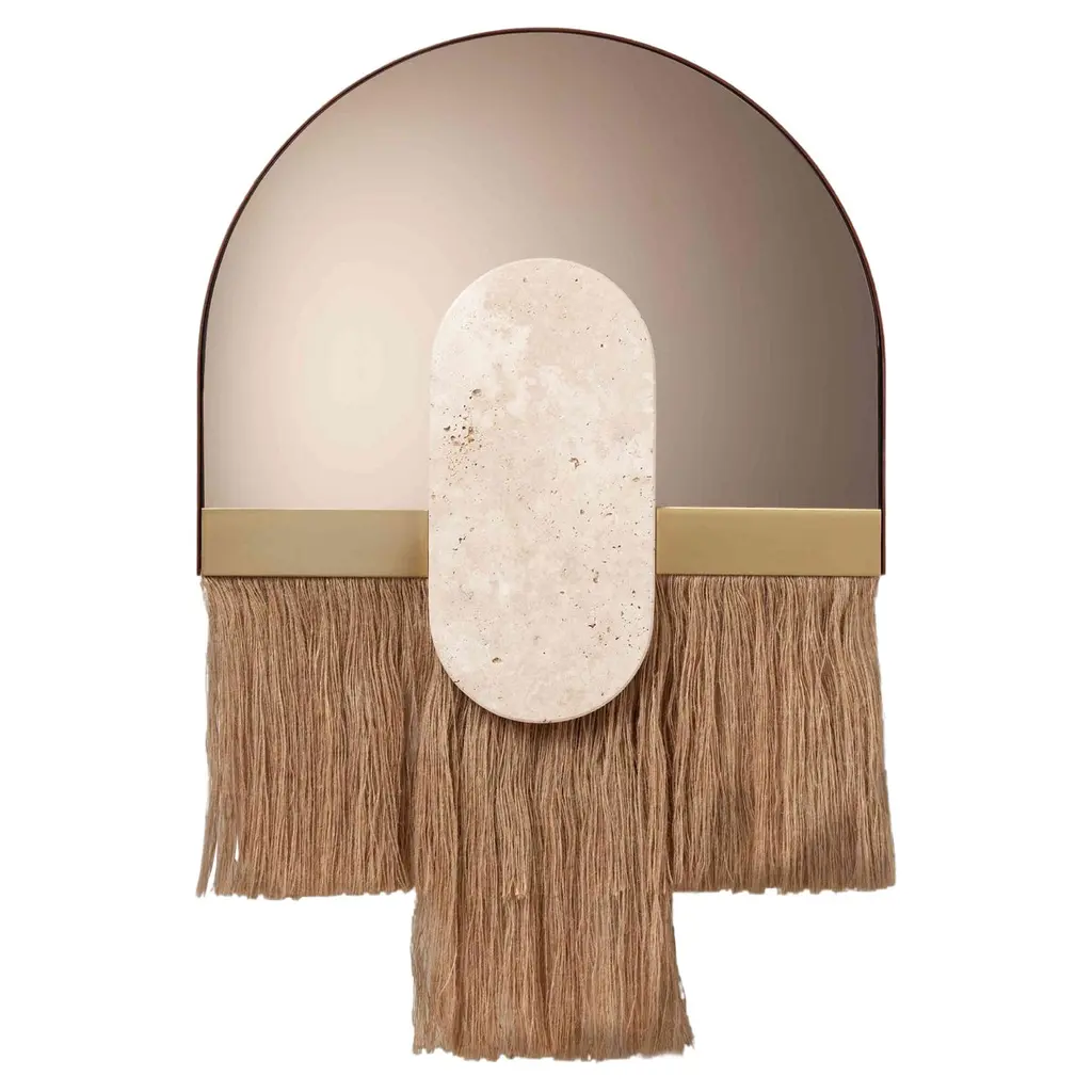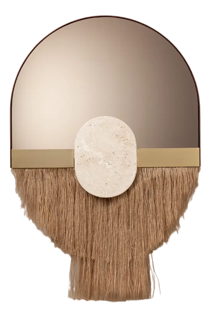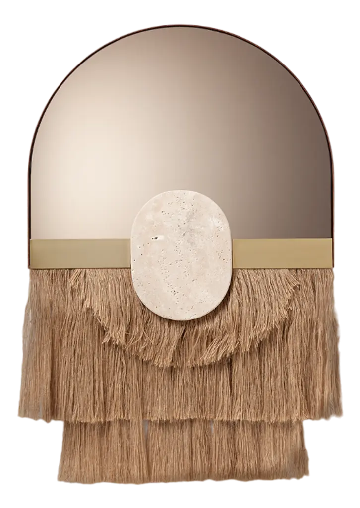 Created by the perfect combination of color, energy and shape, Souk mirrors reflect the influences of overwhelming and visually fascinating Souk markets in northern Africa with its vibrant fringes and earthy colors resembling typical macramé techniques.Top Mirror: Gris mirror, Bronze mirror, Aged mirrorMarble Application: TravertineMetal Application: Polished or Satin Brass or NickelFringes: Natural rattan
