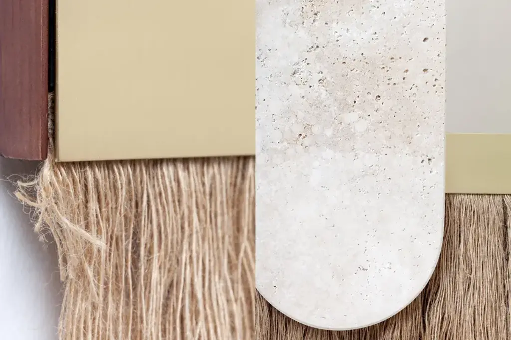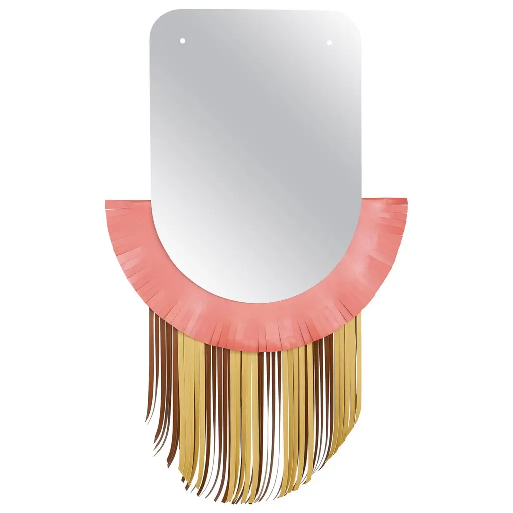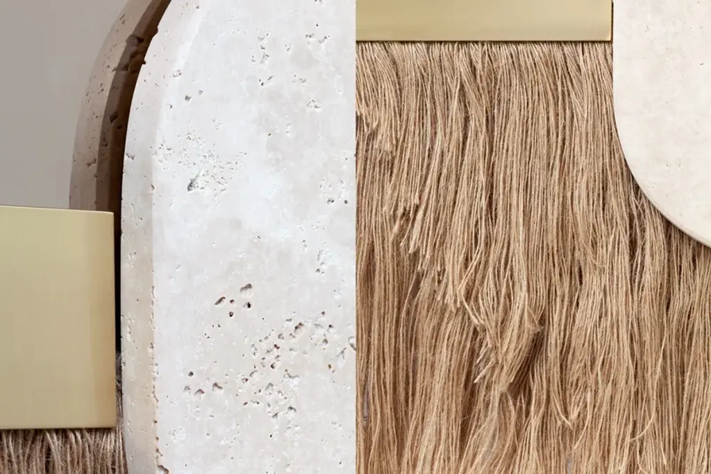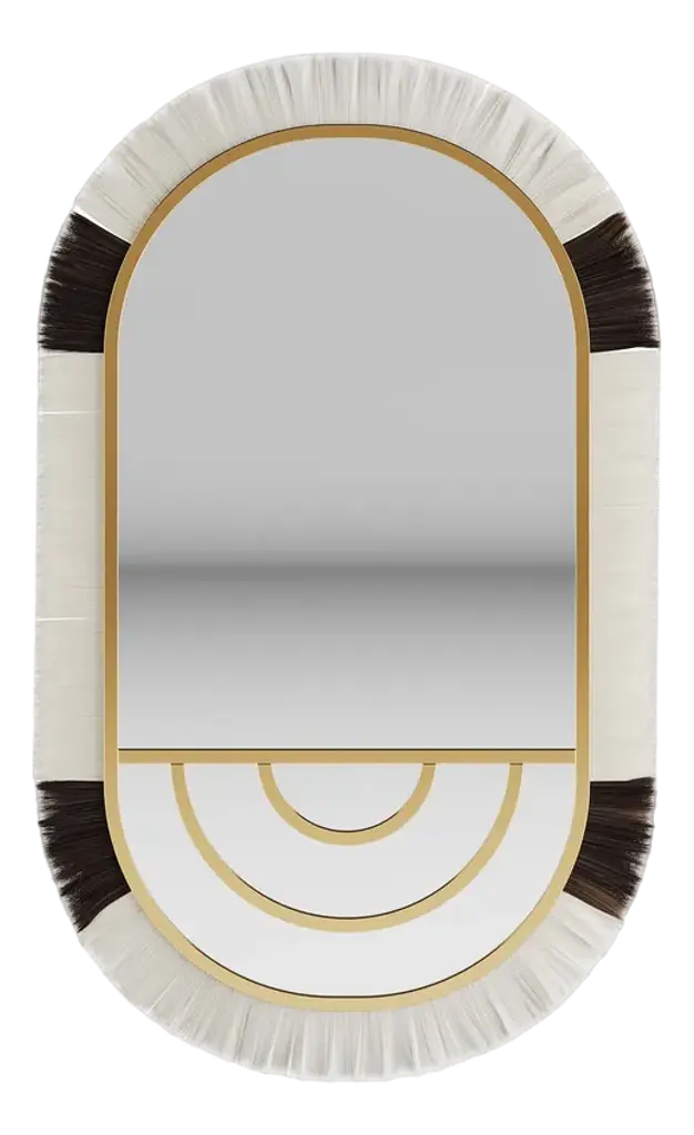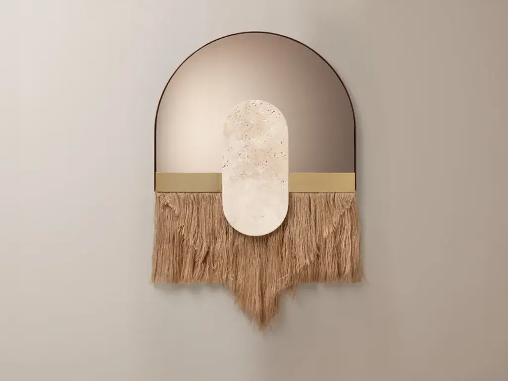 Created by the perfect combination of color, energy and shape, Souk mirrors reflect the influences of overwhelming and visually fascinating Souk markets in northern Africa with its vibrant fringes and earthy colors resembling typical macramé techniques.Top Mirror: Gris mirror, Bronze mirror, Aged mirrorMarble Application: TravertineMetal Application: Polished or Satin Brass or NickelFringes: Natural rattan