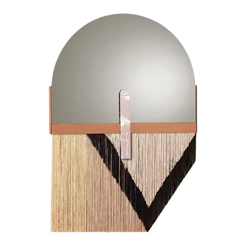 Created by the perfect combination of color, energy and shape, Souk mirrors reflect the influences of overwhelming and visually fascinating Souk markets in northern Africa with its vibrant fringes and earthy colors resembling typical macramé techniques.MaterialTop Mirror : Gris mirror, Bronze mirror, Aged mirrorMarble Application : Estremoz White, Estremoz Rose, Guatemala Green and Nero MarquinaMetal Application : Polished or Satin Brass or NickelFringes : Three color combinations availableSizeW 24" x H 38".