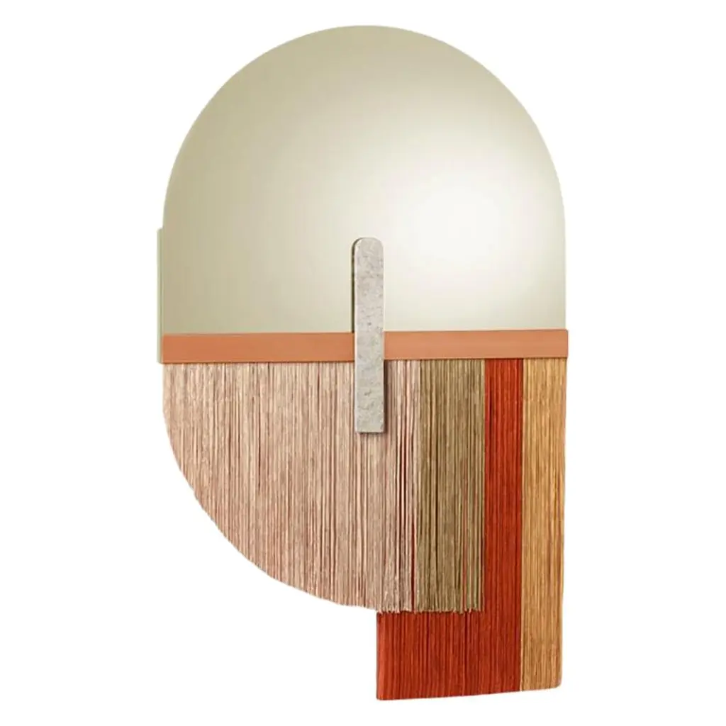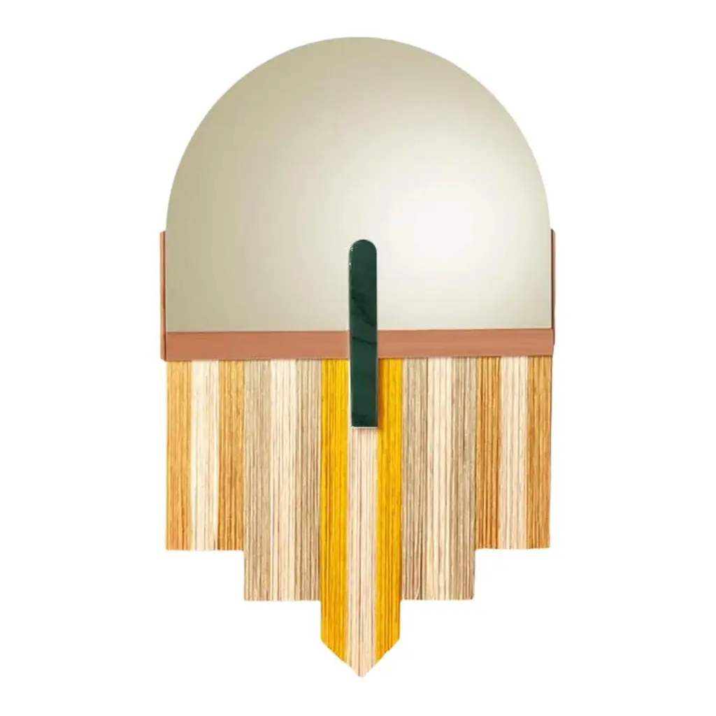 Created by the perfect combination of color, energy and shape, Souk mirrors reflect the influences of overwhelming and visually fascinating Souk markets in northern Africa with its vibrant fringes and earthy colors resembling typical macramé techniques.MaterialTop Mirror : Gris mirror, Bronze mirror, Aged mirrorMarble Application : Estremoz White, Estremoz Rose, Guatemala Green and Nero MarquinaMetal Application : Polished or Satin Brass or NickelFringes : Three color combinations availableSizeW 24" x H 38".
