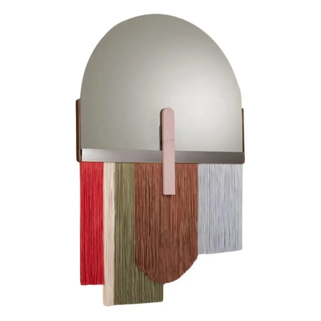 Created by the perfect combination of color, energy and shape, Souk mirrors reflect the influences of overwhelming and visually fascinating Souk markets in northern Africa with its vibrant fringes and earthy colors resembling typical macramé techniques.MaterialTop Mirror : Gris mirror, Bronze mirror, Aged mirrorMarble Application : Estremoz White, Estremoz Rose, Guatemala Green and Nero MarquinaMetal Application : Polished or Satin Brass or NickelFringes : Three color combinations availableSizeW 24" x H 38".