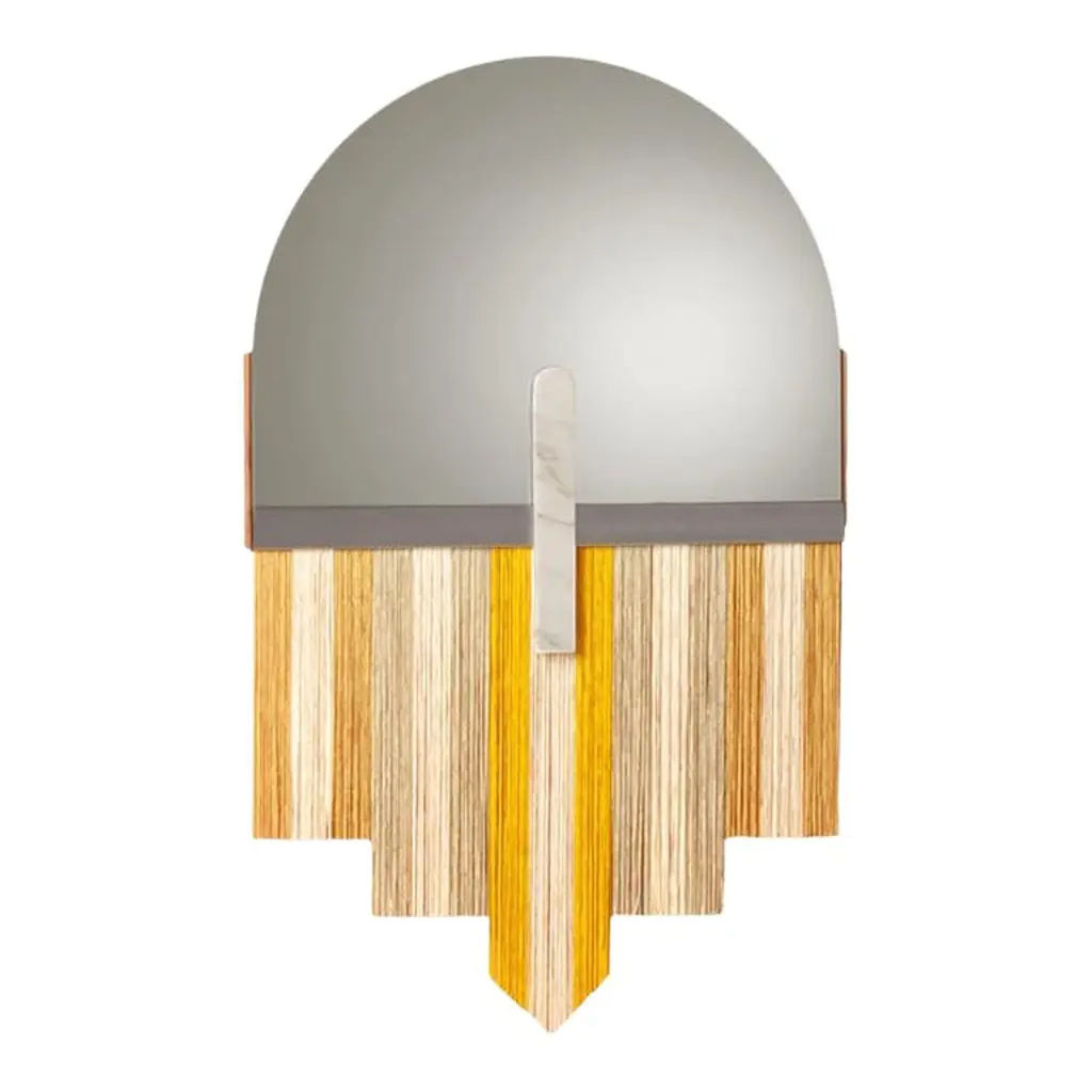 Created by the perfect combination of color, energy and shape, Souk mirrors reflect the influences of overwhelming and visually fascinating Souk markets in northern Africa with its vibrant fringes and earthy colors resembling typical macramé techniques.MaterialTop mirror : gris mirror, bronze mirror, aged mirrorMarble application : estremoz white, estremoz rose, guatemala green and nero marquinaMetal application : polished or satin brass or nickelFringes : three color combinations availableSizeW 24" x H 38".