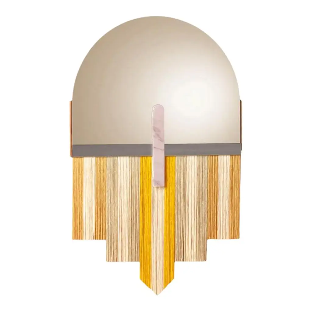 Created by the perfect combination of color, energy and shape, Souk mirrors reflect the influences of overwhelming and visually fascinating Souk markets in northern Africa with its vibrant fringes and earthy colors resembling typical macramé techniques.MaterialTop Mirror : Gris mirror, Bronze mirror, Aged mirrorMarble Application : Estremoz White, Estremoz Rose, Guatemala Green and Nero MarquinaMetal Application : Polished or Satin Brass or NickelFringes : Three color combinations availableSizeW 24" x H 38".