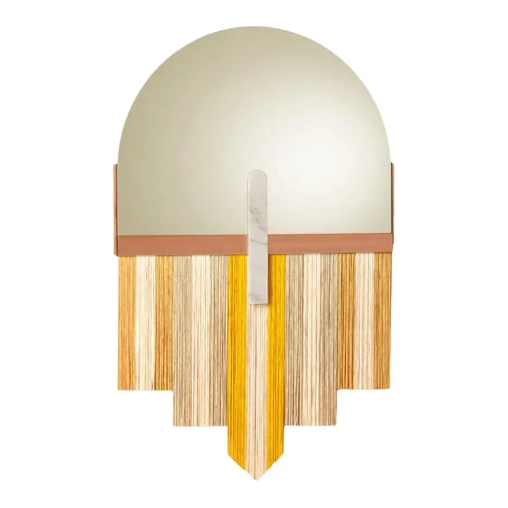 Created by the perfect combination of color, energy and shape, Souk mirrors reflect the influences of overwhelming and visually fascinating Souk markets in northern Africa with its vibrant fringes and earthy colors resembling typical macramé techniques.MaterialTop Mirror : Gris mirror, Bronze mirror, Aged mirrorMarble Application : Estremoz White, Estremoz Rose, Guatemala Green and Nero MarquinaMetal Application : Polished or Satin Brass or NickelFringes : Three color combinations availableSizeW 24" x H 38".