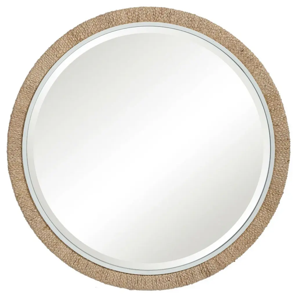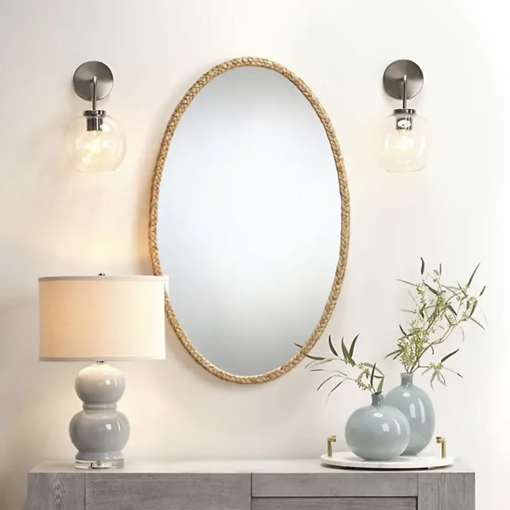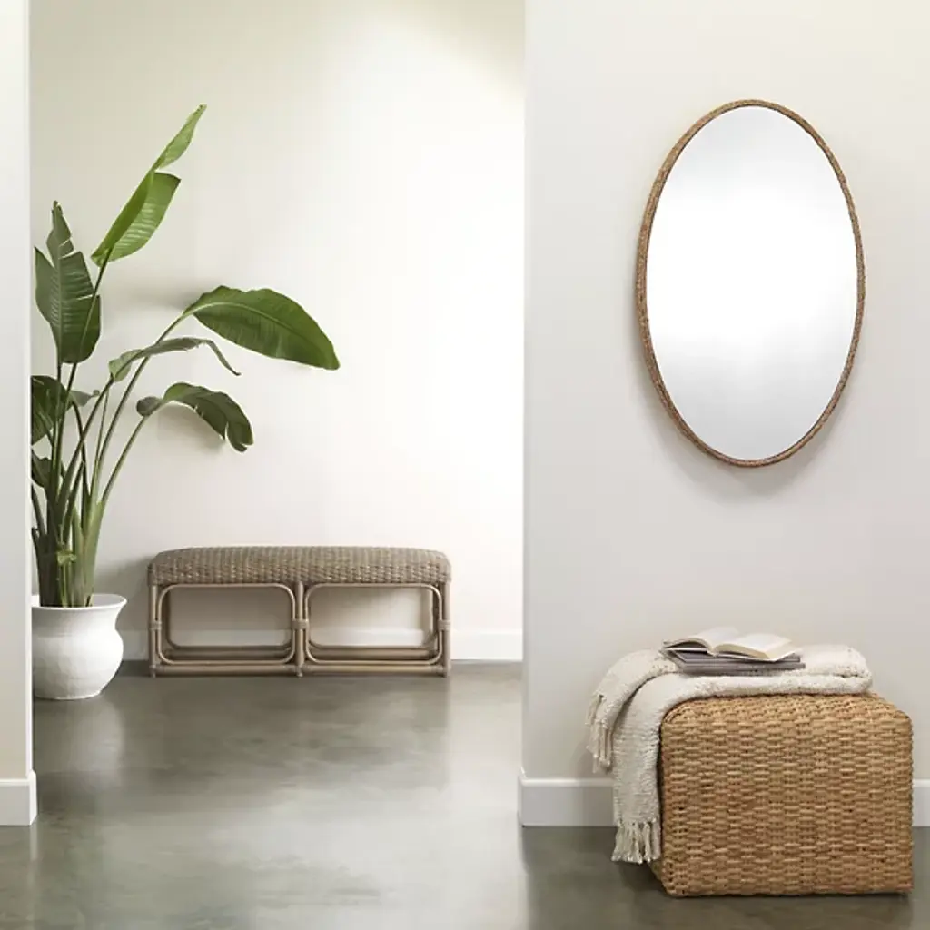 The Sparrow Braided Natural Seagrass Oval Mirror from Jamie Young provides a touching tropical charm to interior walls. Starting with a smooth oval mirror, it’s surrounded by a simple frame of artisan-crafted and hand-woven natural grasses. The unified, looping braids offer the soothing swirl of a repeating pattern, while the natural material and hand-manufacture give each piece a vibrant, enduring character easily expressed while contrasting with the reflector at its center.