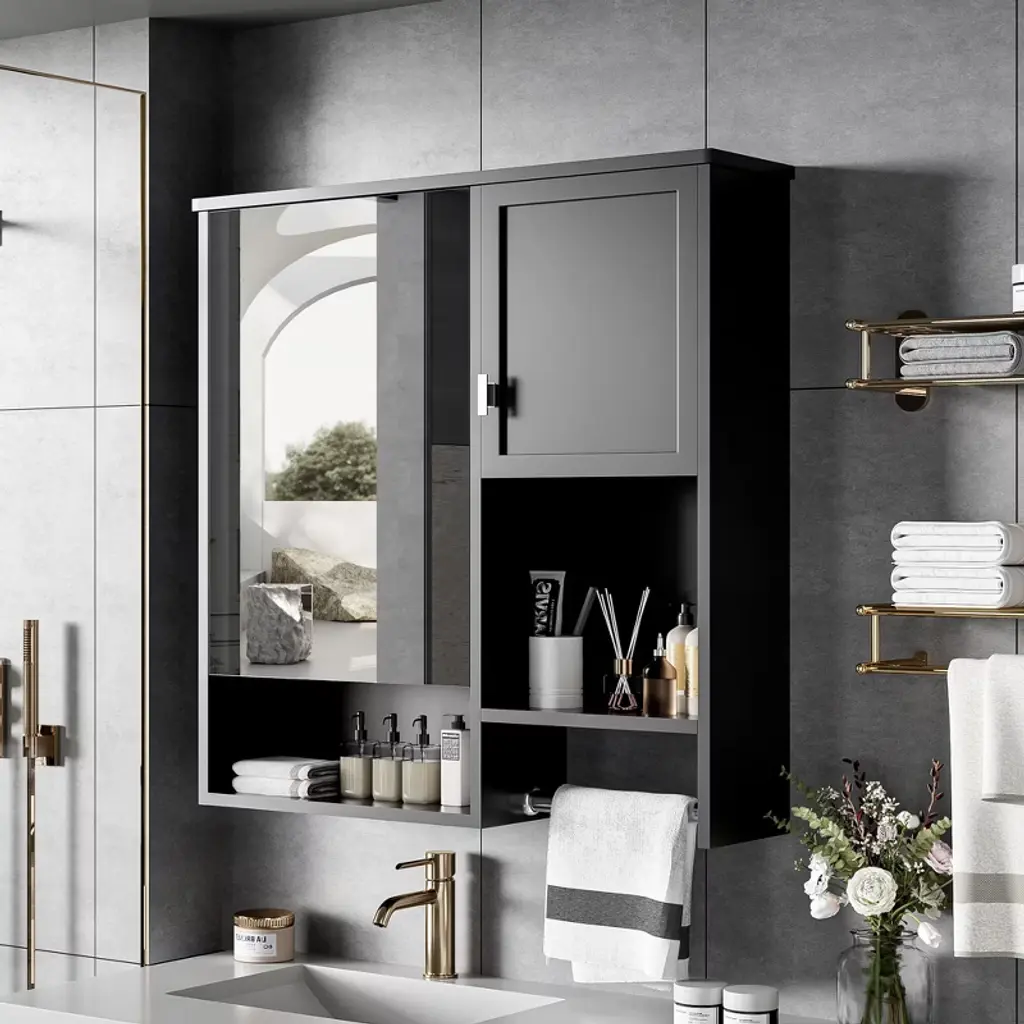 This sleek wall-mounted medicine cabinet combines smart storage with modern design, featuring a built-in mirror and convenient towel bar for space-saving functionality. The versatile unit maximizes vertical space above toilets or on empty walls while keeping essentials organized and within reach. Its clean-lined contemporary design blends seamlessly into any bathroom decor while offering both practical storage and daily grooming convenience.