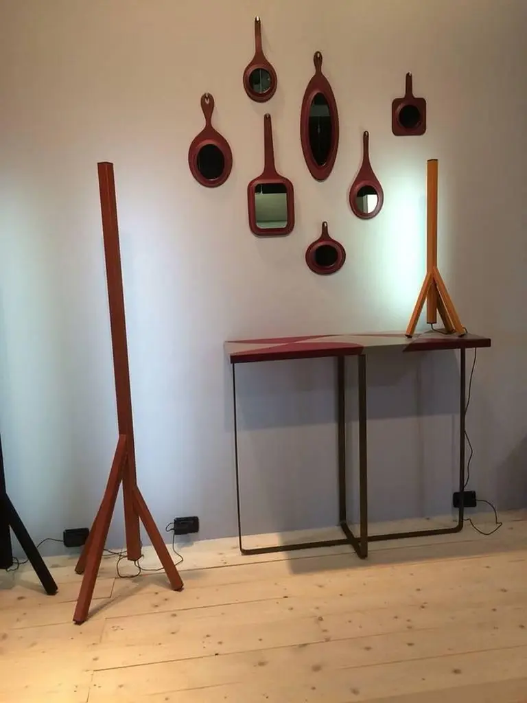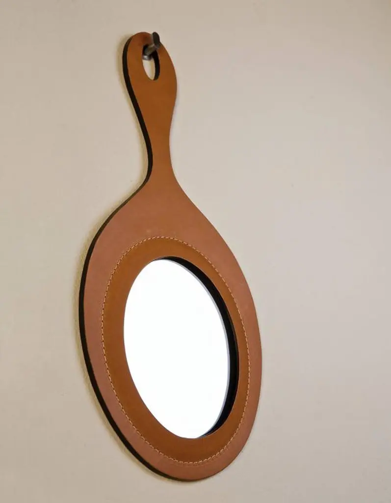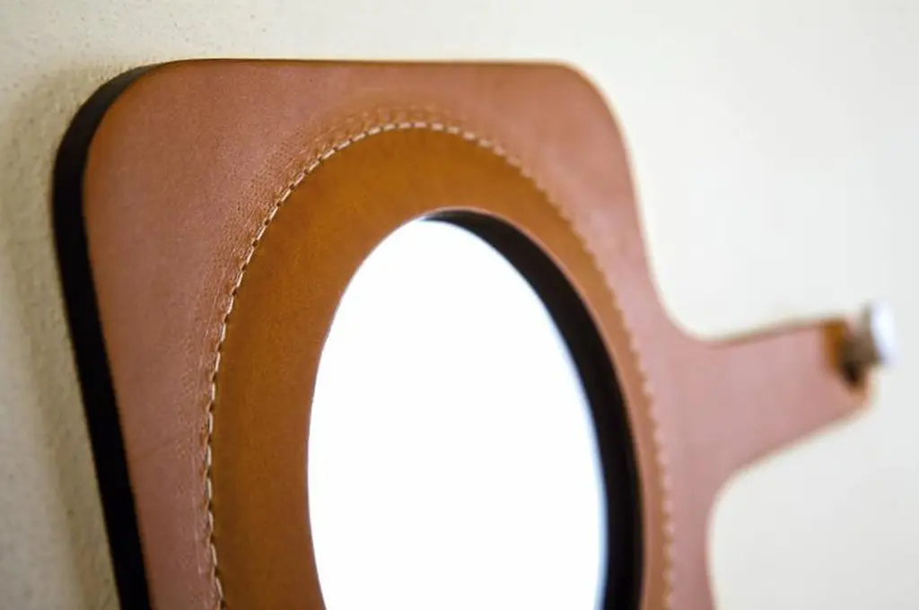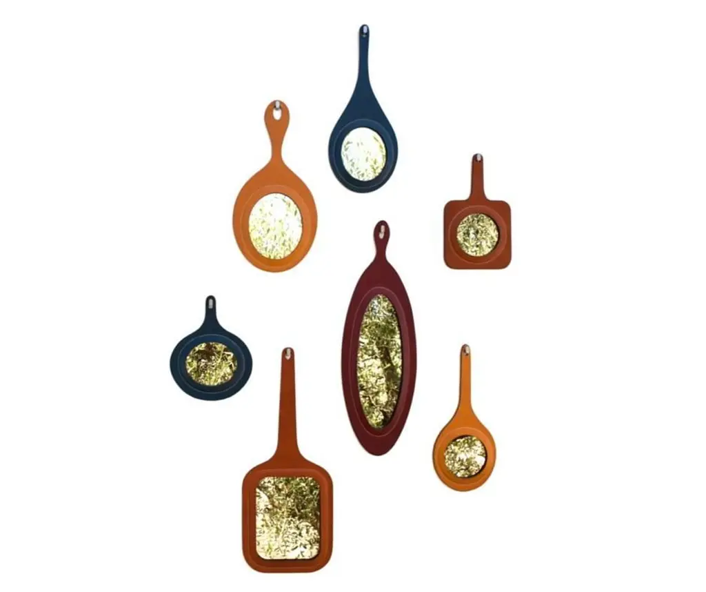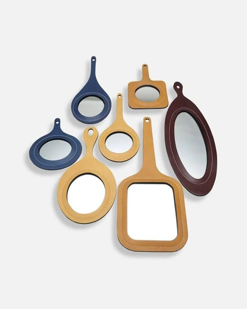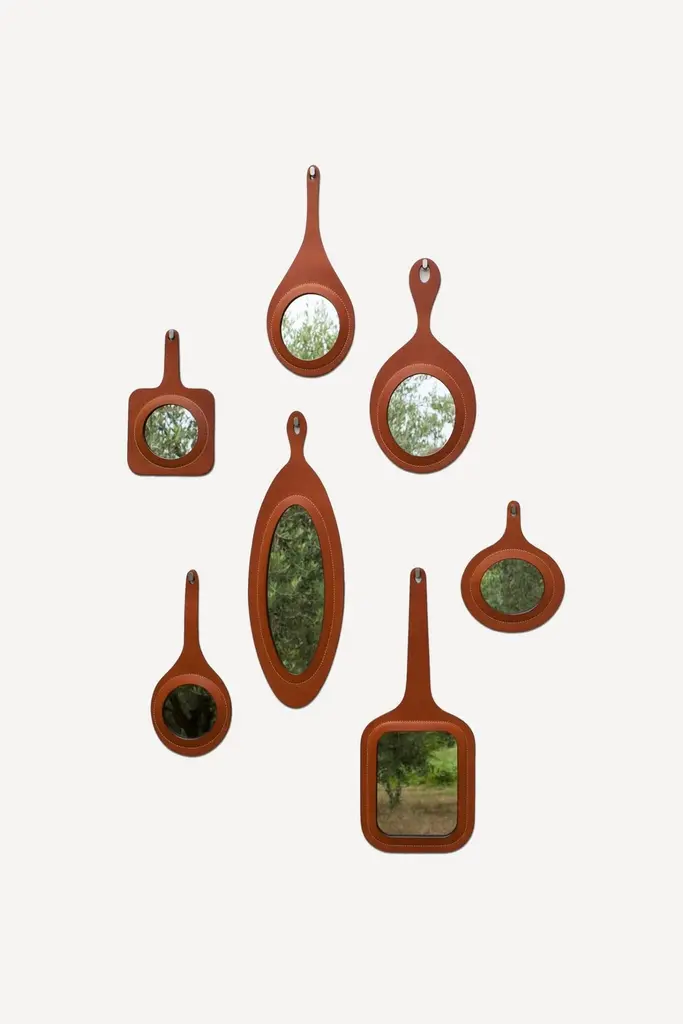 Set of seven hand mirrors which are in fact mounted on the wall. The softness of the leather makes it impossible for them to be held and forces us to hang them up, individually or together.“Mirrors should reflect a little before throwing back images.”Jean Cocteau, Le Sang d’un poète (1930).“This object has always fascinated me. Is it there simply to reflect our imageor is it looking at us? It envelopes us, searches for us, constantly questions us.At Oscar Maschera I looked for what leather could bring to this objectand how it could become its supporting structure.” — Nestor Perkal.Perfect day - set of n. 7 mirrors.Mirror 1 cm 16 x 27.Mirror 2 cm 16 x 39.Mirror 3 cm 19.5 x 39.Mirror 4 cm 18 x 54.5.Mirror 5 cm 21 x 53.Mirror 6 cm 15 x 35.Mirror 7 cm 19 x 24.Each mirror is equipped with stainless steel hook.Nestor Perkal, born in Buenos Aires, lives and works in Paris.Though he trained as an architect, his work has always been oriented to design and interior architecture. In 1985, he founded an international design gallery in Paris, l’Espace Nestor Perkal, where he was among the first in Europe to show and sell pieces from the “New International Design” movement: Memphis Milano, Mariscal and many others.From 1987 to 1994, he was the artistic director of the goldsmith’s company Algorithme, where he invited many designers to work on edition projects that were highly successful in France and abroad. As a designer, he has collaborated with Drimmer, Lou Fagotin, Artcodif, Veronese, etc. At CIRVA (International Research Centre on Glass and Plastic Arts), he created the Miroirs collection in 1994-1996. As an interior architect, he has furnished the “café” of the Maison Européenne de la Photographie in Paris, different areas for Cartier and the Cartier Foundation for Contemporary Art, as well as many private apartments and houses. He has been the curator and scenographer of exhibitions held at the Cartier Foundation (La vie en Roses, 1998), at the Galerie Chez Valentin, Paris (“chez Valentin 2000”), at the Passage de Retz (Paris, 2000), at the Museum of Contemporary Art of Rochechouart and at the Grand Hornu in Belgium for the exhibition Désirs d’Objets (2003-2004) and at the Museum des Arts Décoratifs, Paris for the exhibition Editer le design (2006) and 100% Finlandia (2008). He has been the director of the Research Centre on the Arts of Fire and Earth (CRAFT) of Limoges (1993 – 2009), developing strong and lively projects aimed at creating an experimental and artistic connection between industrialists and designers, architects and artists.