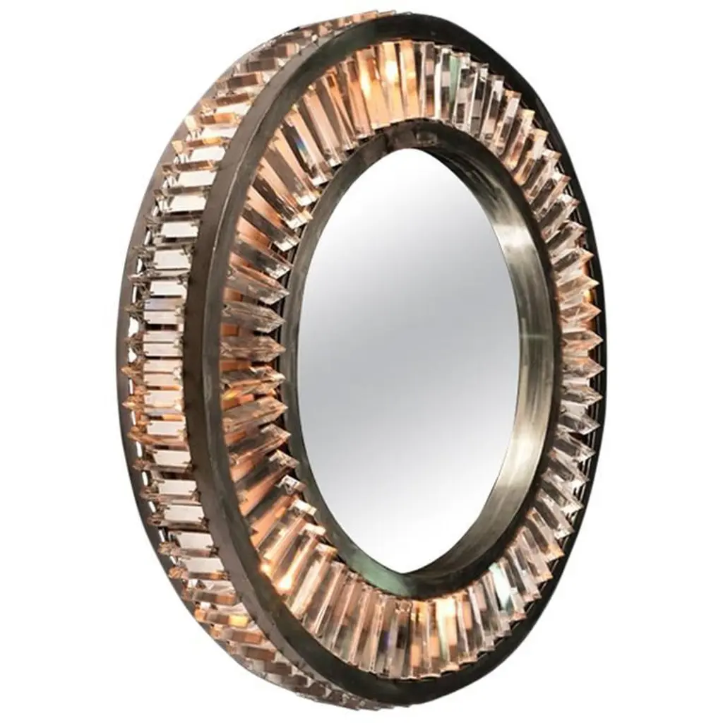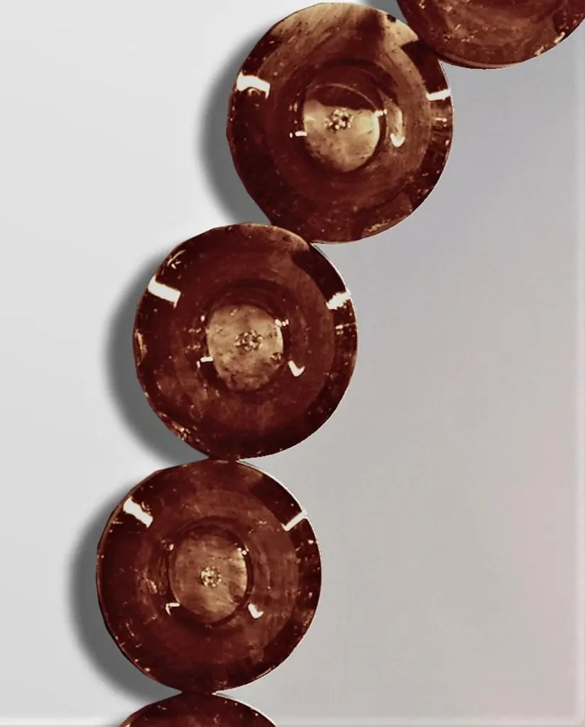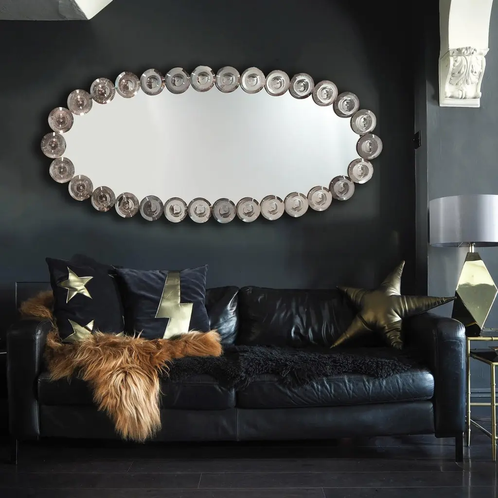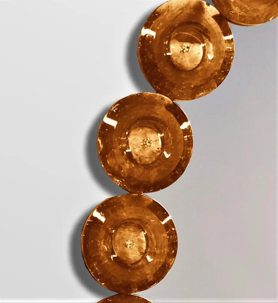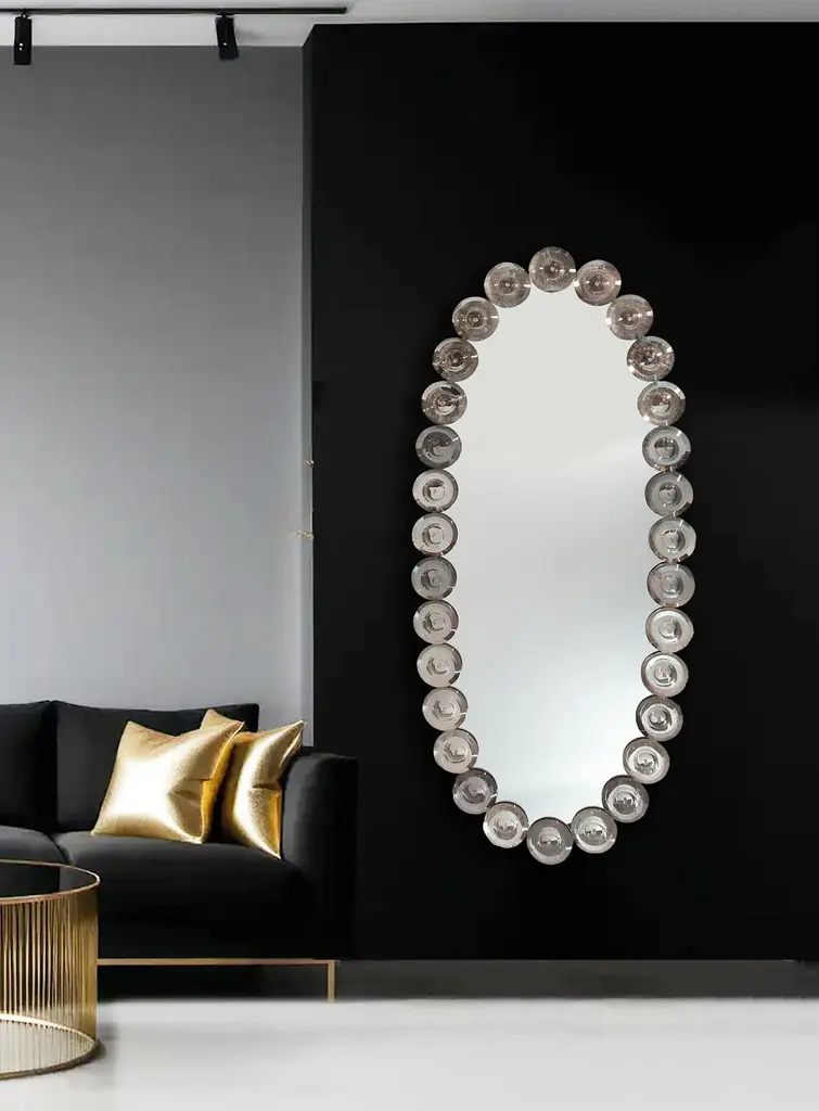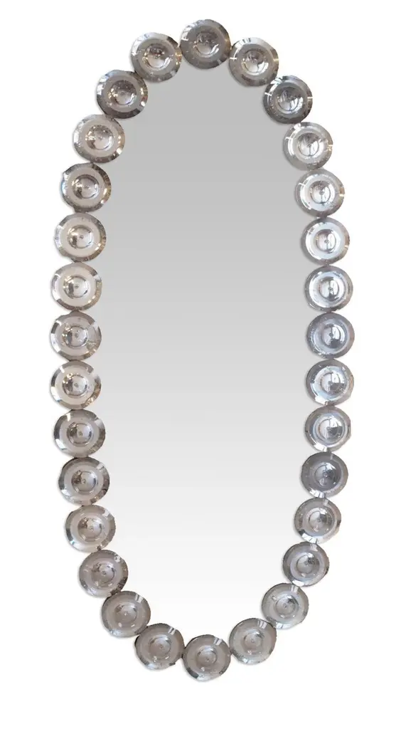 "Ovale Argento'"Specchio in vetro di Murano in stile Contemporaneo della serie "Dischi".La cornice è composta da 30 dischi in vetro massiccio di colore Argento bisellati, durante la produzione del disco in vetreria, viene inserita dell'aria all'interno per creare un effetto di tante piccole bolle imperfette,tutto lavorato a mano. Ogni blocco di questa cornice viene poi argentato a mano con argento puro per donare una brillantezza unica, tutto realizzato artigianalmente nell'isola di Murano, altro esempio di specchio contemporaneo realizzato dai Fratelli Tosi, azienda che da anni produce specchi di tutti gli stili nell' Isola di Murano, ancora oggi seguendo le tecniche vetrarie dei nostri antenati.Lo specchio a figura intera è personalizzabile nelle misure e nei colori con la possibilità di essere appeso sia in verticale che in orizzontale.