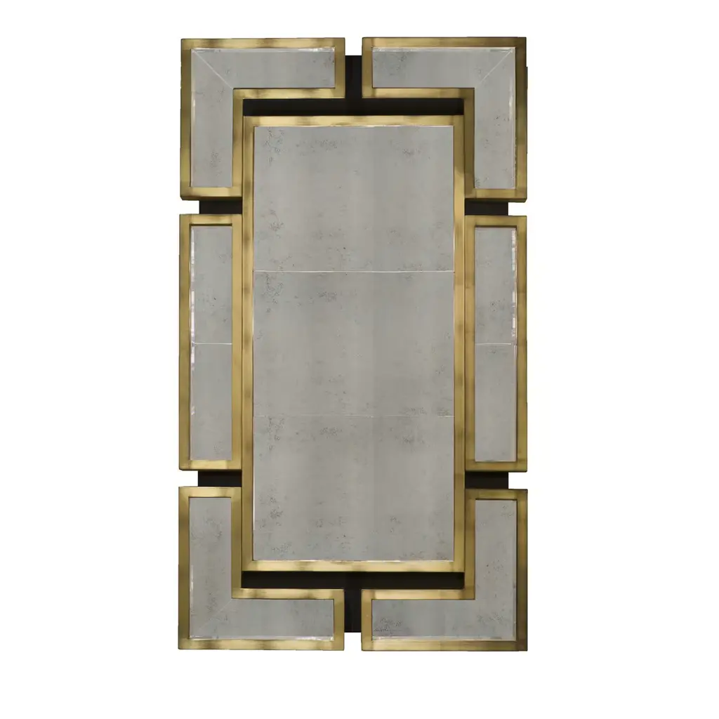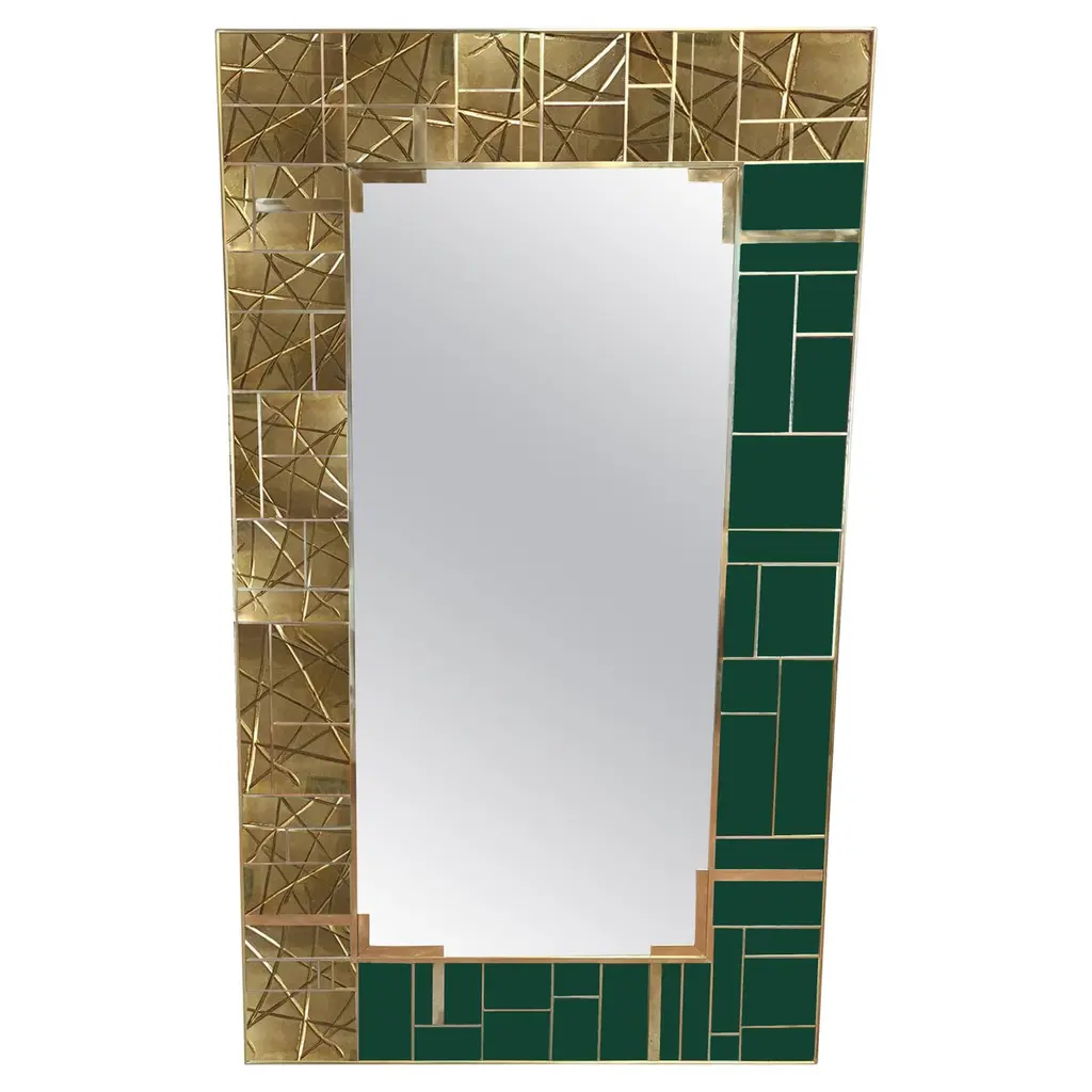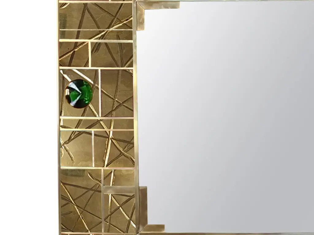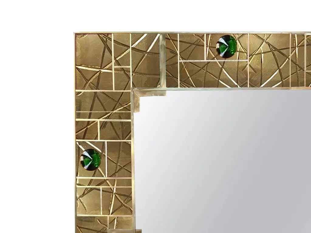 Discover the Spectacular Striped Brass Wall Mirror, a striking piece that combines modern style with craftsmanship. This square mirror is made of birch and brass, with meticulous handcrafting and techniques that highlight its unique striped design. The mirror is embellished with six green Murano glass jewels, each in the shape of a ferrule, adding a touch of elegance and enhancing its contemporary appeal. Handcrafted in Italy, this mirror reflects quality and sophistication, making it a standout addition to any space. With its intricate details and luxurious materials, this wall mirror is not only a functional piece but also an eye-catching work of art. Perfect for those who appreciate fine craftsmanship and modern design, this mirror invites research and admiration.