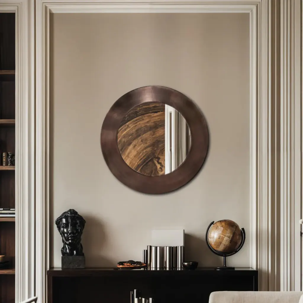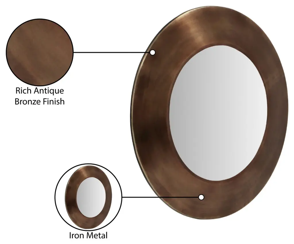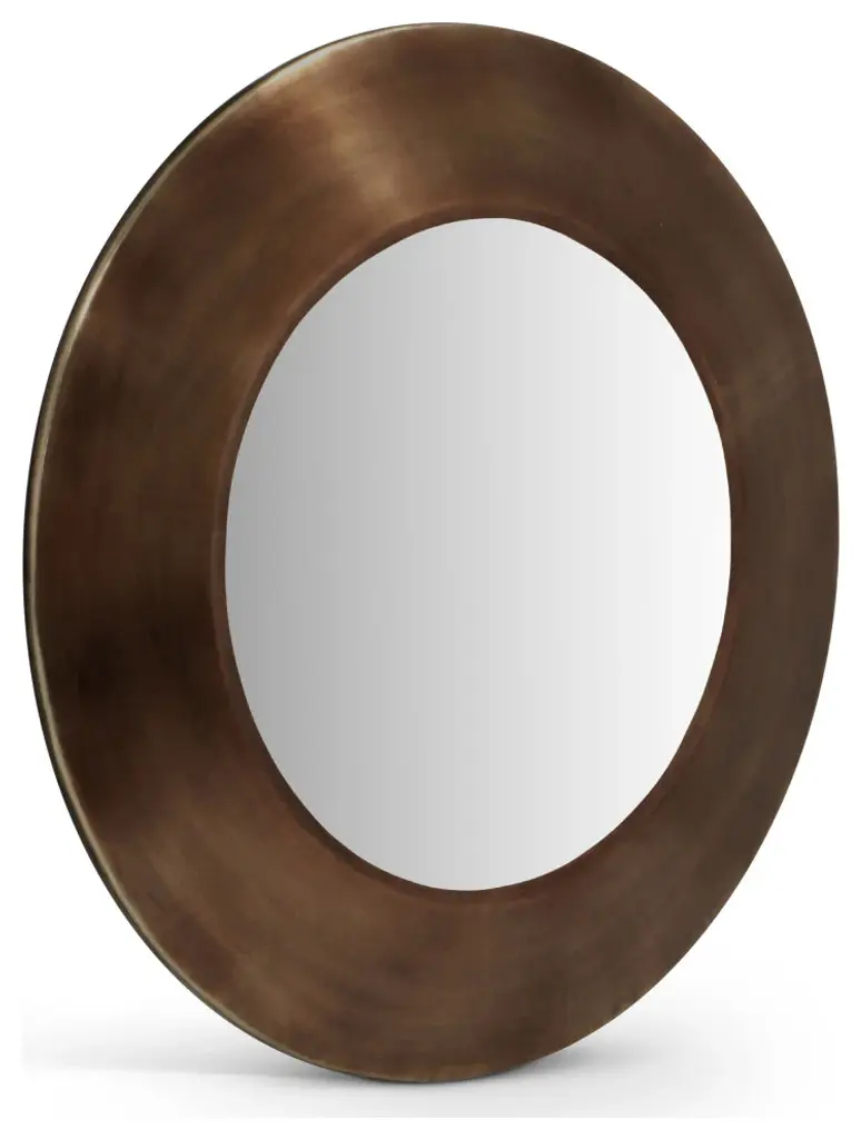 The Sphere brown iron mirror is the perfect blend of industrial chic and modern design. Its raw, rich antique bronze iron frame and circular shape add a touch of edgy elegance to any room. A simple, yet striking design and durable frame make it a versatile and long-lasting piece.Overall Product Dimensions: 24" W x 2" D x 24" HRich Antique Bronze FinishIron MetalContemporary Design