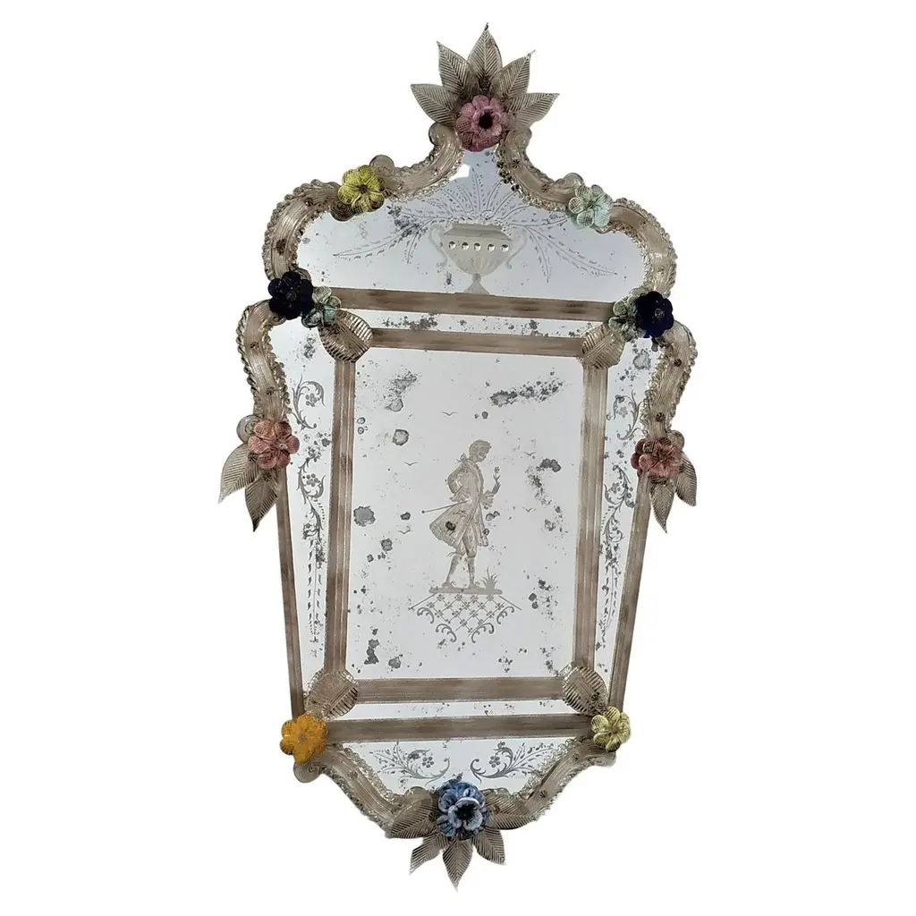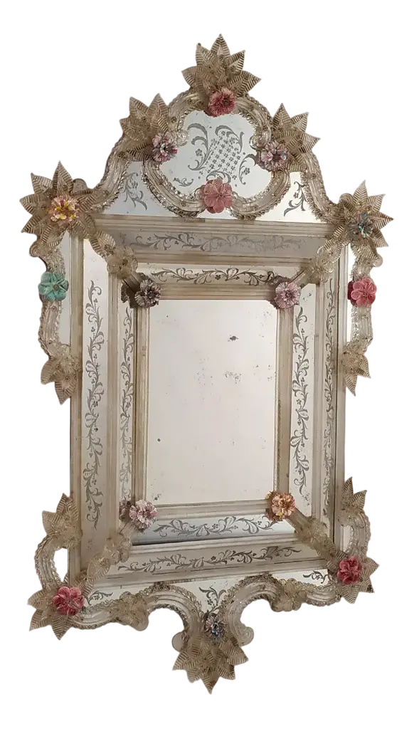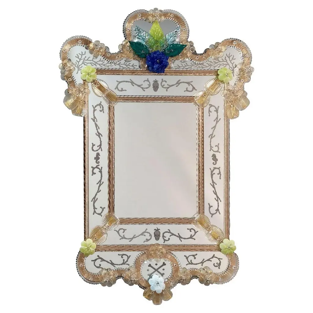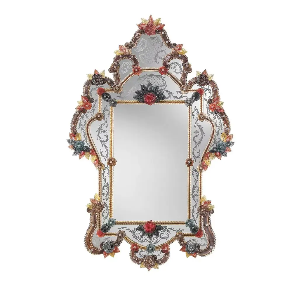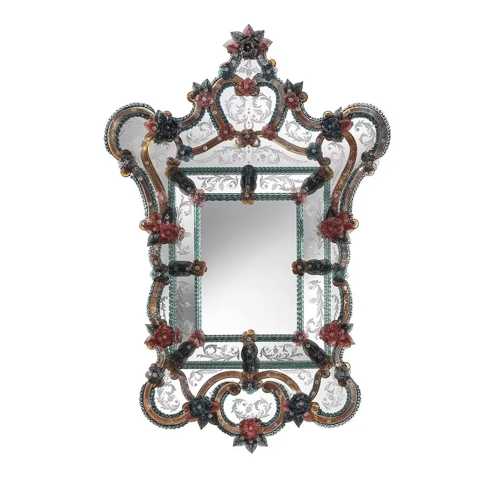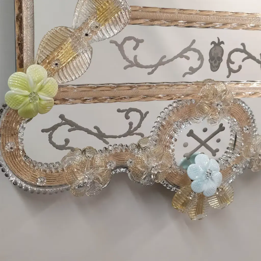 Spring is a pop-art reinterpretation of a traditional Murano glass mirror. Featuring the bright color palette of Bradley Theodore's childhood in the Caribbean islands of Turks & Caicos, Spring features classic glass-blown Murano rosettes and leaves, and is fully hand-engraved in Theodore's motifs like corals, seahorses, starfish, skulls, and bones. This mirror is made in a limited edition of one piece.
