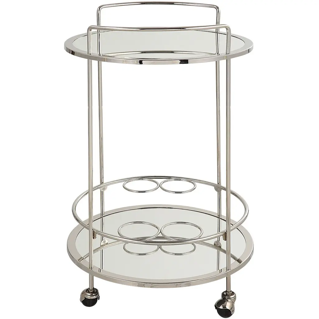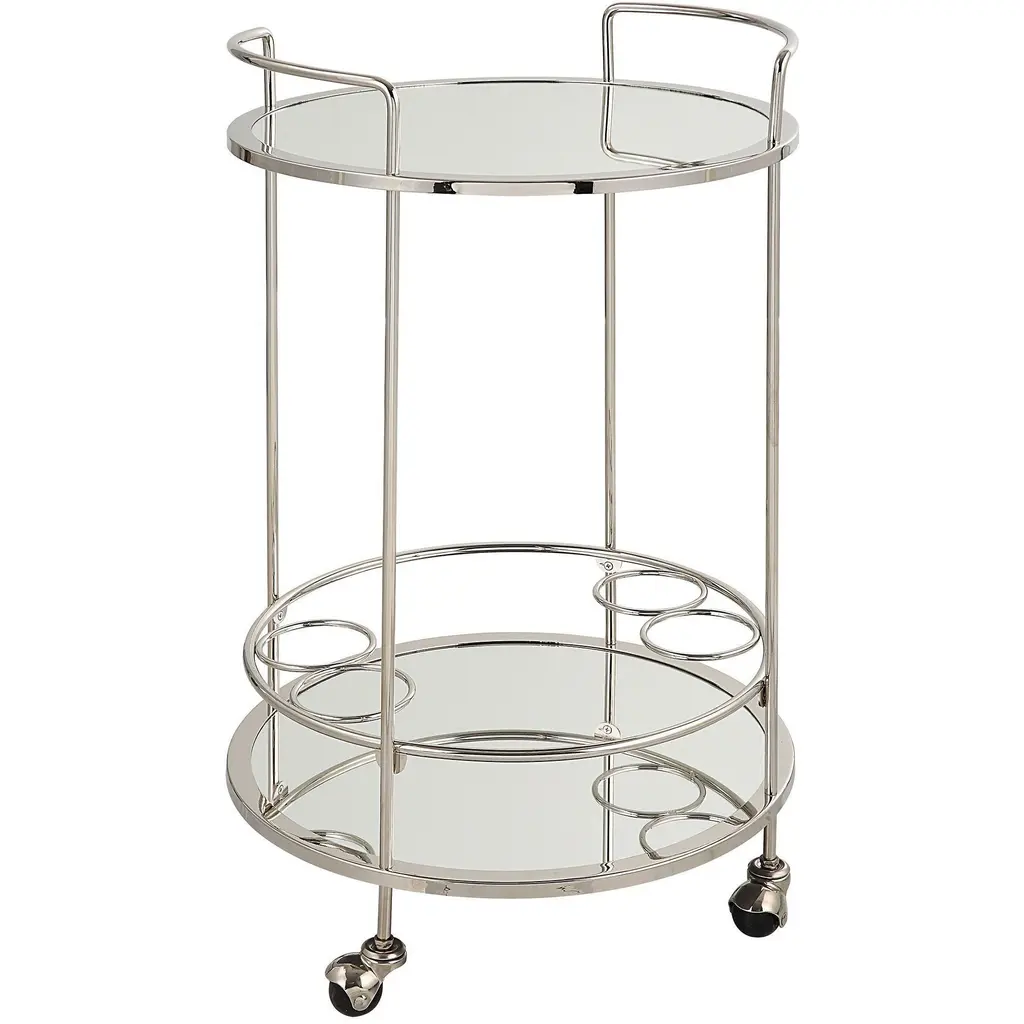 The Spritz Bar Cart Rolls Wherever The Party Goes! The Metal Cart Is Finished In Polished Chrome With Dual Mirrored Shelves For Optimal Storage And Display. The Petite Round Frame Sits Atop Rolling Casters, Enabling Easy Placement In Any Living Or Dining Space.