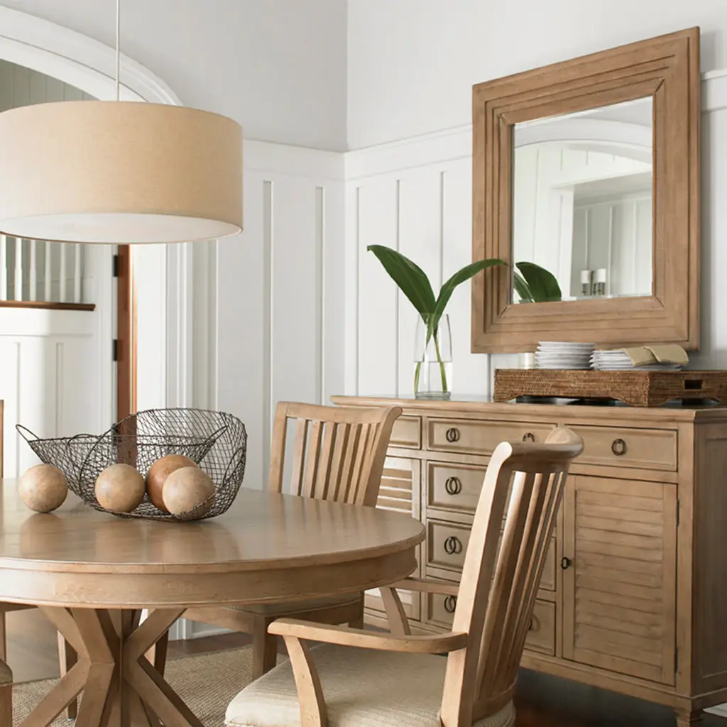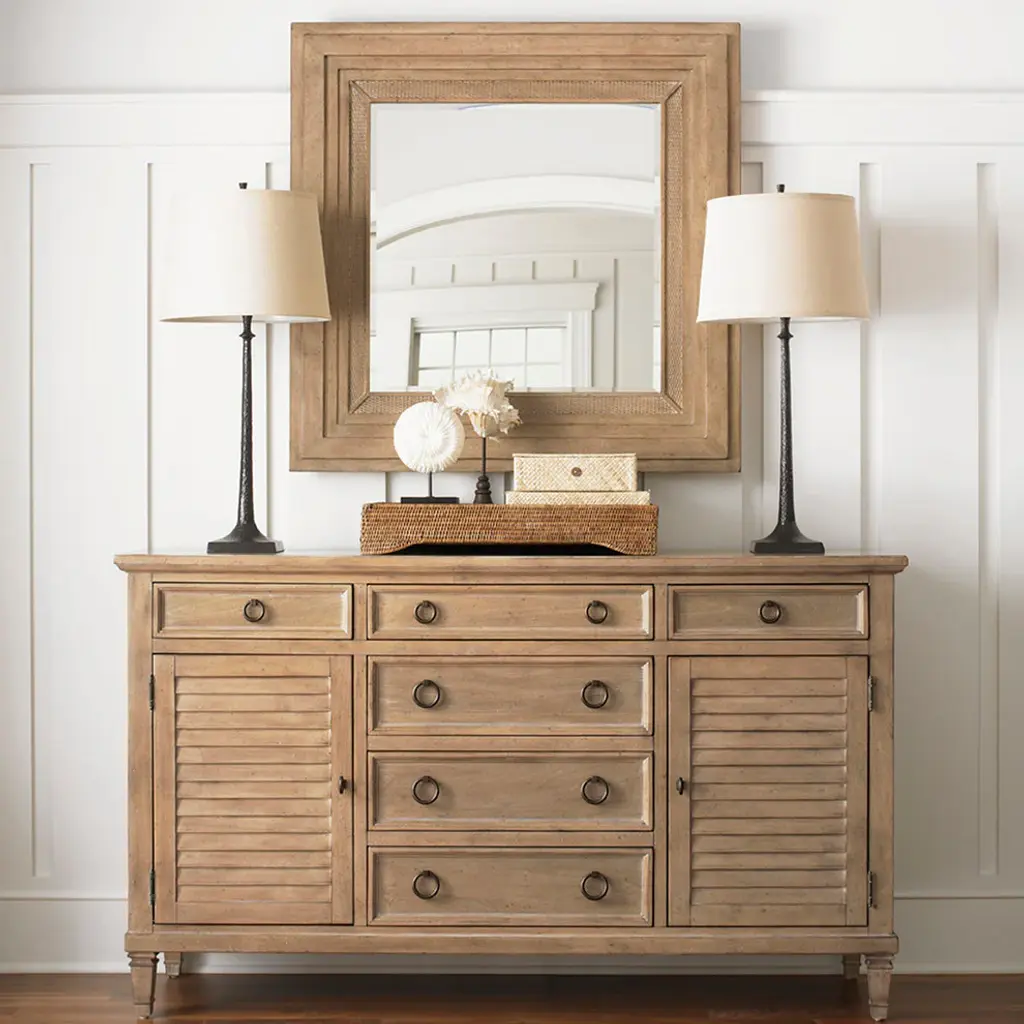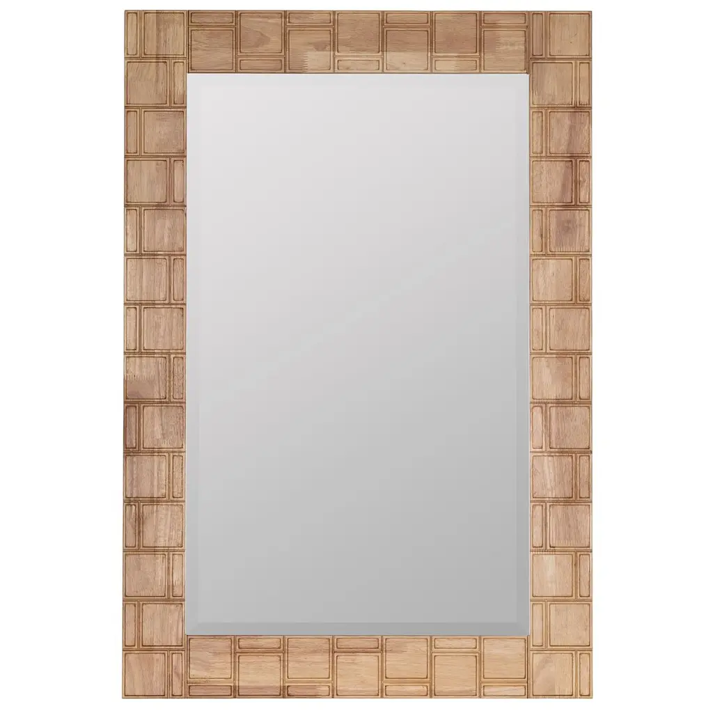 You might find yourself stealing a glance more often than usual just to admire the beauty of this mirror. The stepped frame gives dimension to the interior mat of woven split rattan, then draws your eye to the beveled glass mirror.