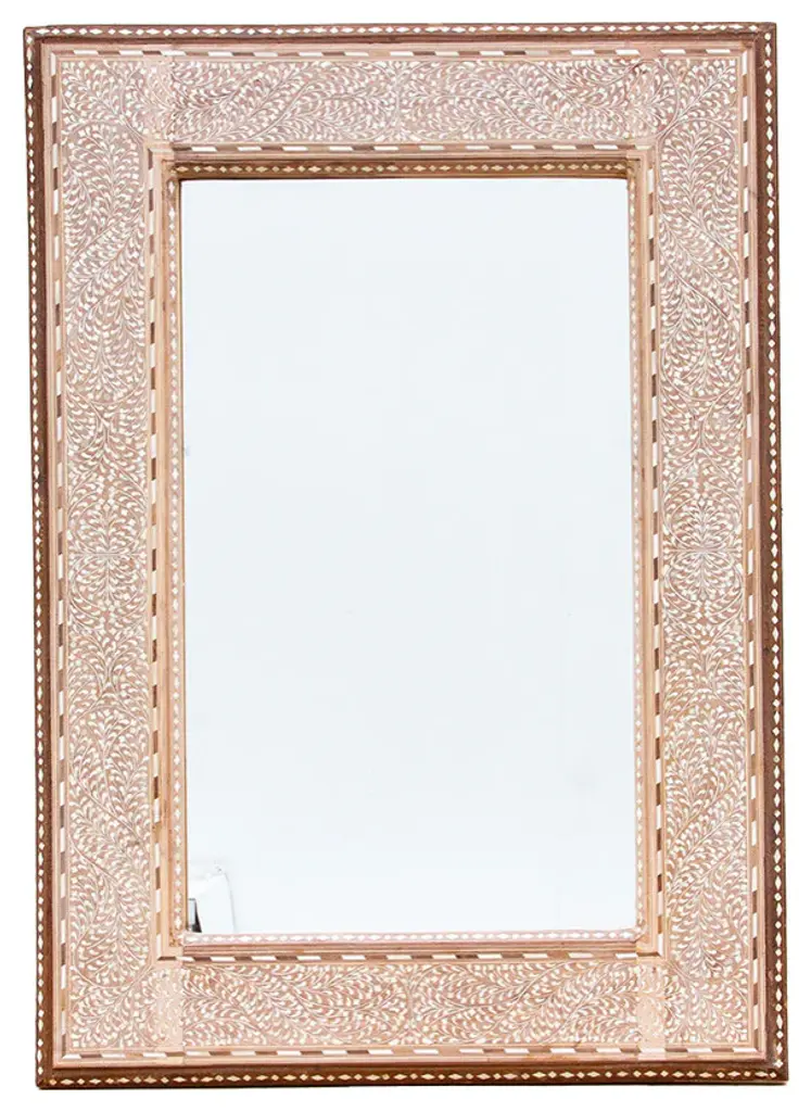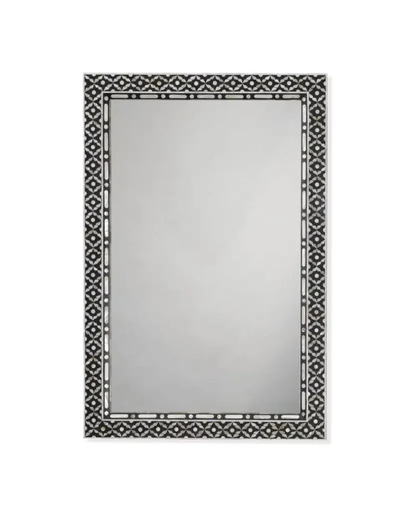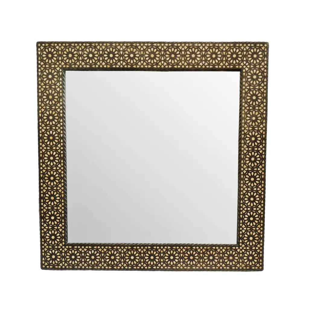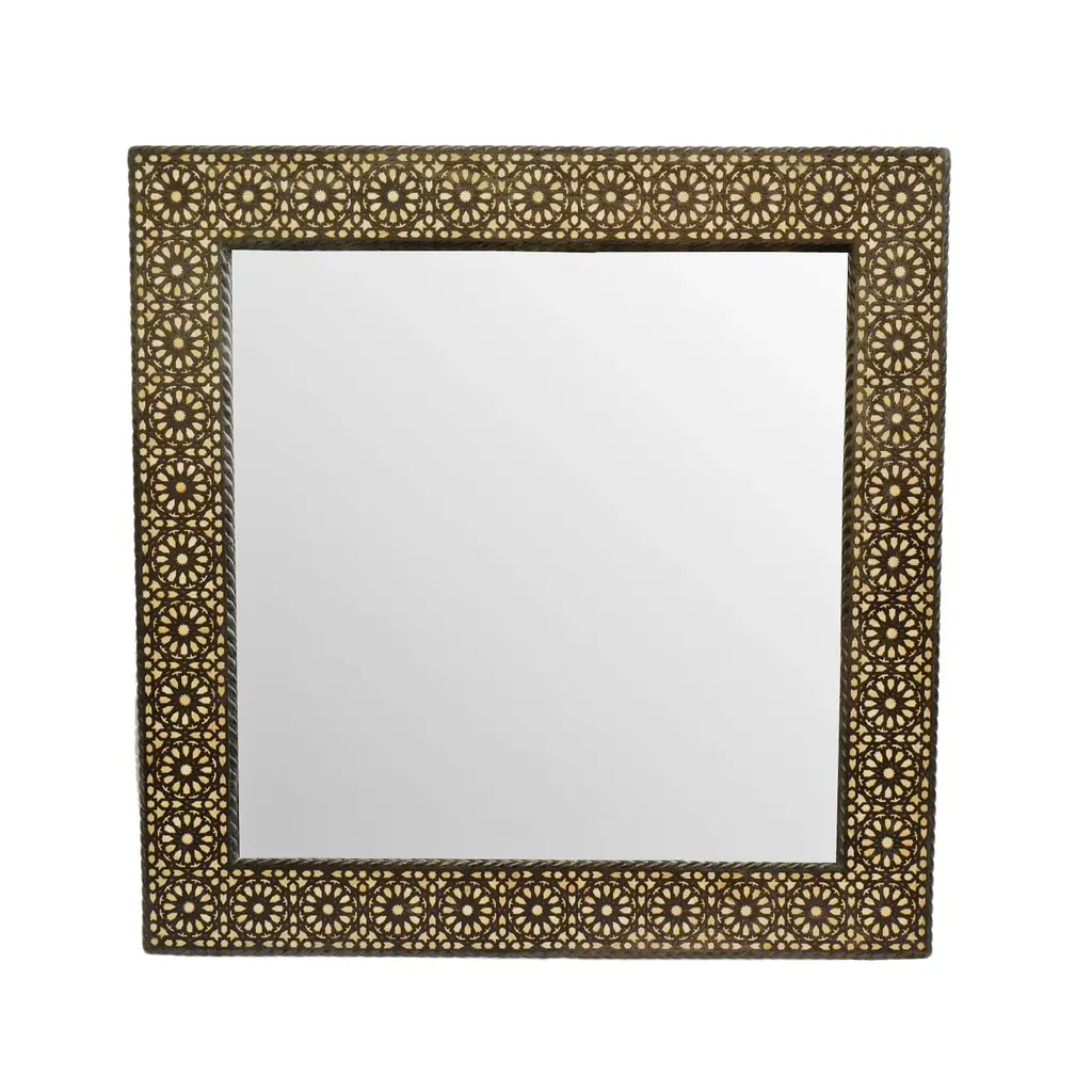 Beautiful square Moroccan wood inlay mirror frame with intricate contrasting black and raw wood patterns. Finished with a rope pattern edge.