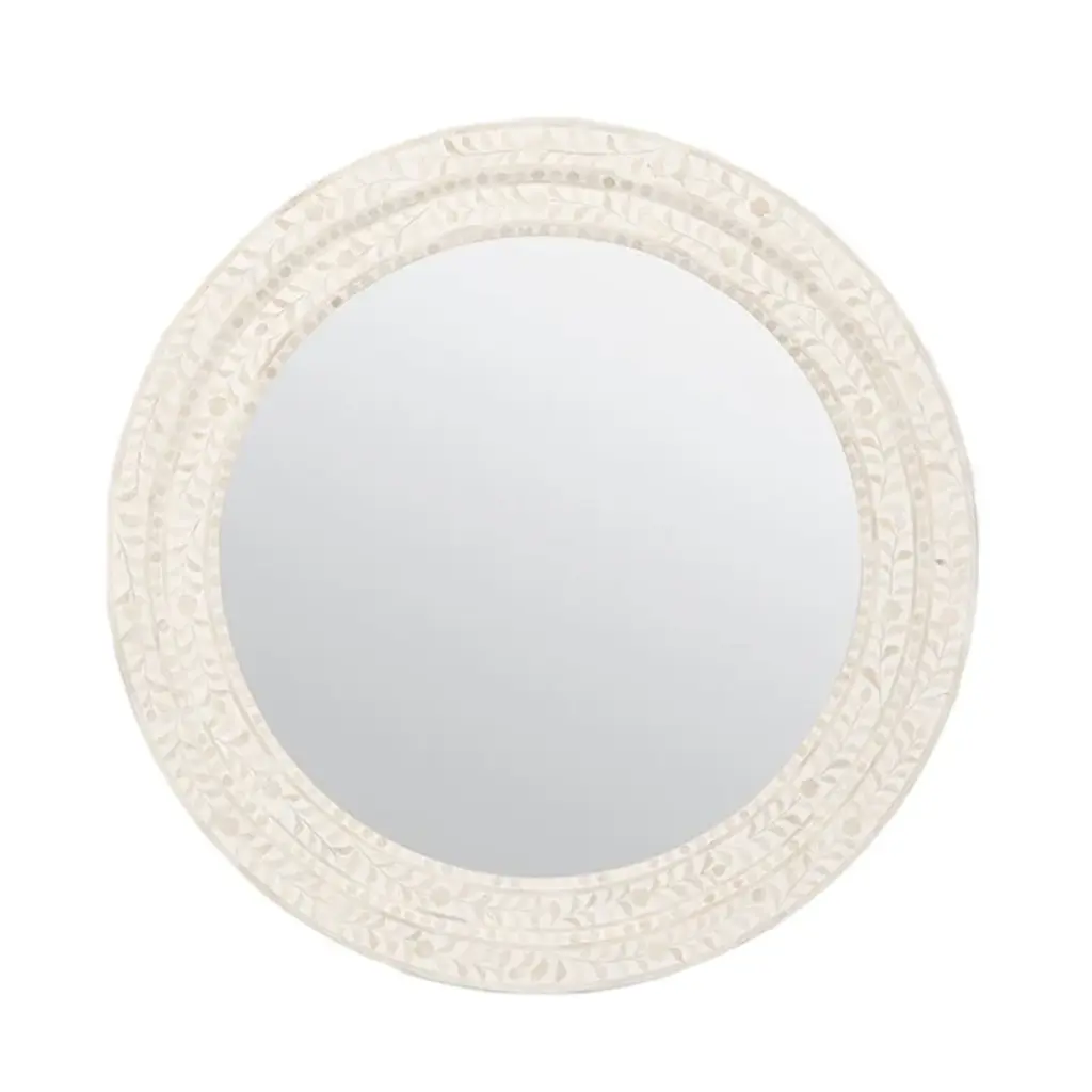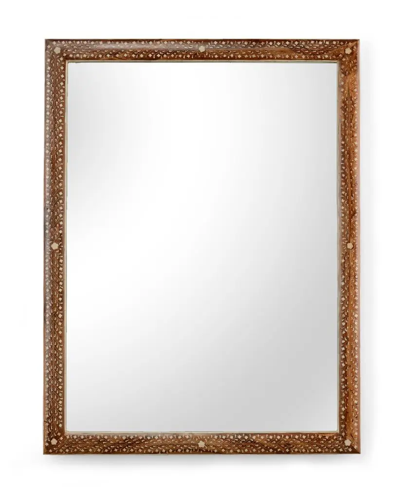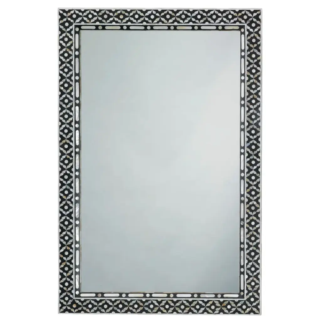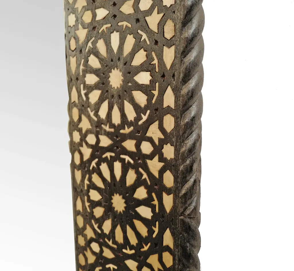 Beautiful square Moroccan wood inlay mirror frame with intricate contrasting black and raw wood patterns. Finished with a rope pattern edge.