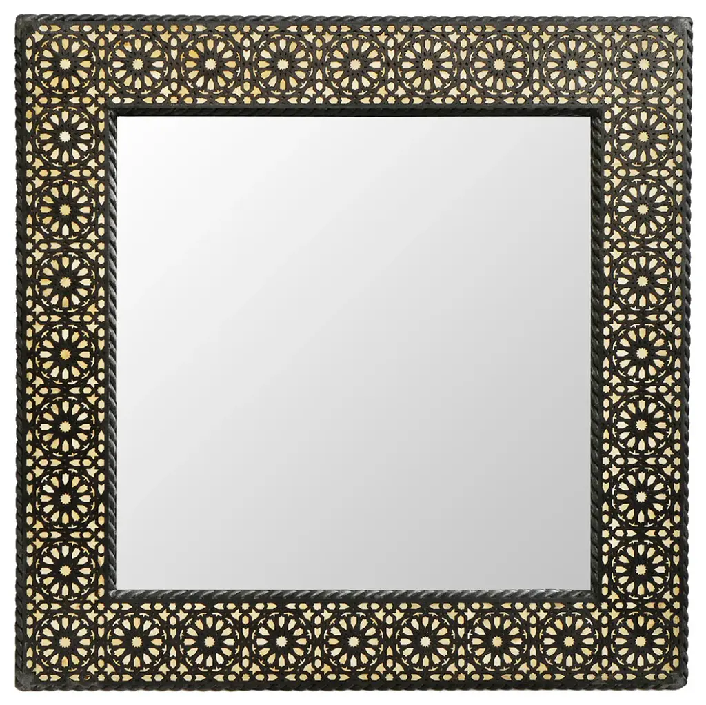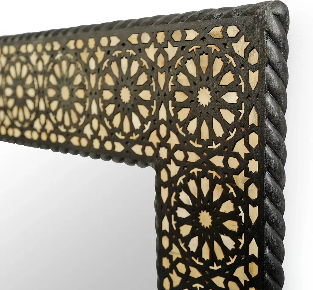 Beautiful square Moroccan wood inlay mirror frame with intricate contrasting black and raw wood patterns. Finished with a rope pattern edge. Each may vary in raw wood tones and natural imperfections. This item is non-returnable - all sales are final.
