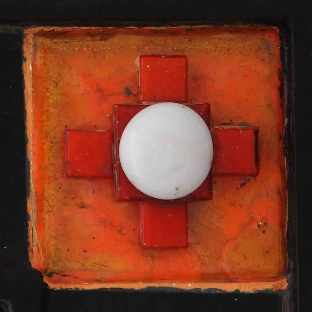 Bright orange and red are tempered by black and white on a wall mirror from India. Featuring crosses on each corner, the mirror frame is handcrafted of ceramic tiles on wood by the talented Lalit Sakhuja. The mirror features a hook on the back for hanging.
