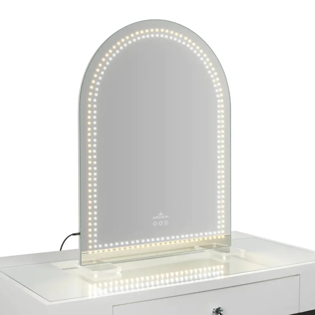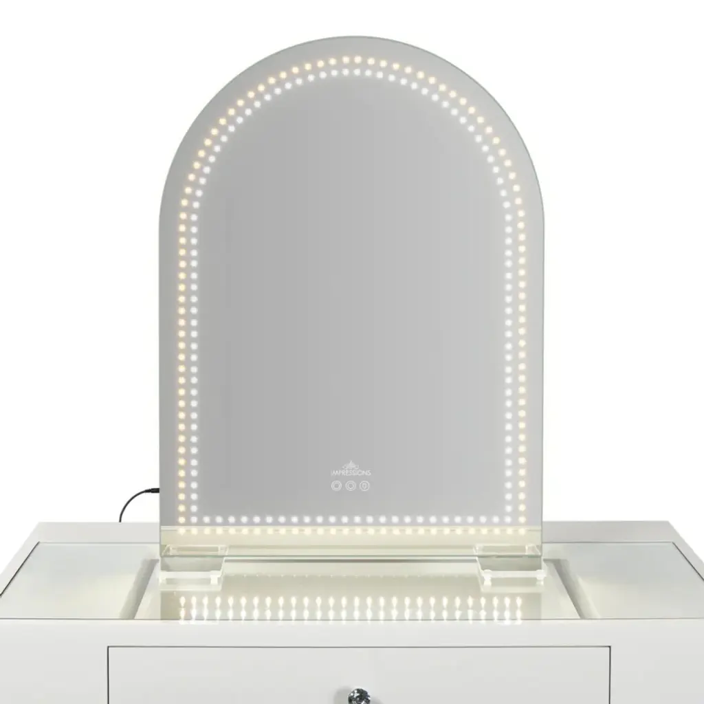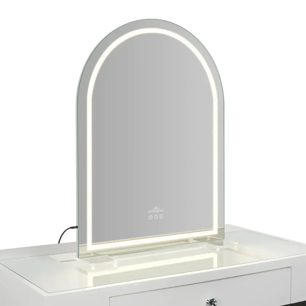 Introducing Impressions Vanitys Stage Lite Collection: ultra slim, lightweight LED mirrors offering mesmerizing new LED dot formations or sleek strip lights. With adjustable brightness, color temperature, and more variety than you will know what to do with, step into the spotlight and redefine your space whether you prefer straight-edge or love a good curve.Features:Soft Touch Sensors Professional makeup studio lighting at your fingertips with built in ultra bright LED lights 3 Dimmable Light Temperatures lets you customize your application in any lighting environment. Cool White, Natural, Warm Stage Lite is super slim and its sturdy aluminum backing allows for easy movement 2 in 1 Design: Choose between using the removable acrylic leg stands or built-in wall anchors for displaying on either your vanity or wall