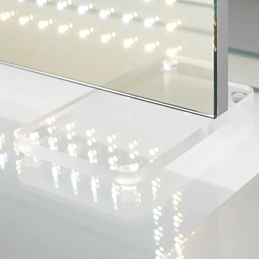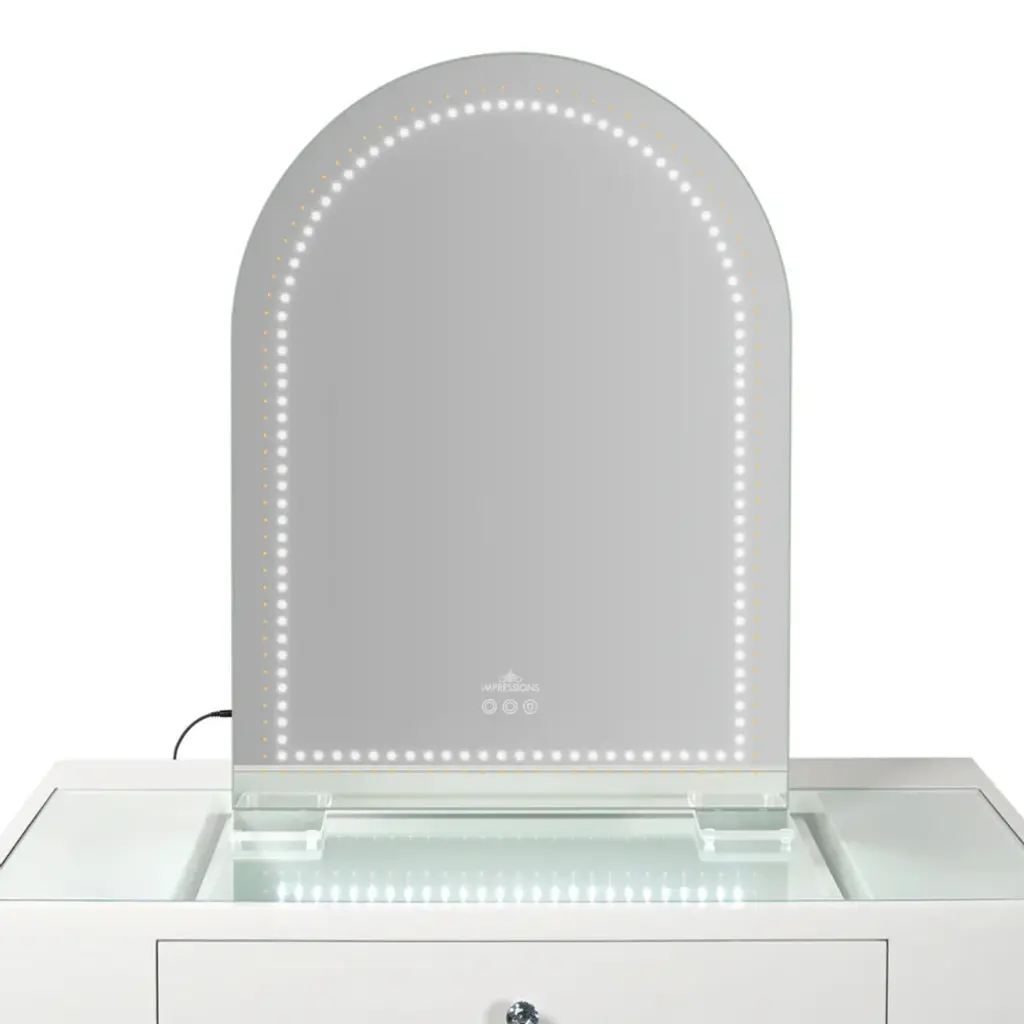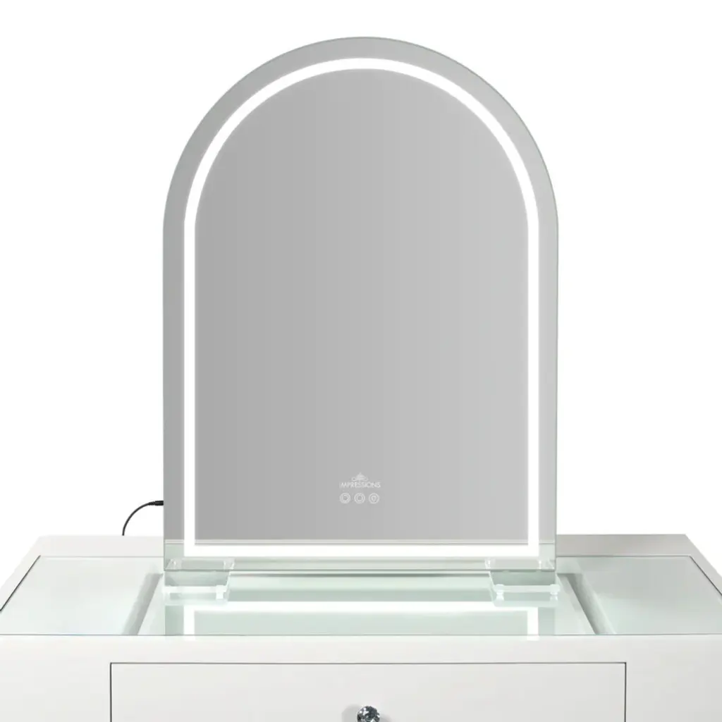 Introducing Impressions Vanitys Stage Lite Collection: ultra slim, lightweight LED mirrors offering mesmerizing new LED dot formations or sleek strip lights. With adjustable brightness, color temperature, and more variety than you will know what to do with, step into the spotlight and redefine your space whether you prefer straight-edge or love a good curve.Features:Soft Touch Sensors Professional makeup studio lighting at your fingertips with built in ultra bright LED lights 3 Dimmable Light Temperatures lets you customize your application in any lighting environment. Cool White, Natural, Warm Stage Lite is super slim and its sturdy aluminum backing allows for easy movement 2 in 1 Design: Choose between using the removable acrylic leg stands or built-in wall anchors for displaying on either your vanity or wall