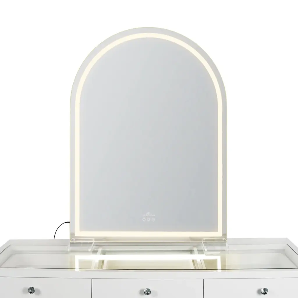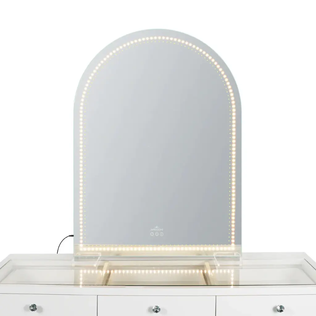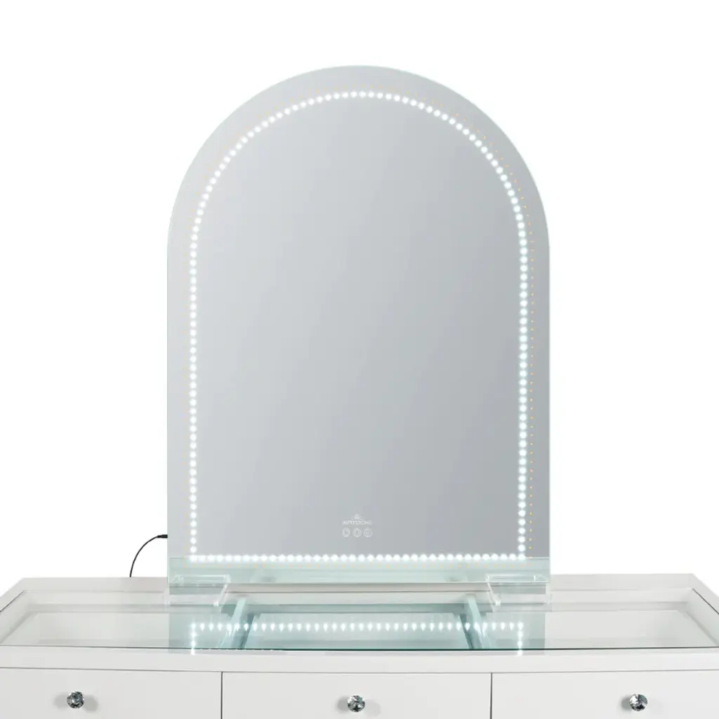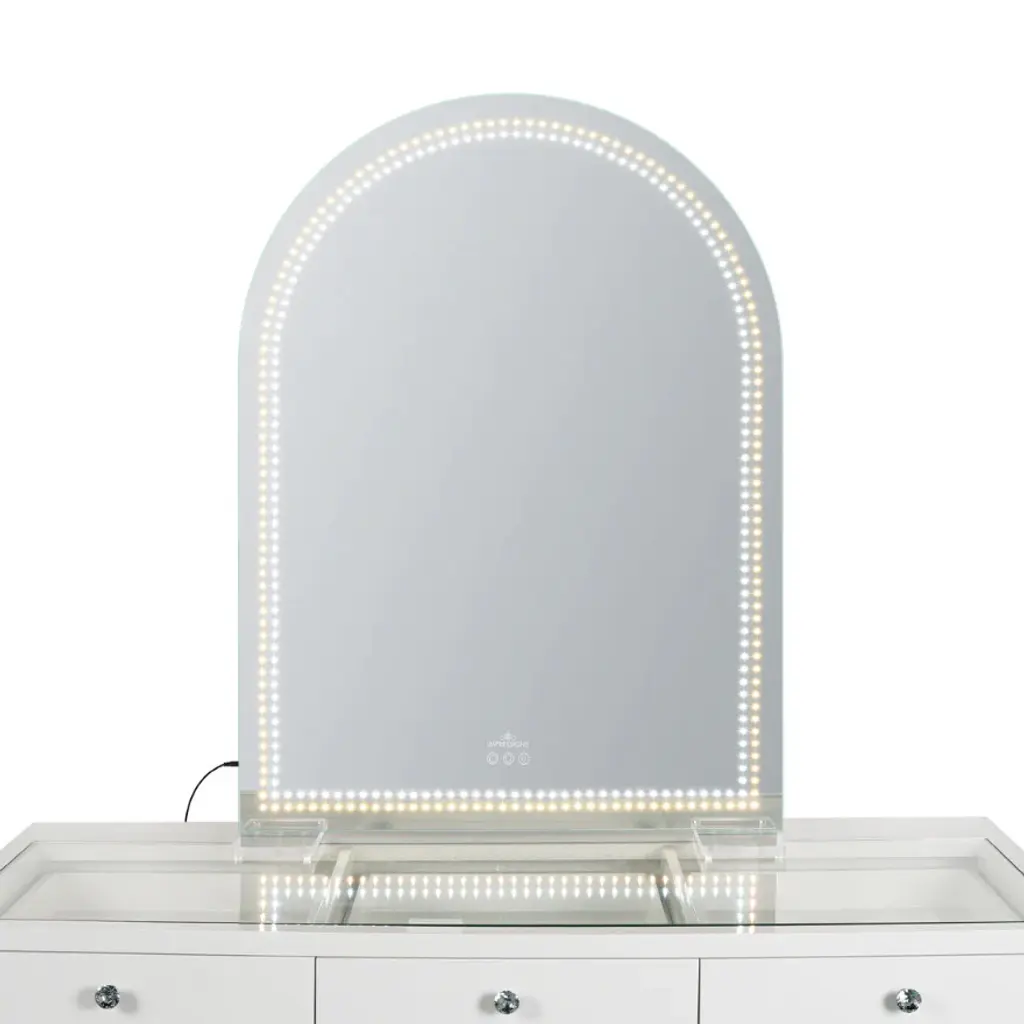Impressions Vanity introduces the Stage Lite Arch XL Vanity Makeup Mirror, providing a professional makeup experience. The Arch XL contemporary mirror for desk is more than simply a vanity mirror; it''s a showpiece for your bedroom or bathroom. Professional makeup studio lighting will always be at your disposal thanks to its integrated, ultra-bright dotted LED mirror lights. Three dimmable light temperatures Cool White, Natural, and Warm"”allow you to personalize your lighting experience and guarantee that you get the look you want in every setting. The Stage Lite Arch XL round vanity mirror has an ultra slim design with a solid aluminum backing, allowing for effortless mobility and a variety of display options. The base dimension of this mirror is 43.3 in x 31.5 in. x 1.14 in. which is suitable for place to set this stand up mirror. This vanity mirrors desk adjusts to your needs, whether you prefer to use the integrated wall anchors or the detachable acrylic leg stands. Its easy-to-clean surface makes maintenance simple, and its soft touch sensors provide convenient operation. The Stage Lite Arch XL Wall Mountable light up vanity mirror will elevate your area and change the way you approach beauty products.Features:VERSATILE DESIGN: Lightweight and ultra slim vanity makeup mirror with lights comes with a removable stand that converts easily into a wall mounted option for versatile placement, providing flexibility in designPROFESSIONAL LIGHTING: Impressions Vanity Stage Lite Pro''s LED vanity mirror for your desk elevates cosmetics, giving you a pristine studio look for precision and glamour in your beauty routineTRI TONE LIGHT: Warm, Natural, and Cold White tones allow you to create a unique makeup look. By enabling you to set the perfect lighting conditions, the dotted LED desk mirror can improve your cosmetic routineSOFT TOUCH SENSOR : With the smooth touch sensor screen on our desk mirror with lights, you can easily adjust the brightness levels for flawless skincare routine detailingCUSTOMER SATISFACTION: You will receive premium after sales service through our shipping, return, and refund policy. If you have any issues with this LED mirror with stand, please contact us via our seller storefront. Your pleasure is important to us