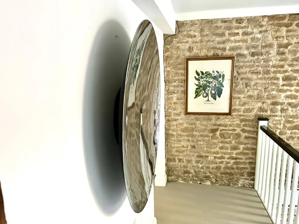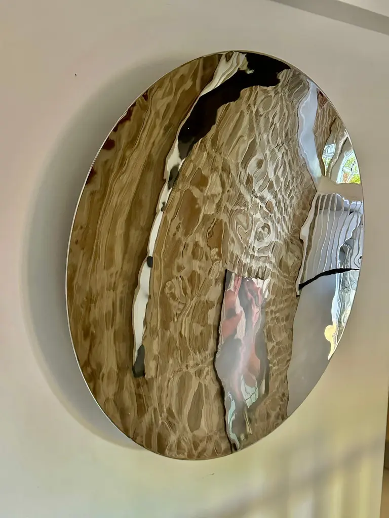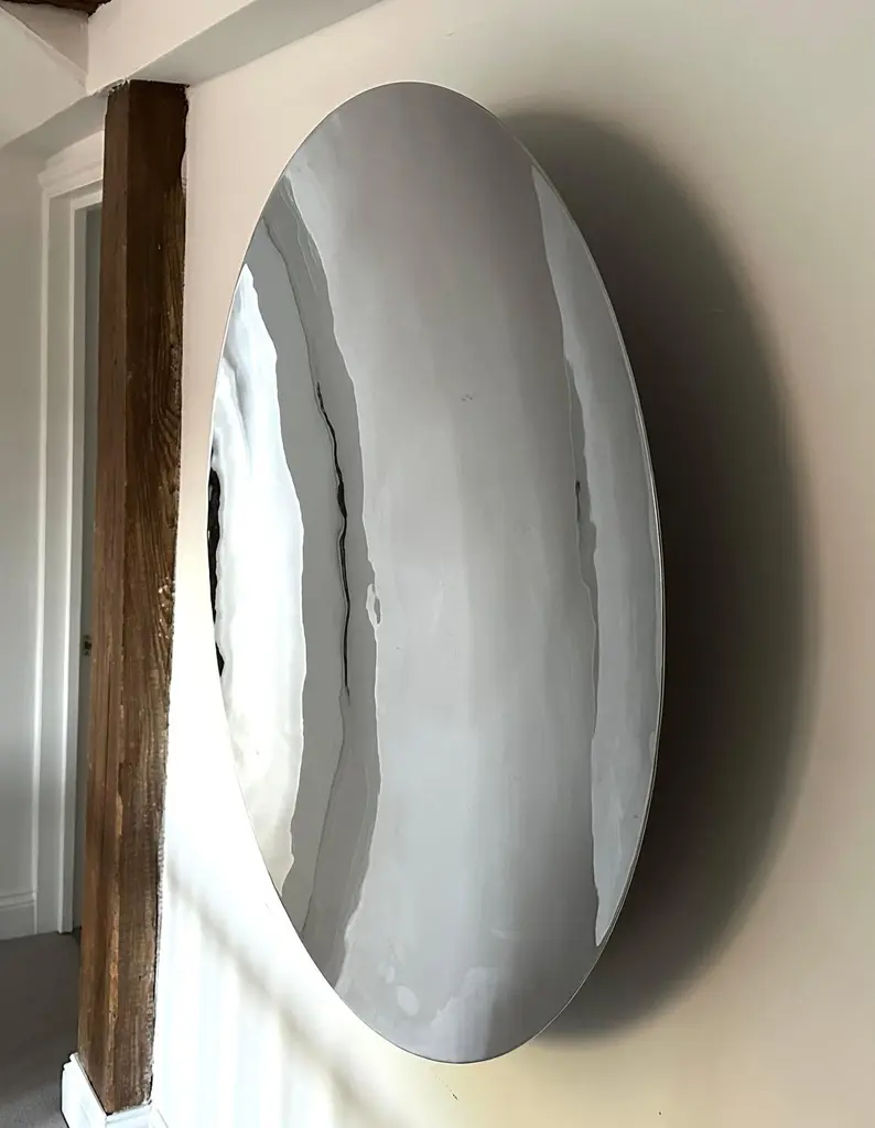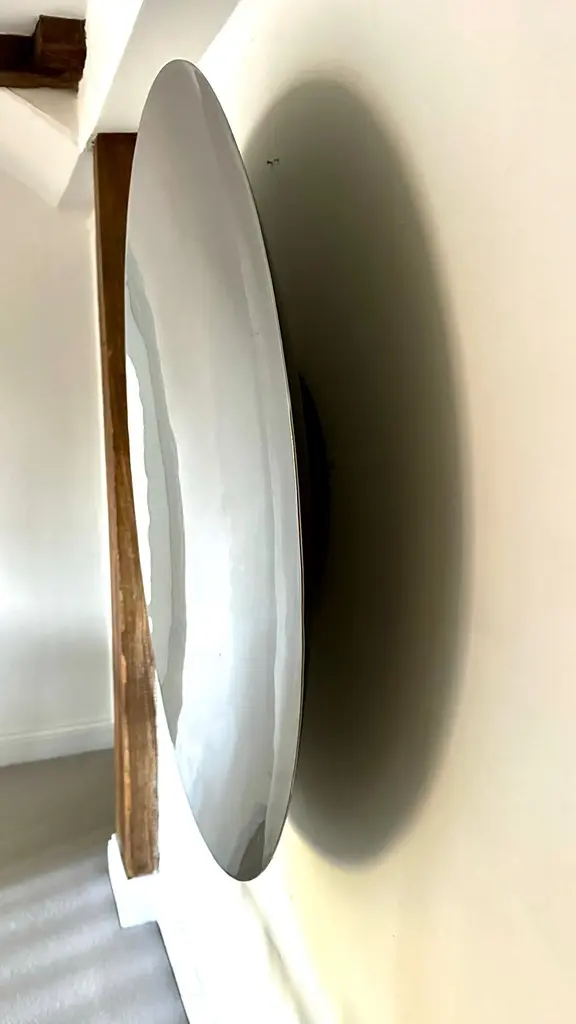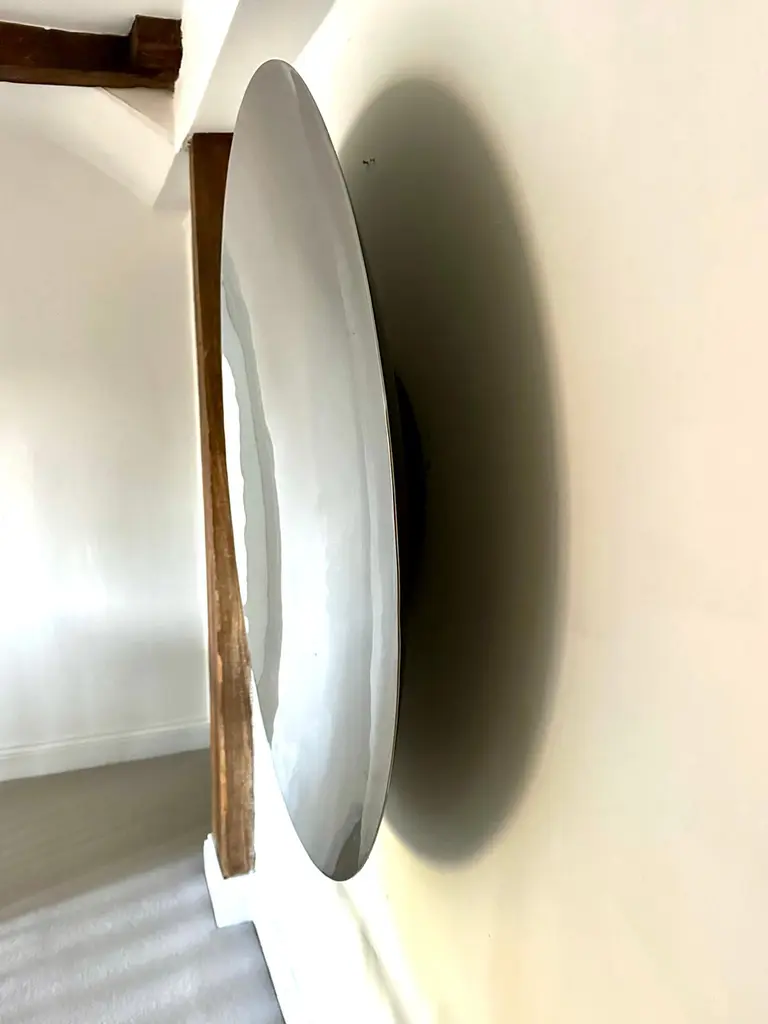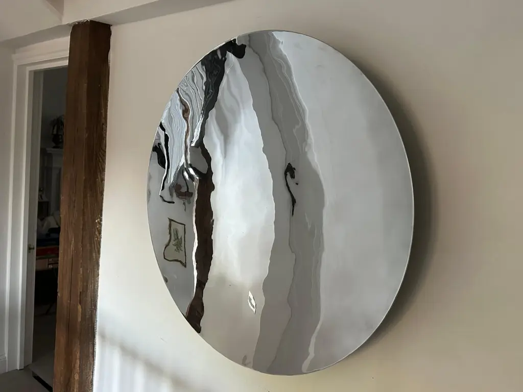The concave mirror itself creates unique bright reflections which in turn creates the illusion of space. Please note that the image is upside down.The mirror is fabricated out of 3mm 304 stainless steel. It's formed and then polished. after extensive polishing the mirror is electroplated and polished once again. The mirrors create focal points in any room and help create that "wow' factor.We also offer this mirror in different diameters up to and including 160 cms /63"Very easy to install and fixings included.Please note- due to this mirror being polished by hand there will be slight imperfections/ distortions in the reflections as you can see in the photographs.