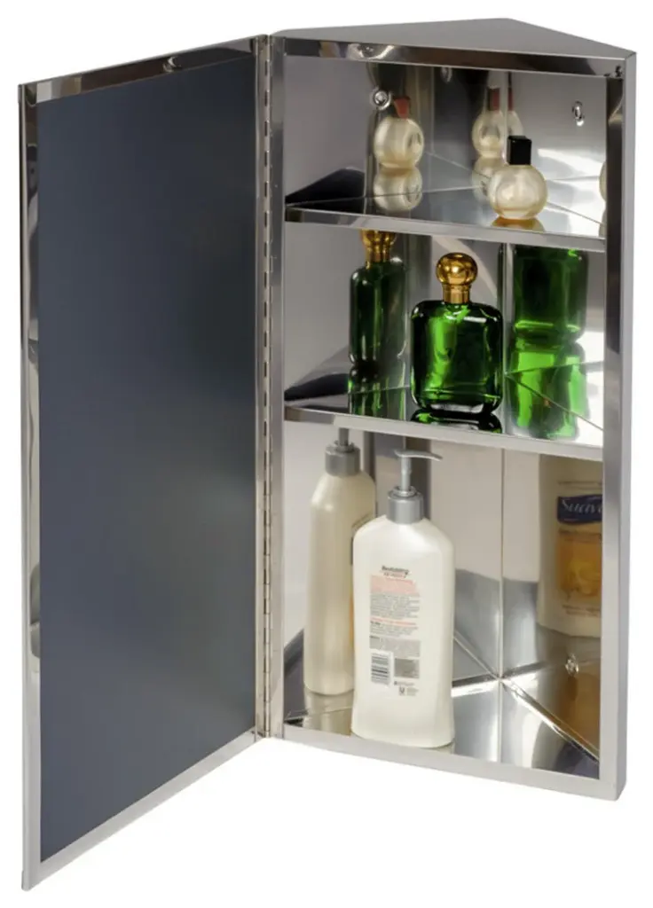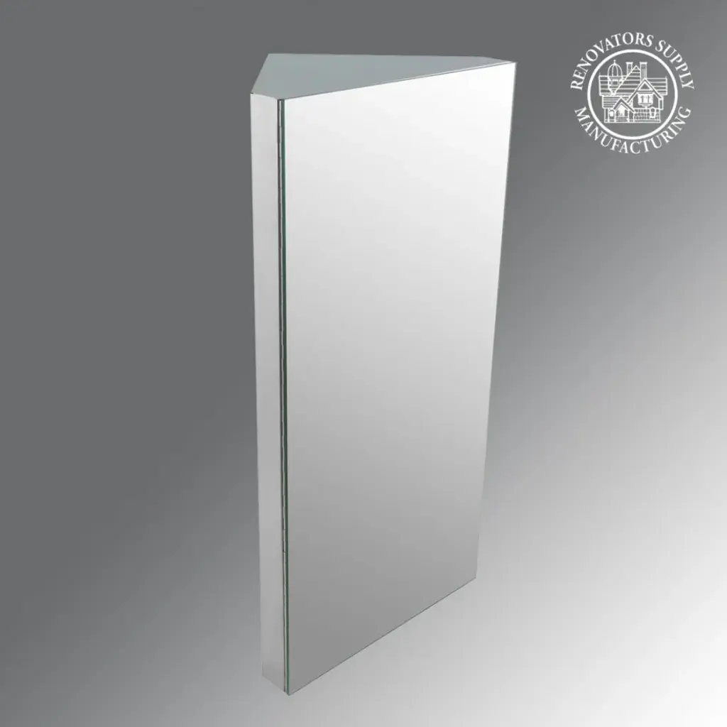 Item 15444 INFINITY CORNER WALL MOUNT MEDICINE CABINET FOR BATHROOMThis elegant corner medicine cabinet door opens up to three interior shelves. It is manufactured out of 100% superior stainless steel material. It can be mounted on any corner wall - Opens from RIGHT to LEFT!FEATURES• Manufactured of 100% Stainless Steel inside out• Corner Wall Mount Medicine Cabinet opens door from Right to Left• Consists of three shelves• Extra door strength due to Full-length piano hinge• Measures 23.62 In Height x 11.87 In Width x 6.87 In Projection• Installation Mounting hardware is included• Magnetic smooth open mechanism - Effortless and Quiet!• Features polished stainless steel finishMAXIMIZE STORAGE IN STYLEKeep your home bathroom space clutter-free by placing frequently used items conveniently at your fingertips. Wipe the surface of the glass and stainless steel components with a water dampened cloth and dry thoroughly to keep the cabinet like trendy. Its inspired from Industrial style stainless steel appointmentsBUY WITH CONFIDENCEThese are carefully packed to avoid any scratches during the transition. Renovators Supply Manufacturing offers you great value products for your money and a perfect way to spend wisely. We also provide 30 days guarantee with no fee.