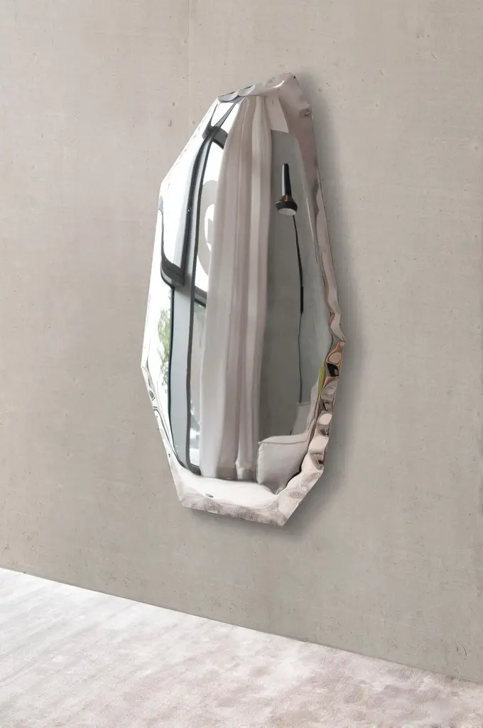 Stainless Steel C4 sculptural wall mirror by ZietaDimensions: D 6 x W 50 x H 100 cm Material: Stainless steel. Finish: Polished. Available in finishes: Stainless Steel, Deep Space Blue, Emerald, Saphire, Saphire/Emerald, Dark Matter, and Red Rubin. Also available in different sizes. Steel mirror in the form of a fragmented glass or rock – TAFLA C mirror by Zieta Studio is a modern uncompromising object. It is a wall sculpture that can be arranged in personalized groups to create artistic installations in private and public spaces.In the Transitions Collection, these unusual mirrors in various sizes and shapes are available in two colors: Red Rubin and Dark Matter. TAFLA C Red Rubin mirror resembles a piece of ruby, while the TAFLA C Dark Matter is like a gate to another dimension. This collection of mirrors will be a perfect decoration for a home with style or for a public space that aims to stand out in the crowd.The geometric TAFLA C comes in seven different sizes – it can be arranged in an artistic personalized composition or exposed on a wall as a single sculpture-like mirror.About Zieta: Zietas main goal is to deliver uniqueness and customization in design and construction while keeping the production, transport, and warehousing innovatively efficient.This is how they imagine the future world: Light, durable structures of customized applications produced on demand out of one-of-a-kind parts, yet efficiently.They use a computer-controlled production process. Customized pattern, customized form, customized function, one-of-a-kind product, and outstanding precision are what they deliver.You will find all of this philosophy reflected in the products. The research, they discover new possibilities, they play with forms and they deliver a beautiful, innovative, surprising outcome to people who love the design and who care about design development.They believe their work is a valuable contribution to the world of design not only by the unique beauty of the forms but most of all by opening ultra-innovative opportunities of forming and new paths for the world of the future. __