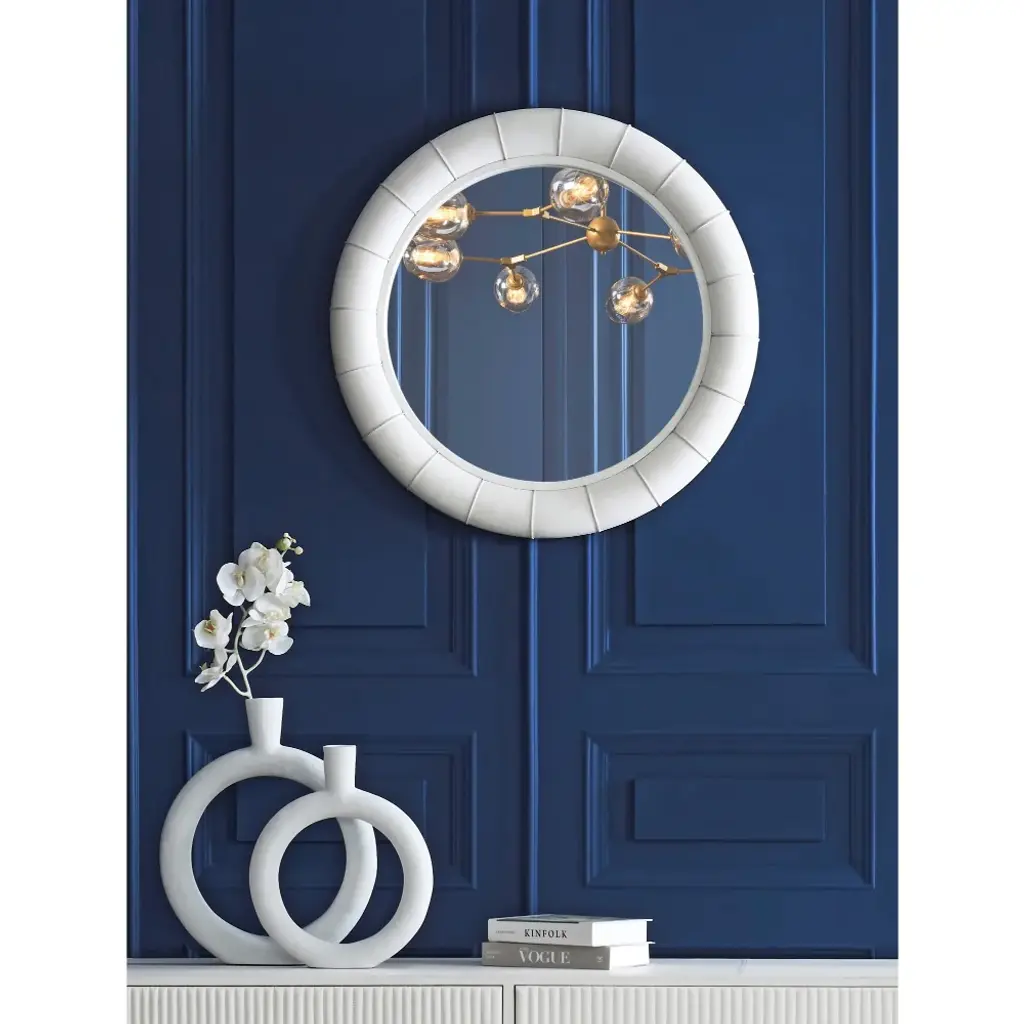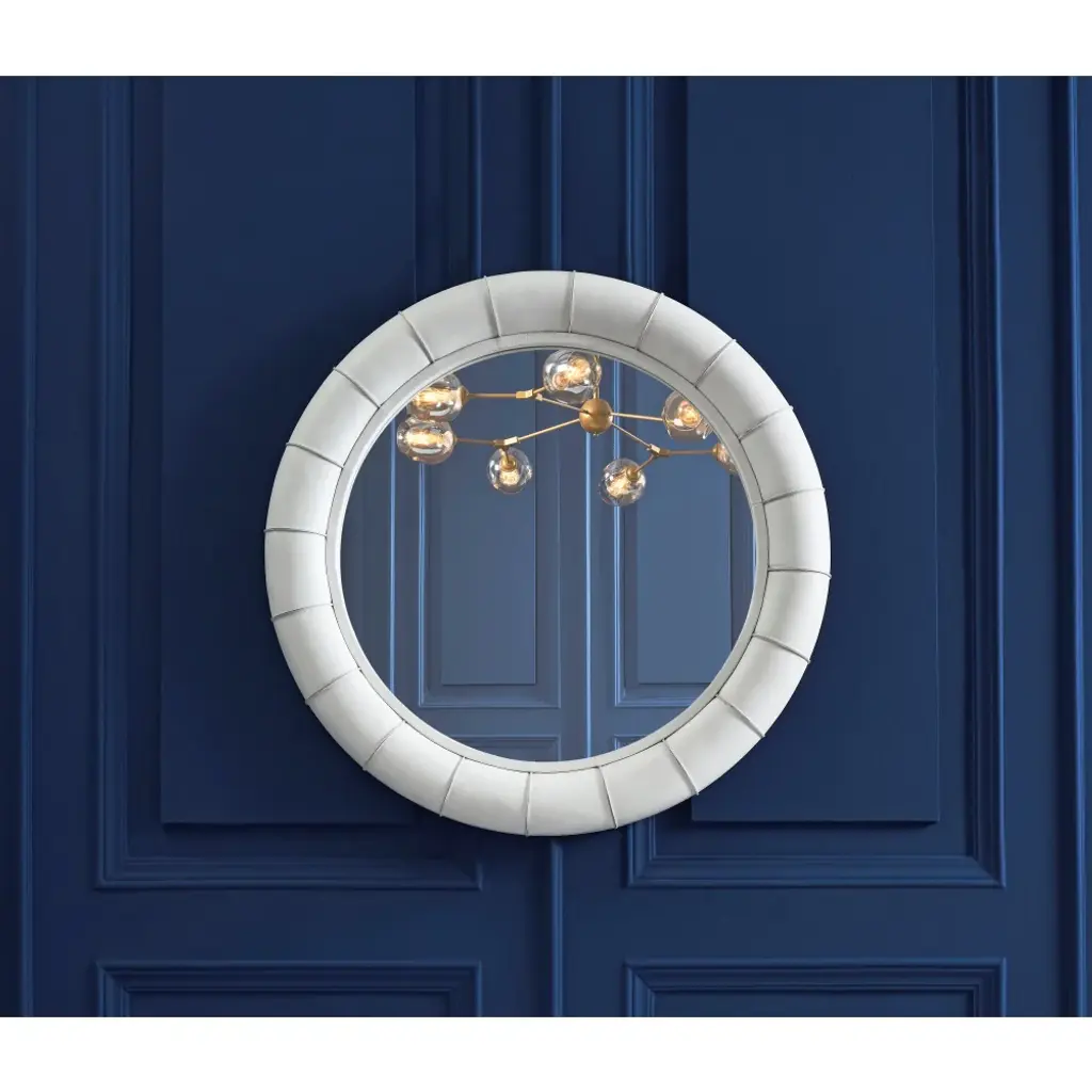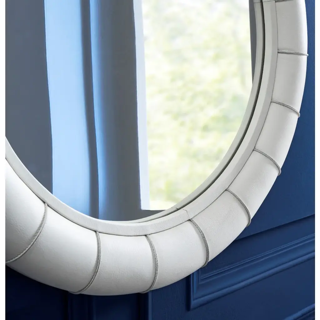 Designed with a refreshing aesthetic, this black leather framed round wall mirror will elevate your style. Mount in a powder room, bedroom, or entry way for an inviting first impressions.