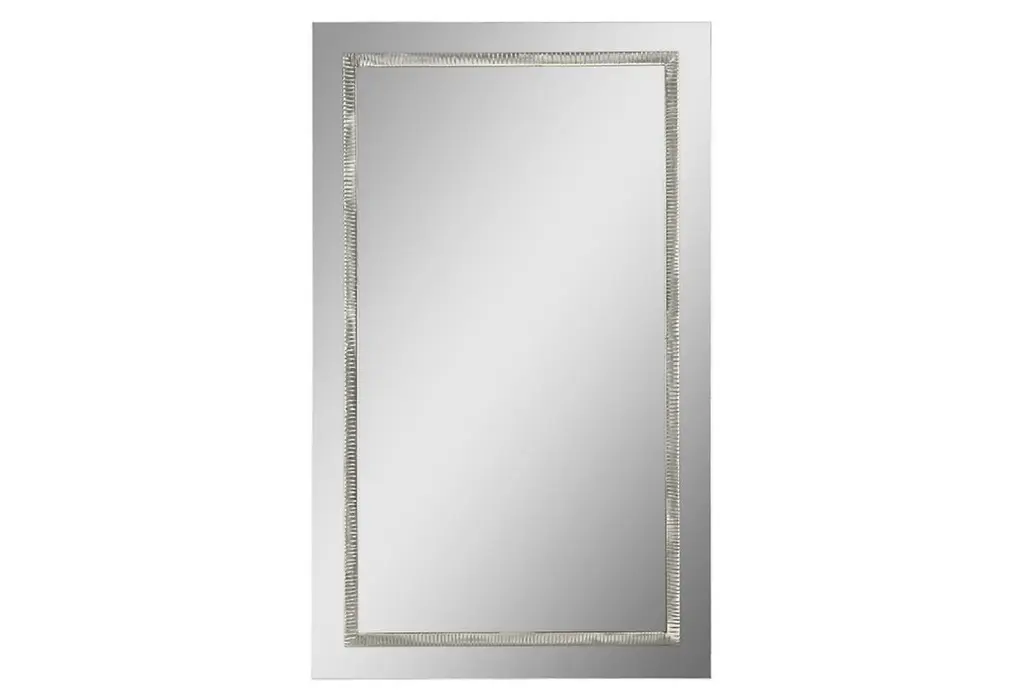 A brilliant silvery band runs around this oversize rectangular mirror, breaking up the surface in a way that feels understatedly modern.