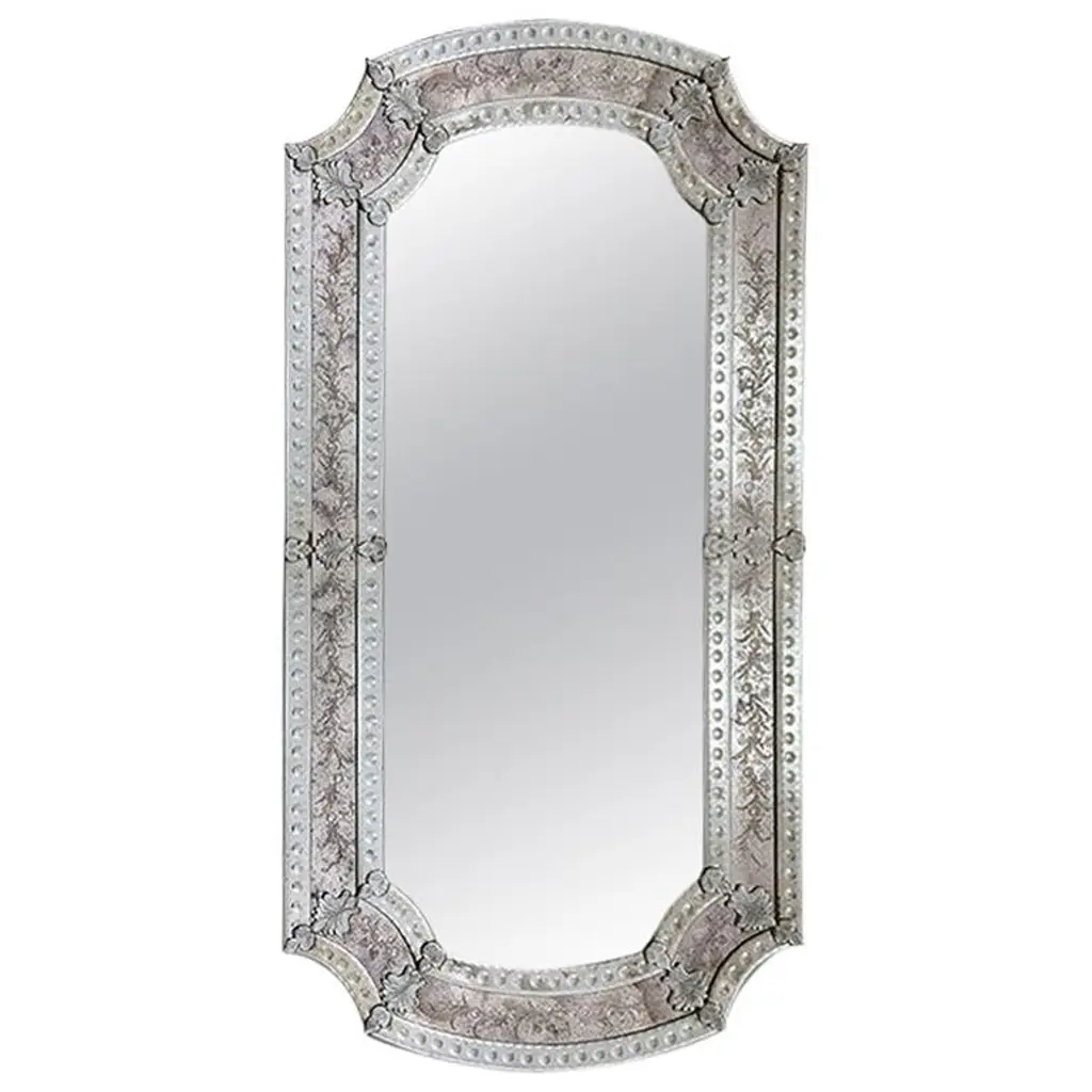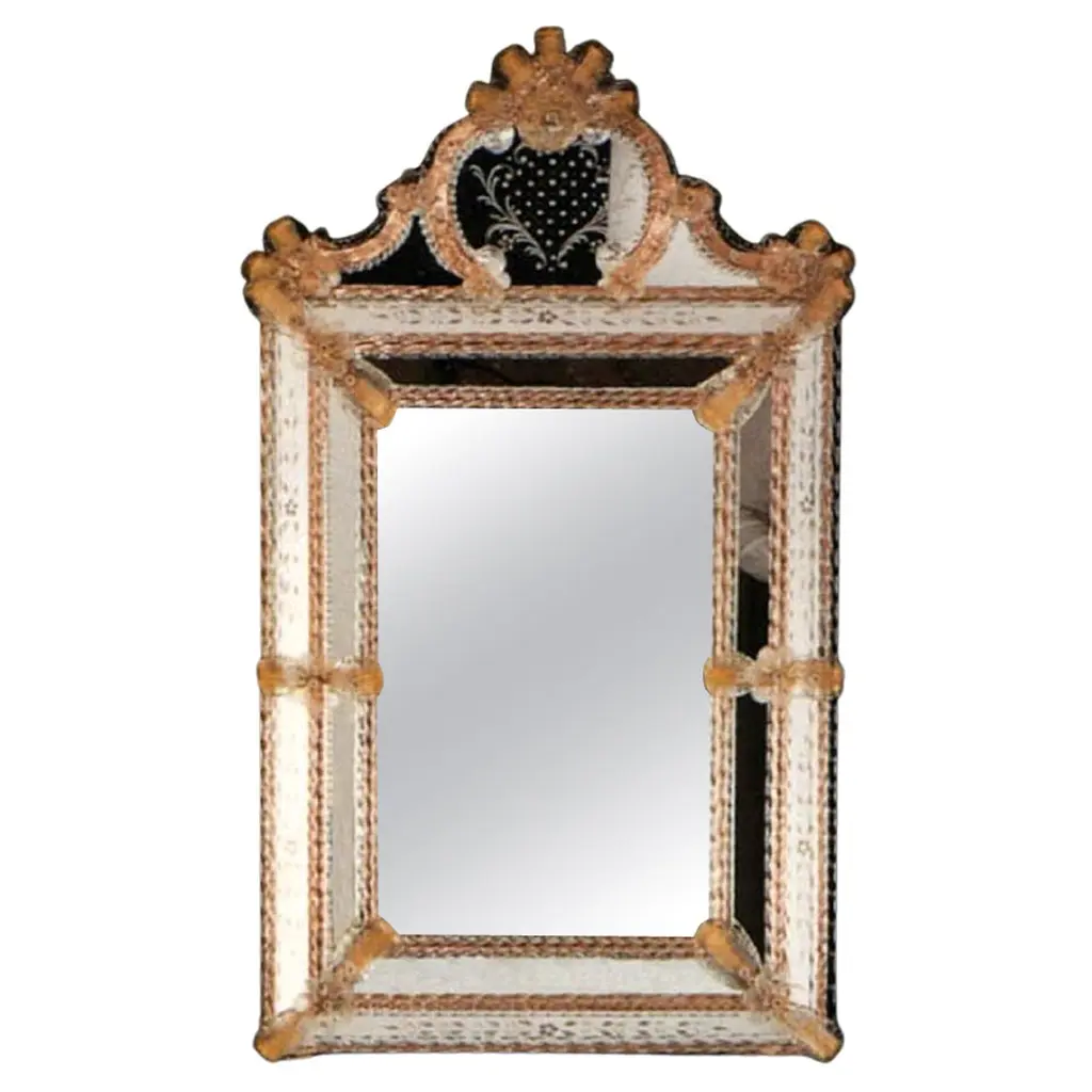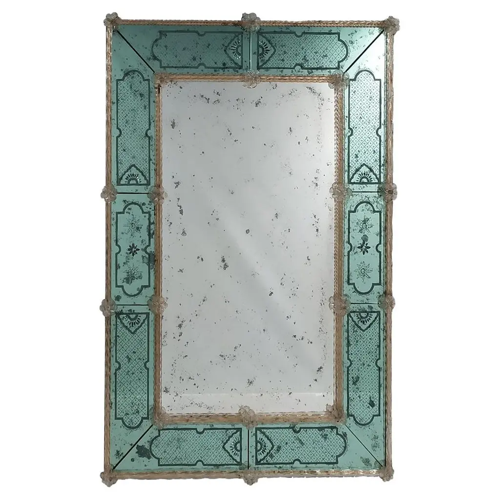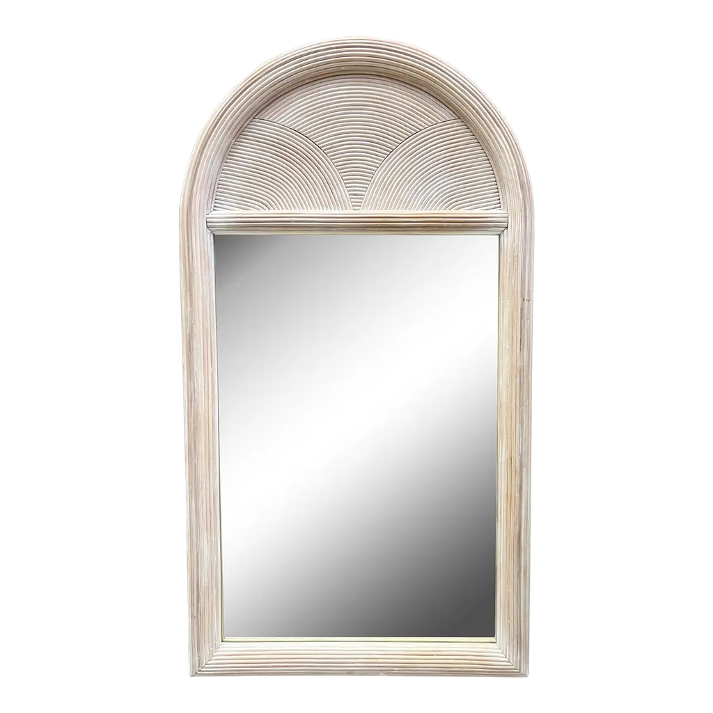 Classic inspired mirror framed in wire brushed wood with an antique gold finished frame. Clear beveled center mirror is surrounded by antique mirror panels accented with solid brass stars. Hangs on metal cleat (provided).