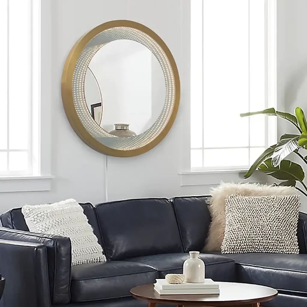 Bring a celestial appearance to your decorative layout with the Starfall Vanishing LED Mirror by Nova of California. The Starfall Vanishing Mirror Is a beautiful work of art as well as a fully functional mirror. This mirror works perfectly over sofas and sectionals to fill the wall with multifunctional décor. The large circle of bulbs around the edge creates the illusion that the light goes on forever. Starfall Vanishing Mirror has a traditional mirrored center that beautifully reflects the user due to the circle of light around the mirrored section. Finished off with a metal frame, the modern mirror compliments modern, transitional and mid-century decors. Compatible with Amazon Echo, Google Assistant, and Apple Home, Starfall can be automatically turned on/off manually, by voice activation, or by scheduled settings.