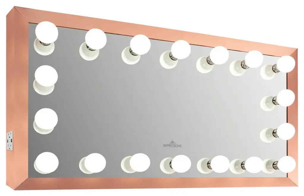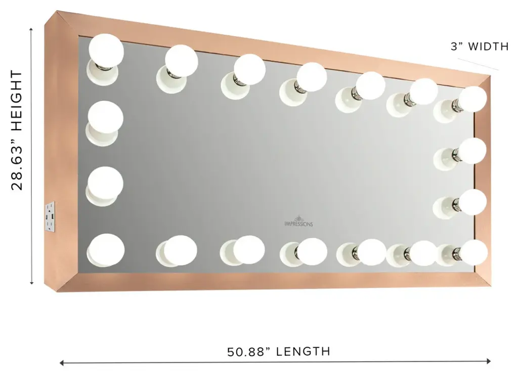 Impressions Vanity Bold and brilliant, this thick metal frame brings a stunning style to any home and is a statement piece for any room. Take home the ultimate Hollywood backstage experience and bring out your inner glamorous celebrity on the daily with the amazing Impressions Vanity Starlight Wide Vanity Mirror. Mounted horizontally, this pronounced piece measures 51 inches wide creating an illusion of a larger space for your home. The modern and elegant design elements allow this mirror to blend with a variety of styles. Perfect for bedroom, dressing room, studio, makeup room, barbershop, etc.Features:REFLECTIVE ILLUMINATION: Illuminate your face with 18 Froster LED Globe Bulbs encased in silver glossy holders, casting a cool white light on the LED makeup mirrors surface for the perfect makeup applicationCHARGING HUB: Stay connected and charged while getting ready with the integrated 2 slot 5V USB port and 2 TR plugs located beside the lighted vanity mirror frame, ensuring your devices are within reachPREMIUM CONSTRUCTIONS: Transform your daily makeup routine into a star studded affair with our vanity mirror with lights stunning rectangular design, featuring a premium metal frame that exudes eleganceGLAMOROUS STYLE: Experience the ultimate Hollywood backstage feel every day as you indulge in the luxurious ambiance and embrace your inner glamorous celebrity with this exquisite LED mirror vanity
