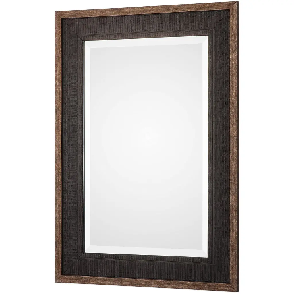 This Solid Pine Frame Has A Mesh Texture Surface Finished In A Rustic Black, Accented With A Distressed Aged Bronze Outer Edge. Mirror Features A Generous 1 1/4in Bevel. May Be Hung Horizontal Or Vertical.