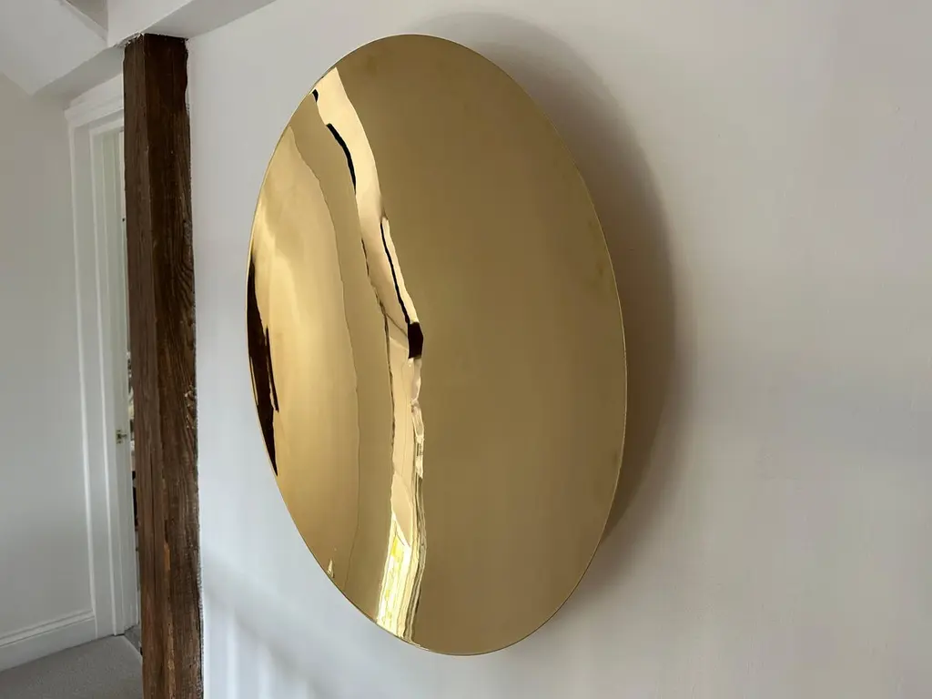 The concave mirror itself creates unique bright reflections which in turn creates the illusion of space. Please note that the image is upside down.The mirror is fabricated out of 3mm 304 stainless steel. It's formed and then polished. after extensive polishing the mirror is electroplated and polished once again. The mirrors create focal points in any room and help create that "wow' factor.We also offer this mirror in different diameters up to and including 160 cms /63"Very easy to install and fixings included.Please note- due to this mirror being polished by hand there will be slight imperfections/ distortions in the reflections as you can see in the photographs.