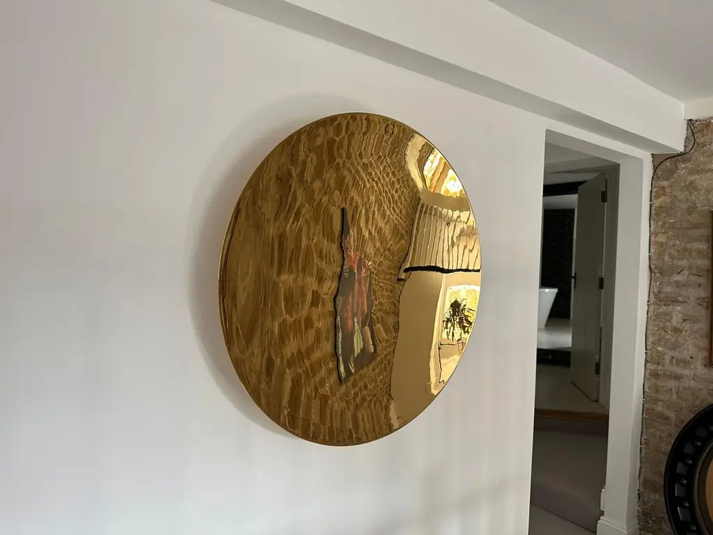 The concave mirror itself creates unique bright reflections which in turn creates the illusion of space. Please note that the image is upside down.The mirror is fabricated out of 3mm 304 stainless steel. It's formed and then polished. After extensive polishing the mirror is electroplated and polished once again. The mirrors create a focal point in any room and help create that "wow' factor.We also offer this mirror in different diameters up to and including 160 cms /63"Shipping - the mirror is shipped in a wooden anti-vibration crate for international deliveries.Please note- due to this mirror being polished by hand there will be slight imperfections/ distortions in the reflections as you can see in the photographs.