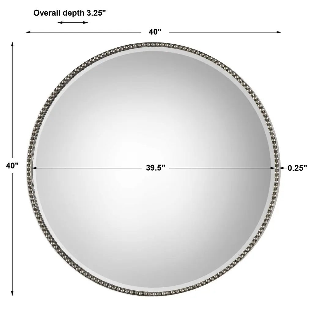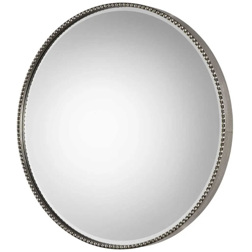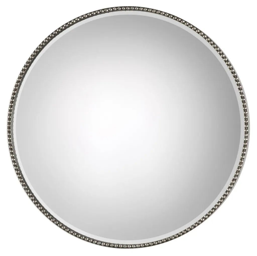 This petite iron frame features a beaded surface with a deep profile, hand finished in a lightly antiqued silver leaf. Mirror has a generous 1 1/4" bevel.