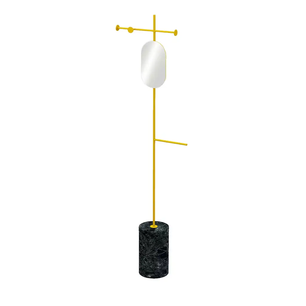 The bright and sleek appeal of the Yellow Siena marble base lends this coat hanger a refined character and functionality. Available in other precious marbles, the cylindrical pedestal supports a black lacquered iron stem with two arms, completed with a luminous mirror. Other colors are also available upon choice, please ask the Concierge for options and pricing variants based on marble type.