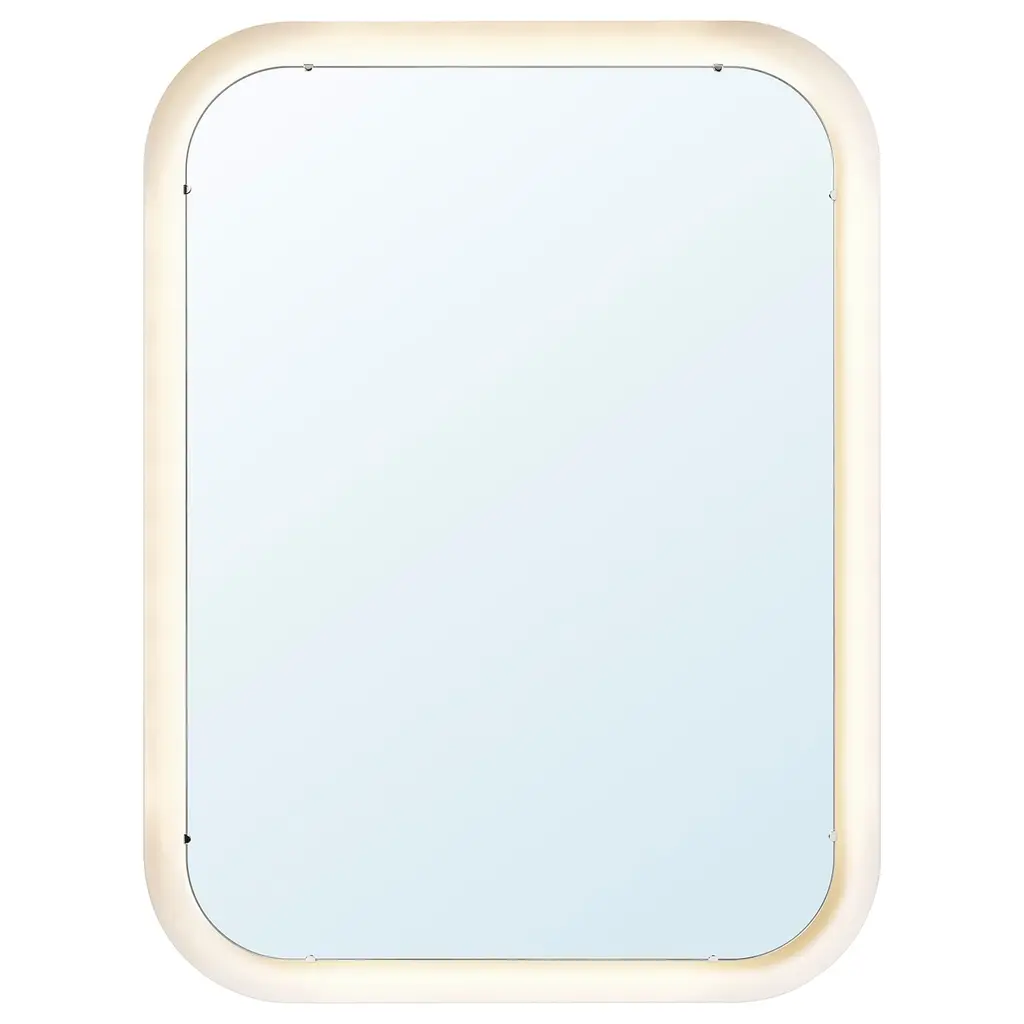 STORJORM Mirror with built-in light - white 31 1/2x23 5/8 ". The LED light source consumes up to 85% less energy and lasts 20 times longer than incandescent bulbs. Gives a diffused light. Good for spreading light into larger areas of a bathroom. Tested and approved for bathroom use.