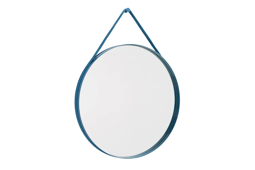 With its clean, circular shape and incorporated hanging strap, the Strap Mirror 2 makes a colorful, modern addition to a bedroom, entryway, or bath area. The frame is made with a recessed channel to hold the sturdy woven polyester strap in place.