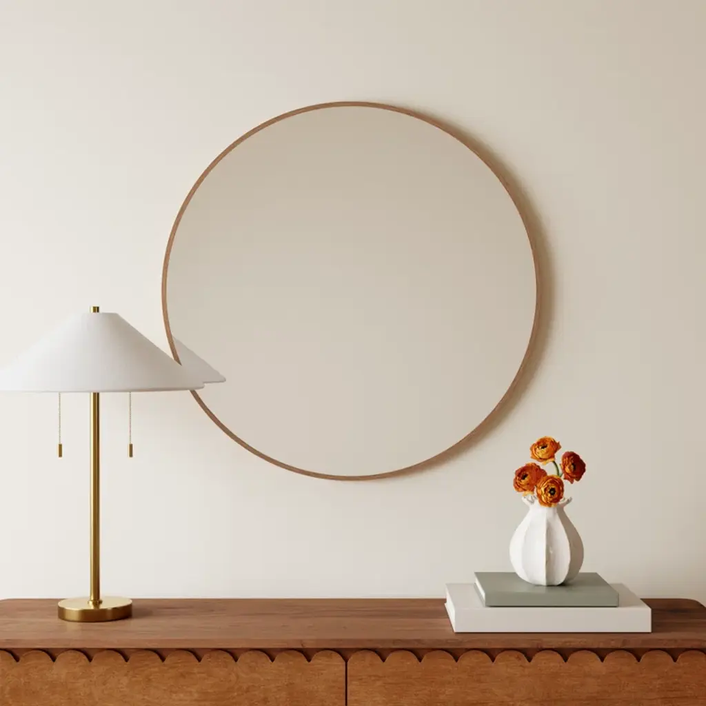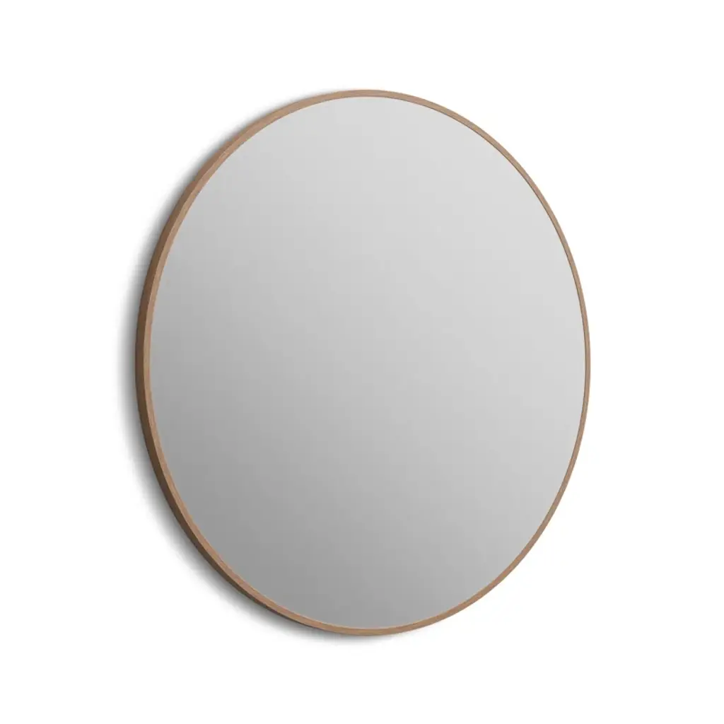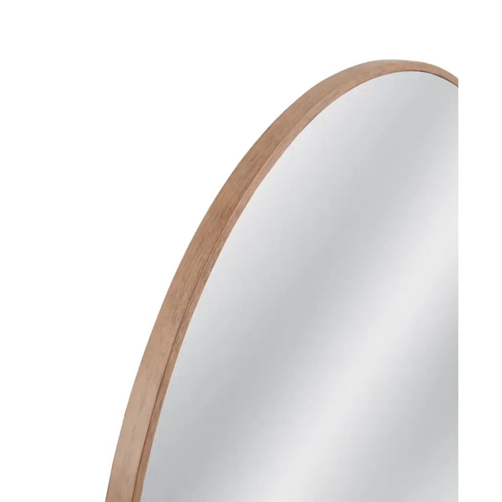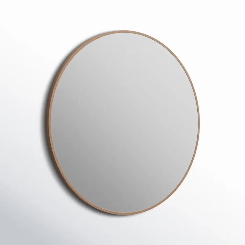 This round wall mirror adds a warm and inviting touch to your home with its hand-painted wooden frame. The natural wood grain color variation brings a sense of authenticity and character to any space. Its classic frame design in a rich brown finish complements various decor styles, from traditional to modern. Hang it in your entryway, living room, or bedroom for a timeless accent that reflects your personal style. Plus, it's easy to mount, so you can enjoy its charm right away.