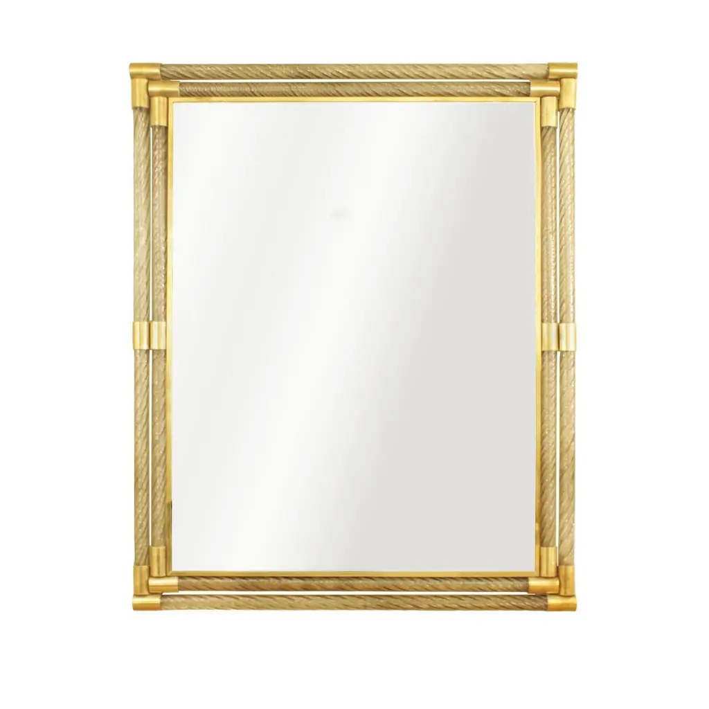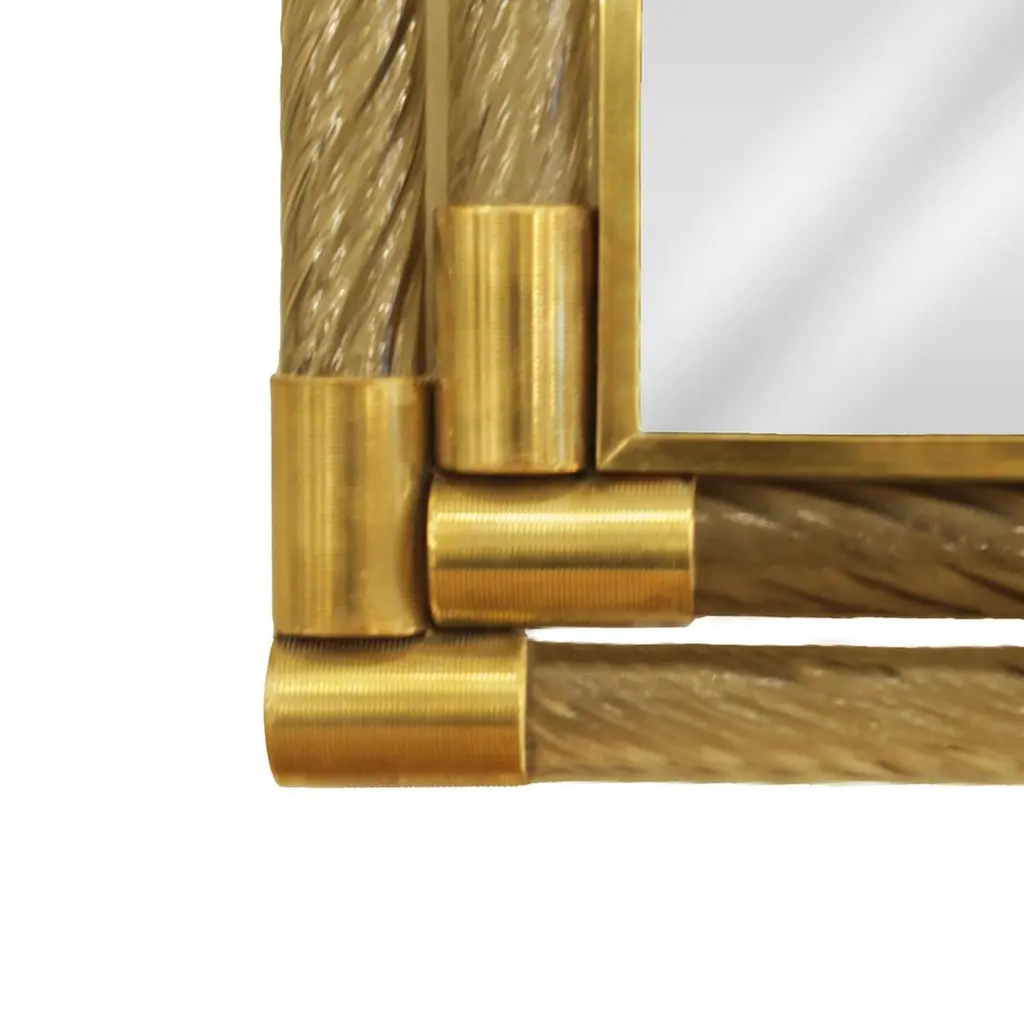 Bring luxury and elegance to your interior space with this Barovier & Toso inspired Murano glass, coiled double rod framed wall mirror with polished brass inset frame and etched brass cuff details at corners and midpoints along sides. Mirror's dimensions can be customized to suit your space. Italy, 2025 Please inquire with Venfield for custom estimates and lead times.