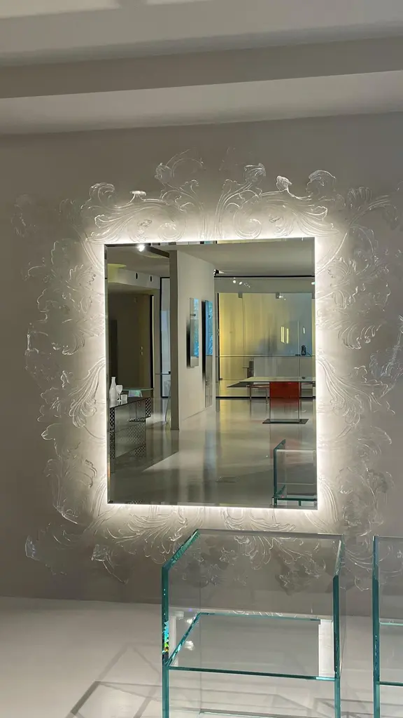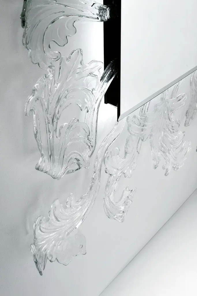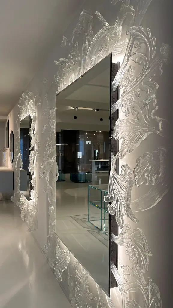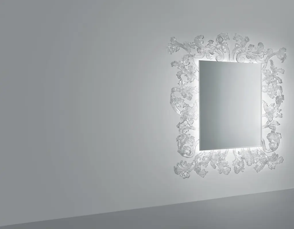A truly magnificent mirror with Murano glass frame, achieved through a complex and refined hand-made production process, making each piece unique and unrepeatable. The frame is composed of various elements which are fixed to a wall hanging structure upon which a 5 mm. thick chamfered mirror is then applied. Featured with an LED lighting system, which enhances and exalts the frame.Born in Milan, Italy in 1958. After having studied at the Istituto Europeo di Design in Milan in 1993, he began to work freelance, designing packaging and display systems. He collaborated with various architecture studios and in 1997 he began work at the studio of Piero Lissoni in Milan where he is presently Design Manager. In 1998 he co-founded the Codice 31 group. From 1999 onwards, he has been designing lights and interior furnishings for Fontana Arte, Pallucco, MOS by Cover, Glas Italia, Coro, Artelano, Diamantini&Domeniconi and ModoLuce.Additional Information:- Dimensions: STU01 W 210, D 20, H230.Please note that the list price excludes VAT. An additional VAT charge may apply.