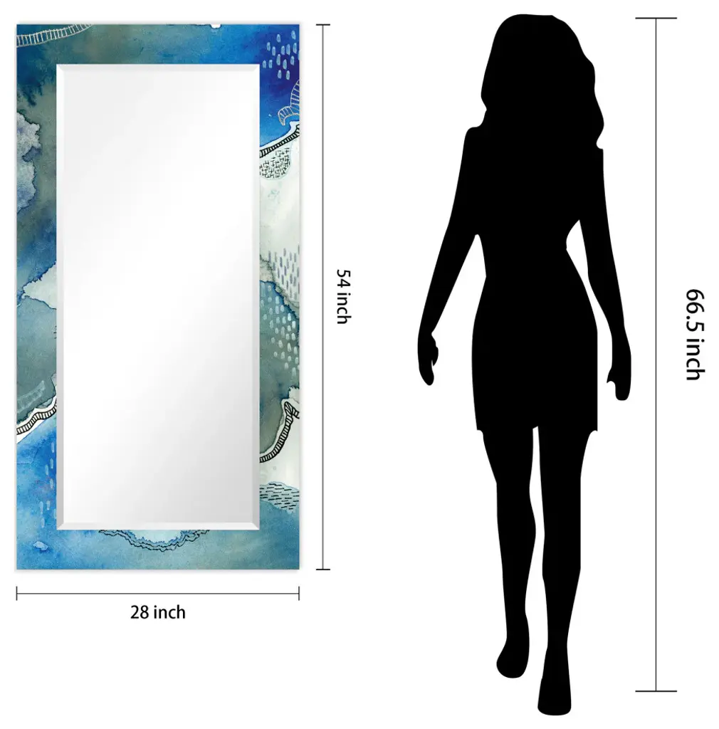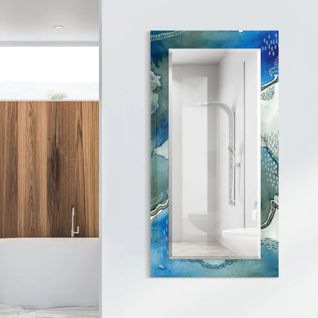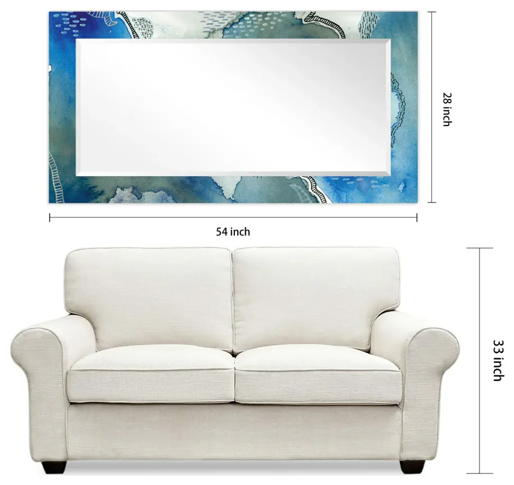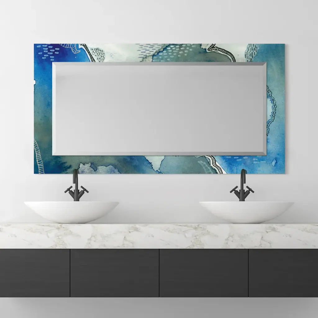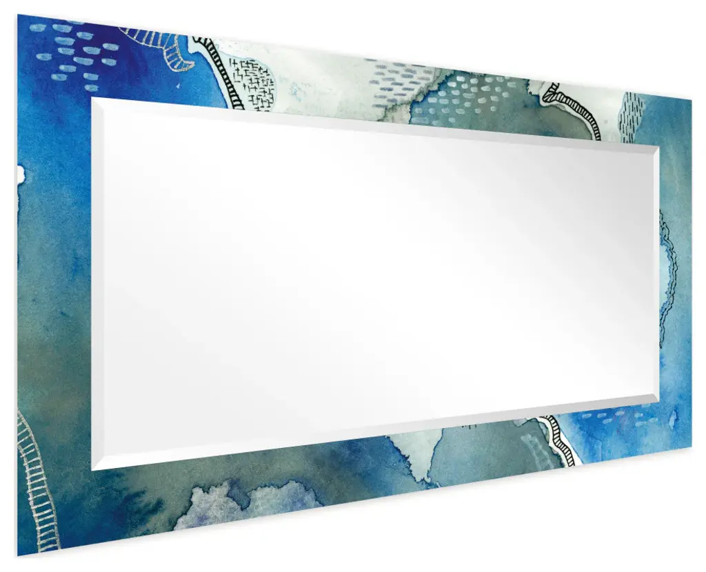 "Subtle Blues" Beveled Mirror On Printed Abstarct Tempered Art Glass, 54x28"