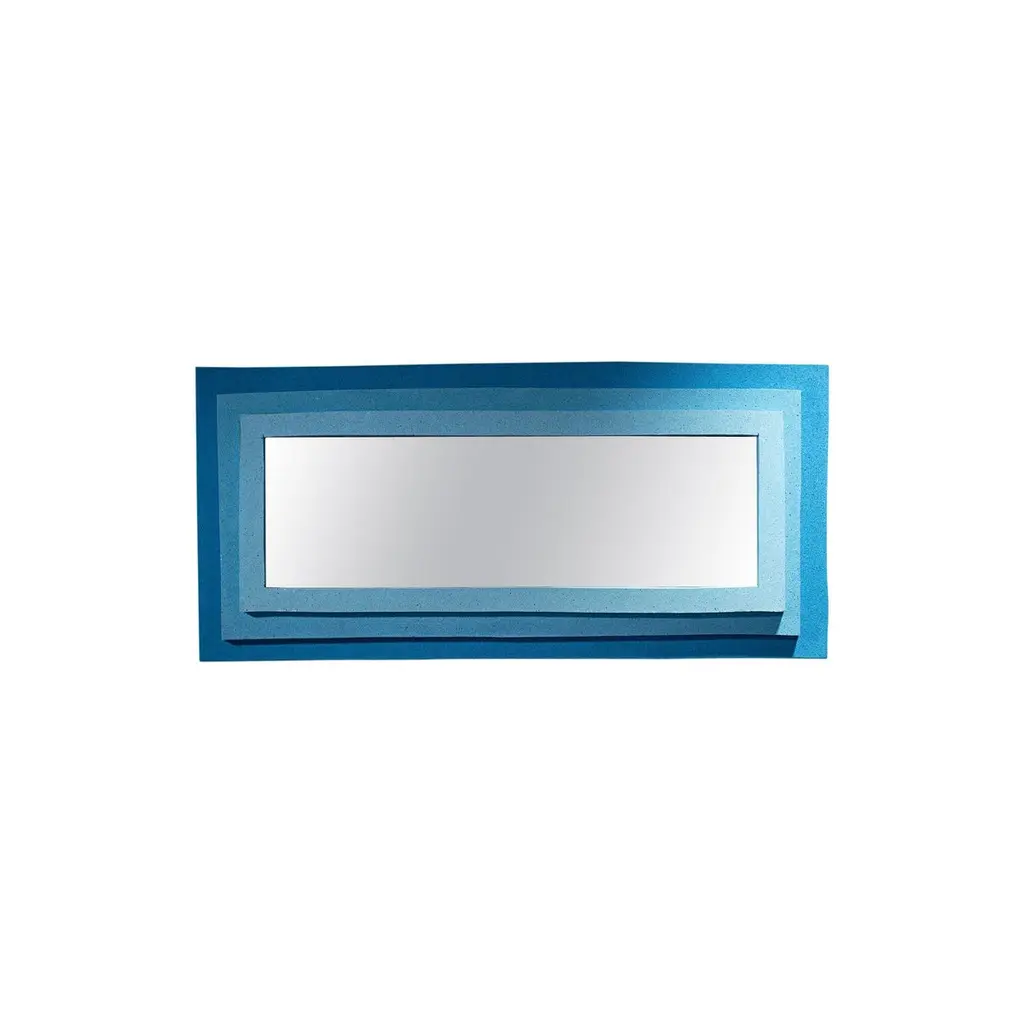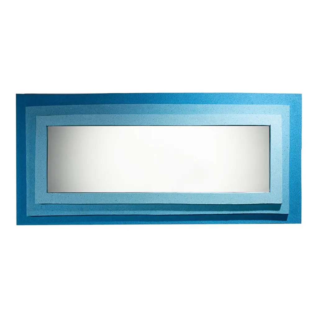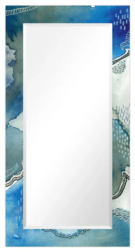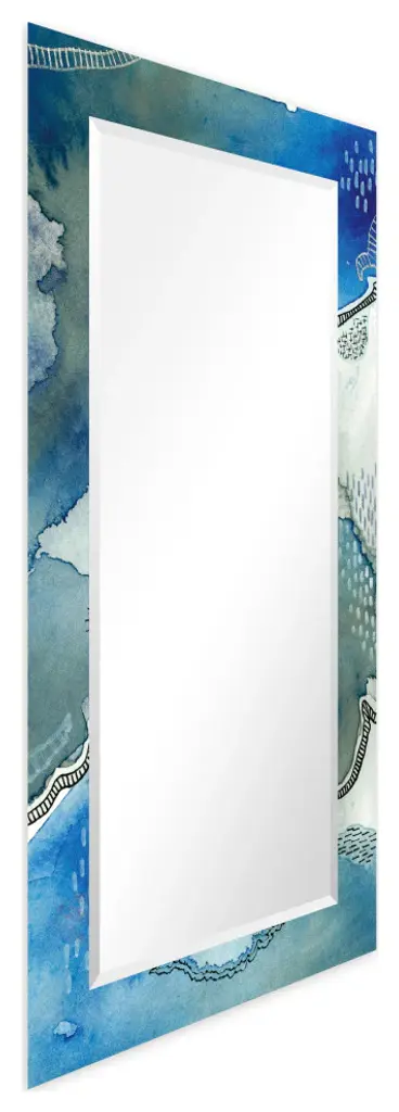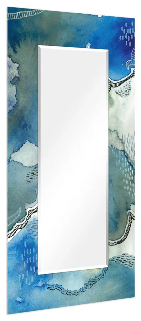 Empire Art Direct"™s collection of printed, frame-less, free floating, tempered glass was inspired by the French technique of Verre Eglomise in which artist''s literally painted the back of clear glass so that when viewed from the front the painting is brought to life under the depth of the glass. This incredible piece by Regina Moore takes that same tempered glass and displays a beveled mirror, centered in front of a beautiful blue and grey abstract. 4 strong steel hangers are attached to the back of the mirror for a quick and easy vertical or horizontal installation.
