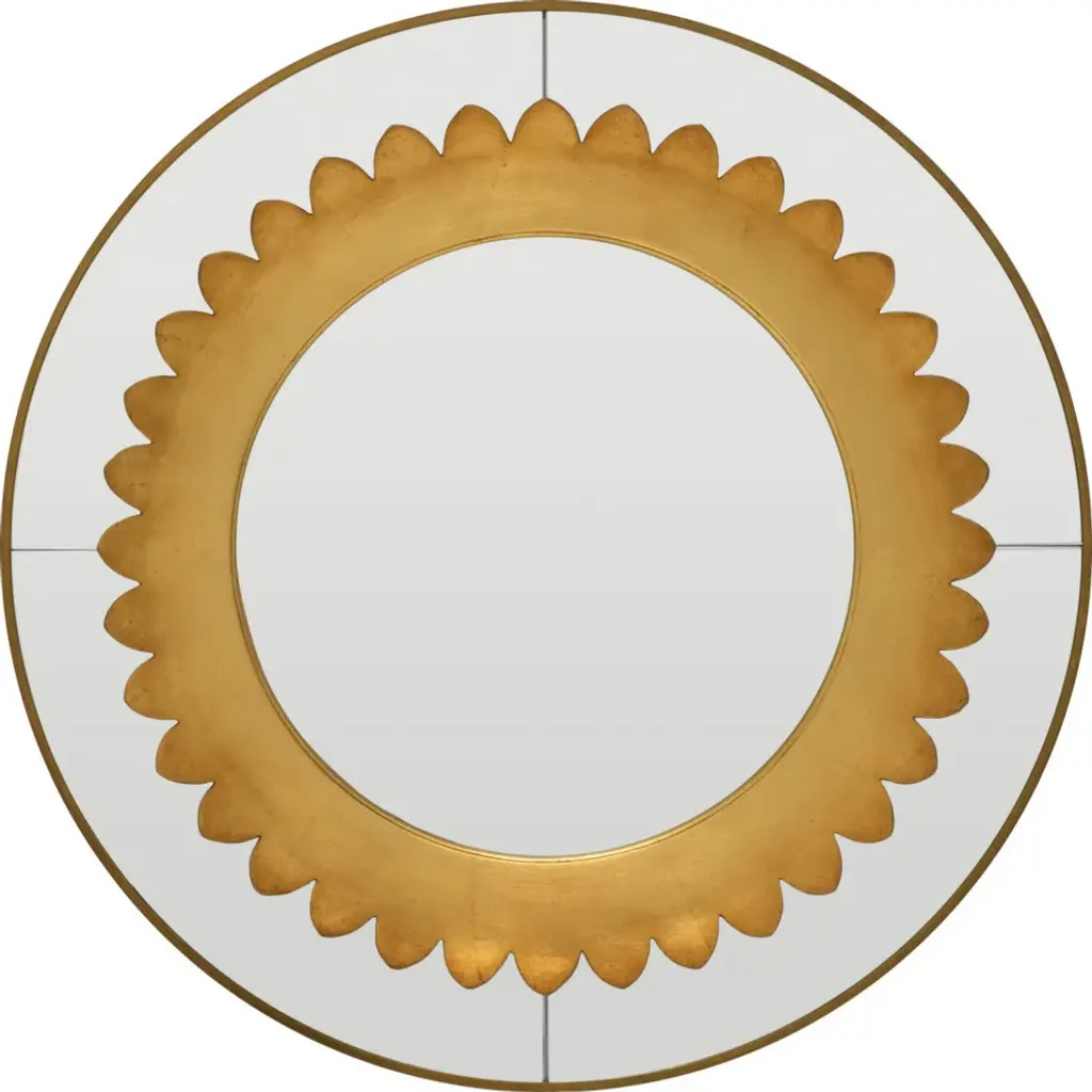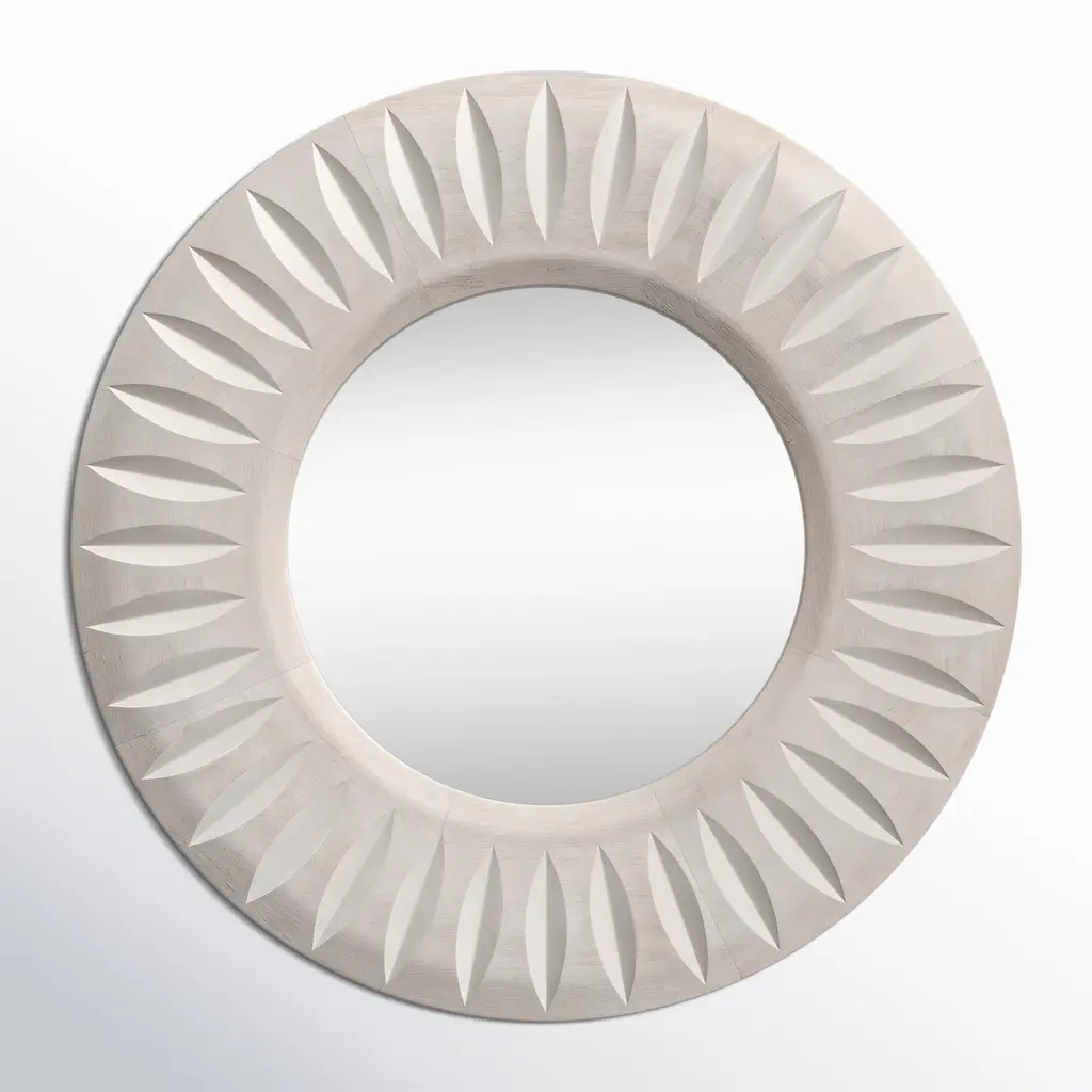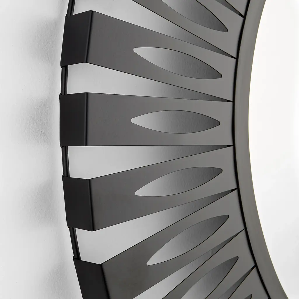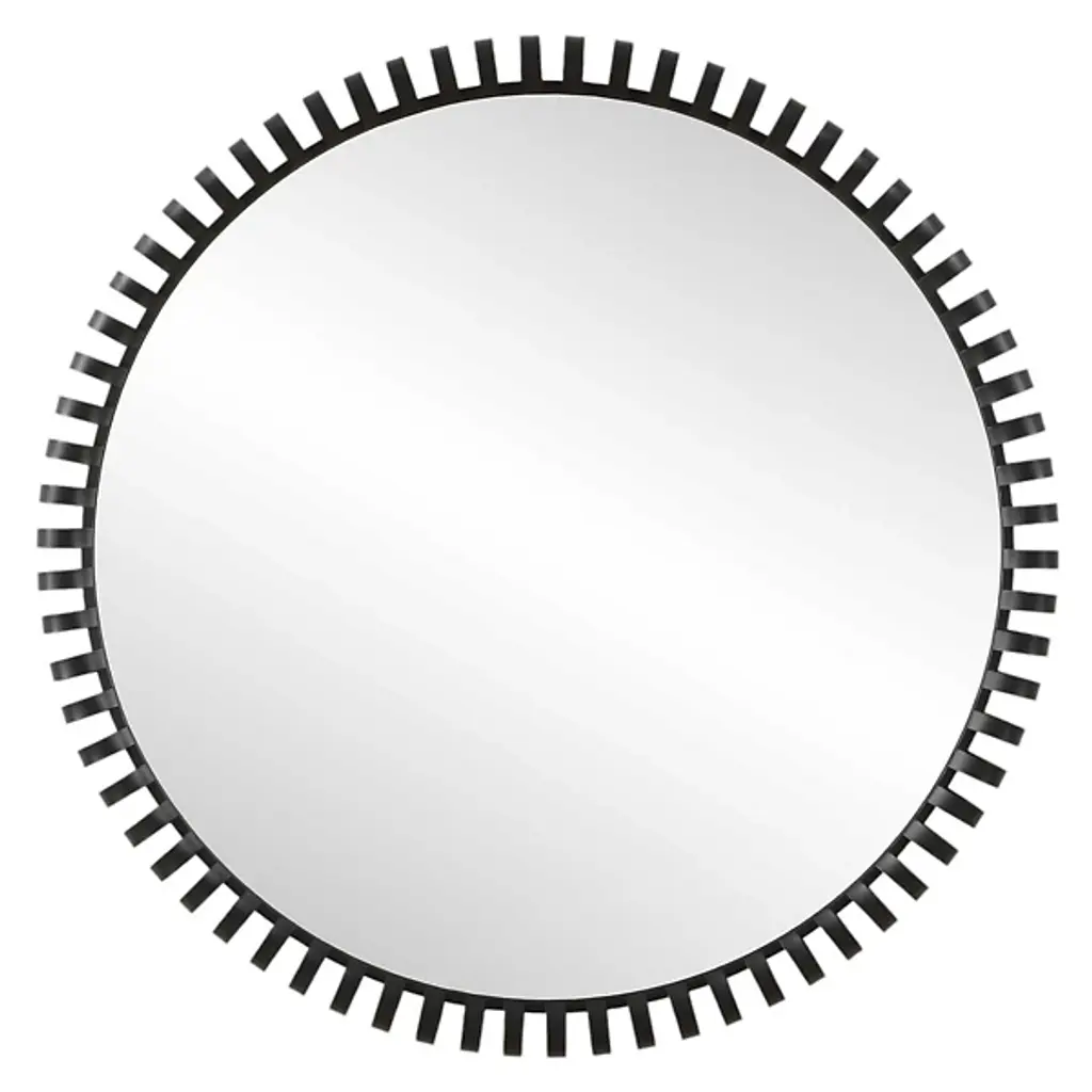 This decorative wall mirror features a modern metal frame in a round graphite finish. The iron metal has accented tabs that are arranged side by side into one large circle with the reflective glass centered perfectly to provide absolute symmetry. This gorgeous mirror makes an impressive statement showcased in multiples or works just as well hung individually in any home or commercial space.
