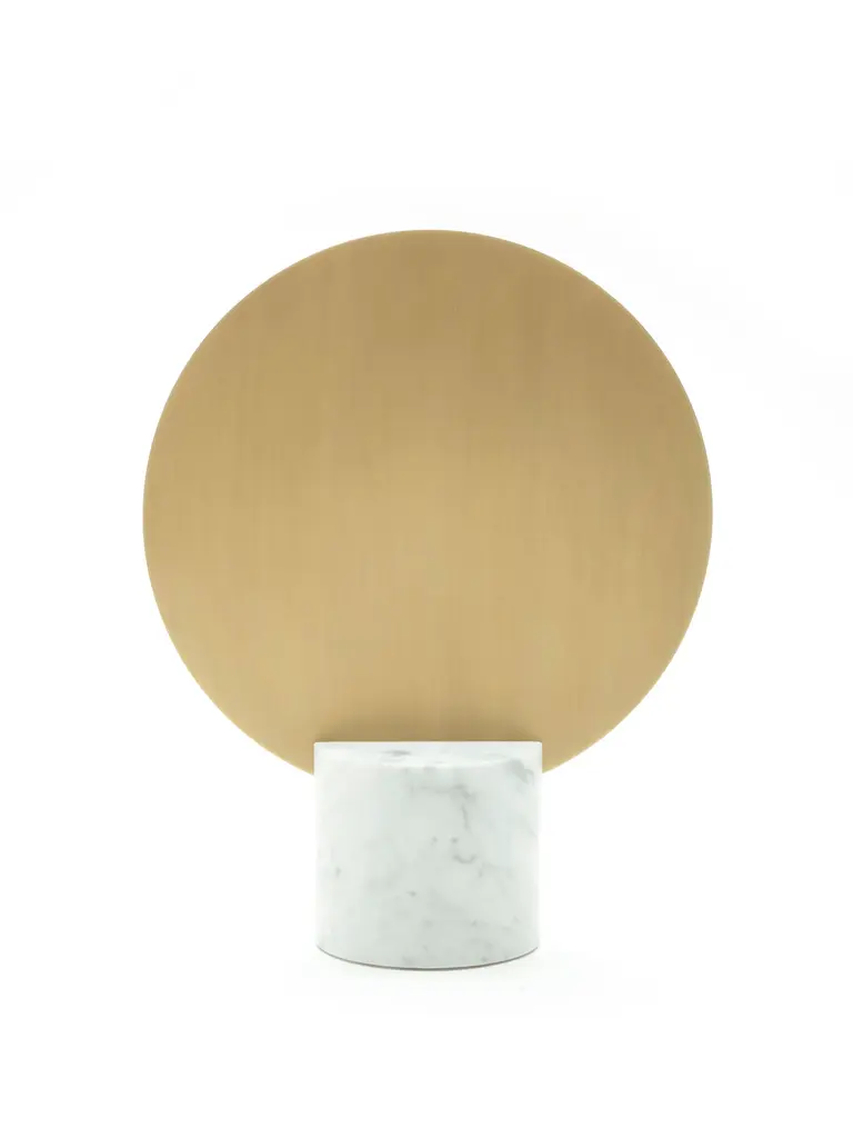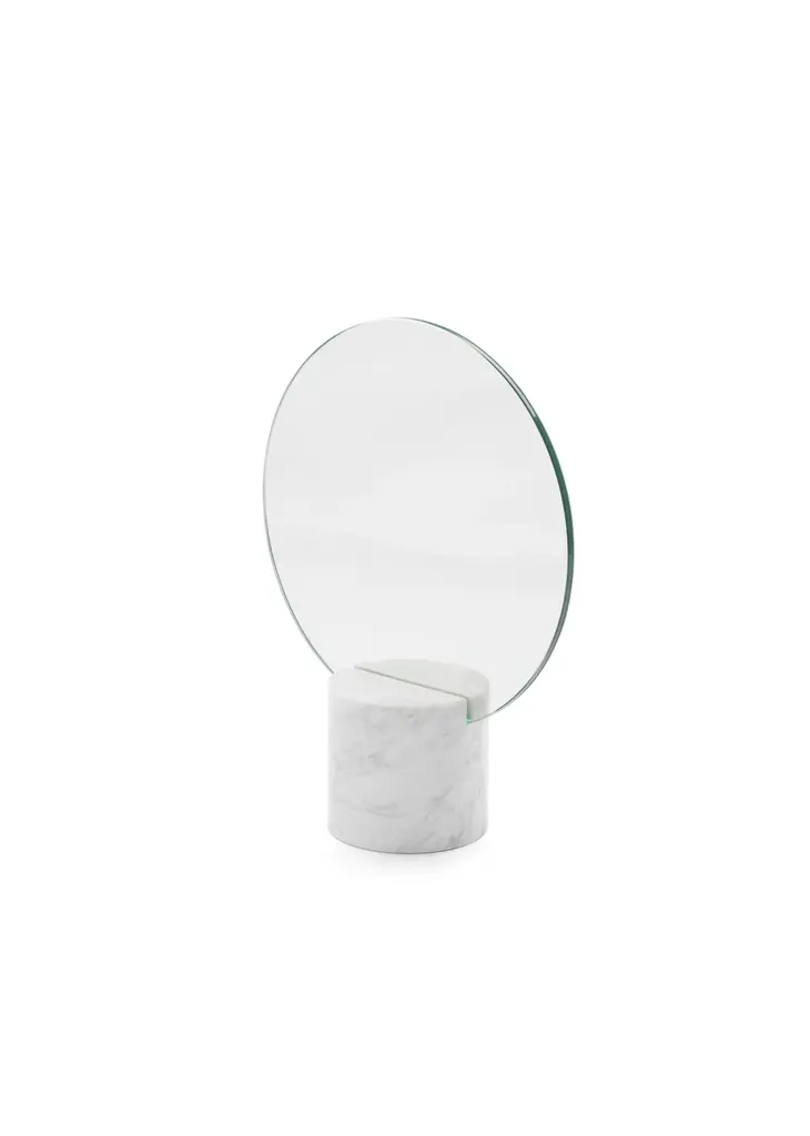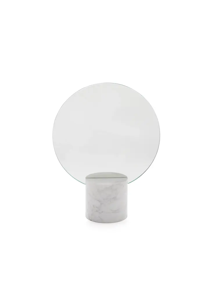 This mirror is placed on a base made of Carrara marble. The back of the mirror is made of polished brass.
