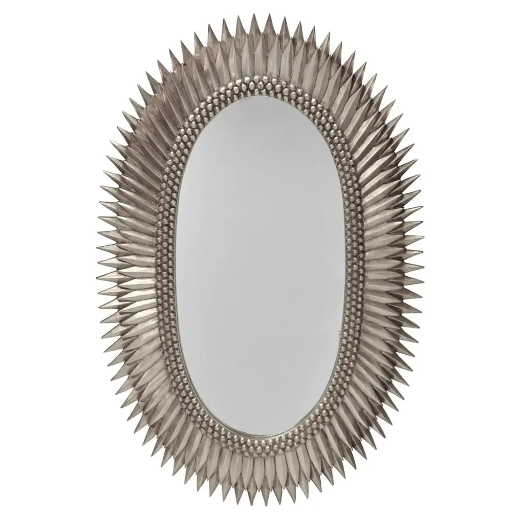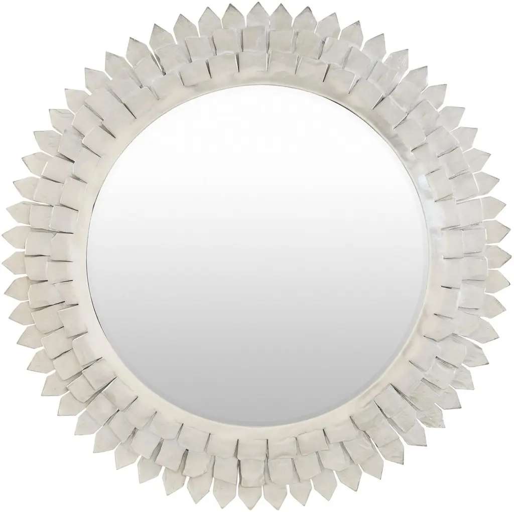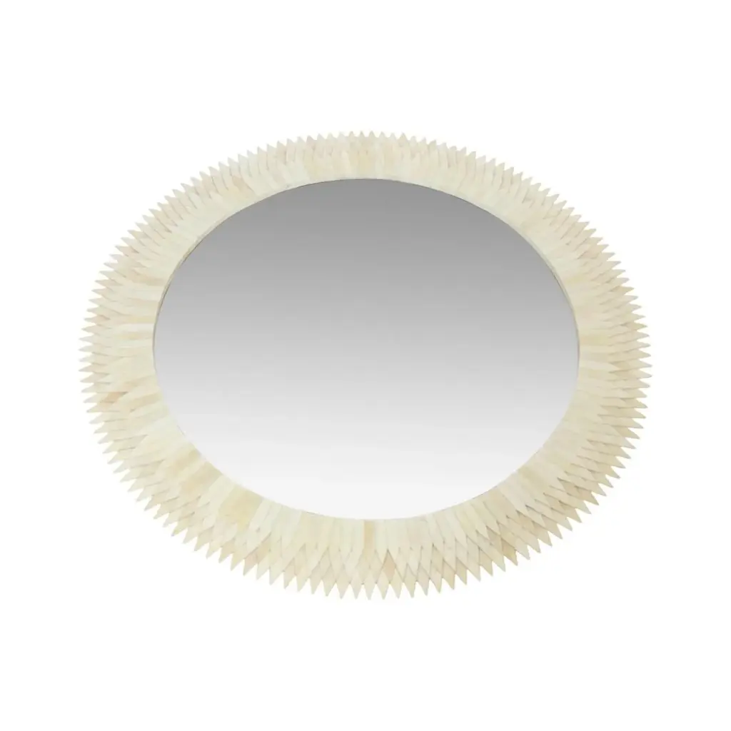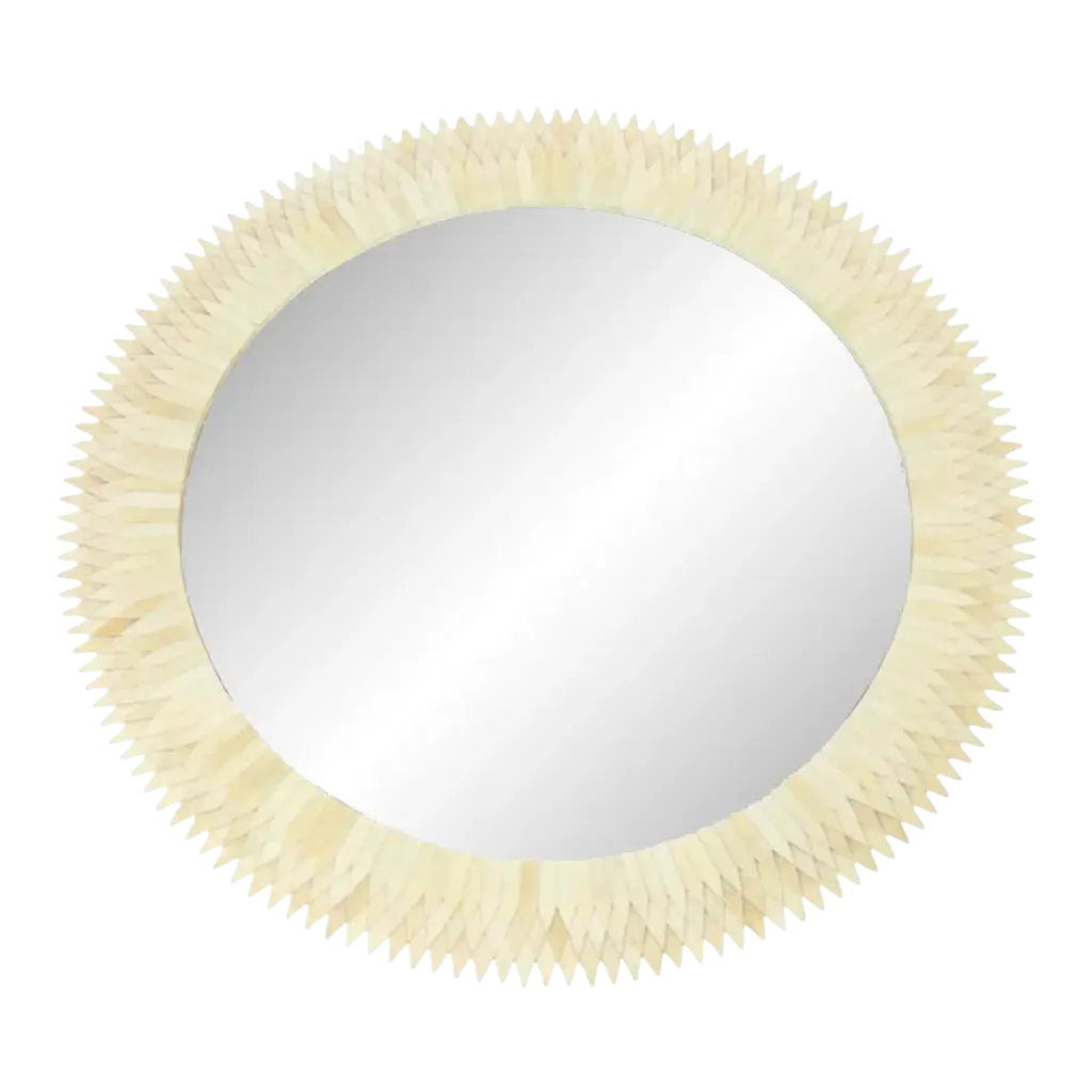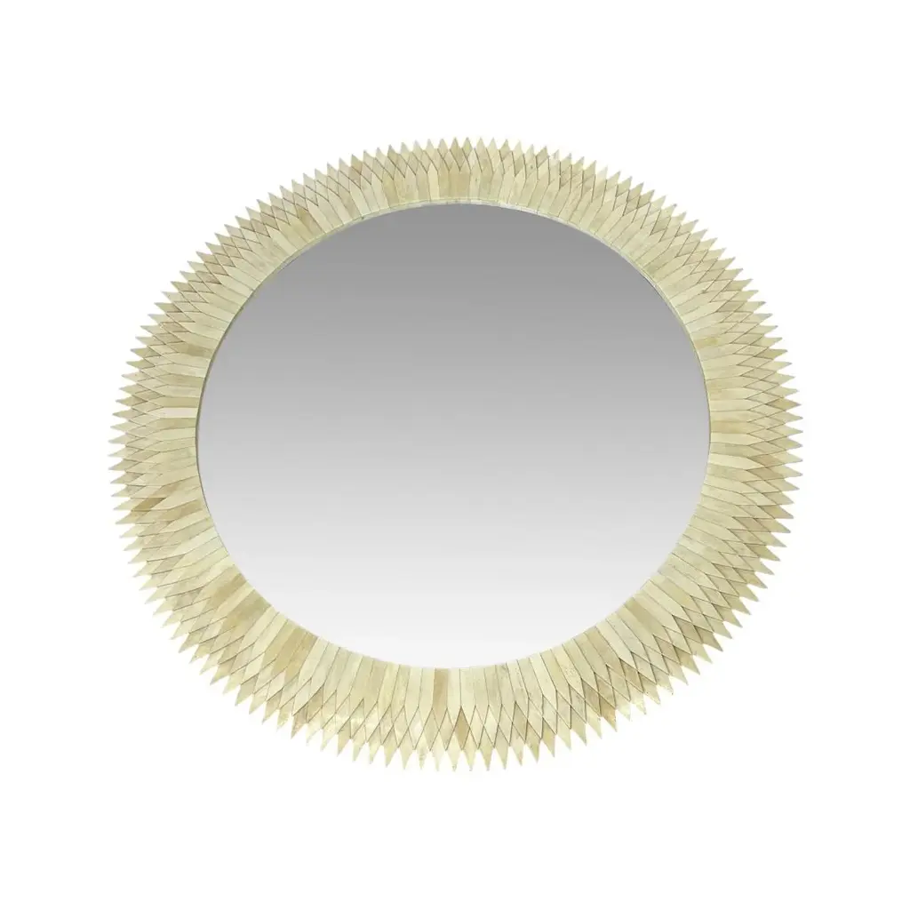 Elevate your home décor with this Stunning Round Bone Inlay Mirror, a masterpiece of intricate craftsmanship and timeless elegance. Featuring a radiant sunburst pattern meticulously hand-inlaid with natural bone, this mirror is both functional and decorative, adding warmth and sophistication to any space. Itssleek round design and neutral tones make it versatile for various interior styles, from contemporary to traditional. Dimensions: 36" x 36" Features: 1. Premium Material: Handcrafted using natural bone and a sturdy wooden frame for durability. 2. Design: Unique sunburst pattern offering a luxurious yet understated appeal. 3. Versatility: Perfect for bedrooms, living rooms, entryways, etc 4. Handmade: Created by skilled artisans, ensuring each piece is unique.