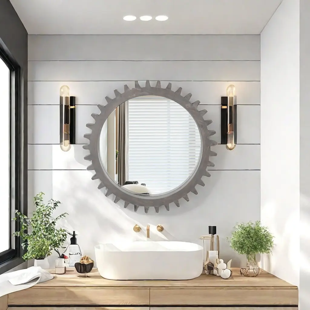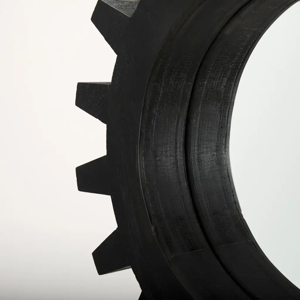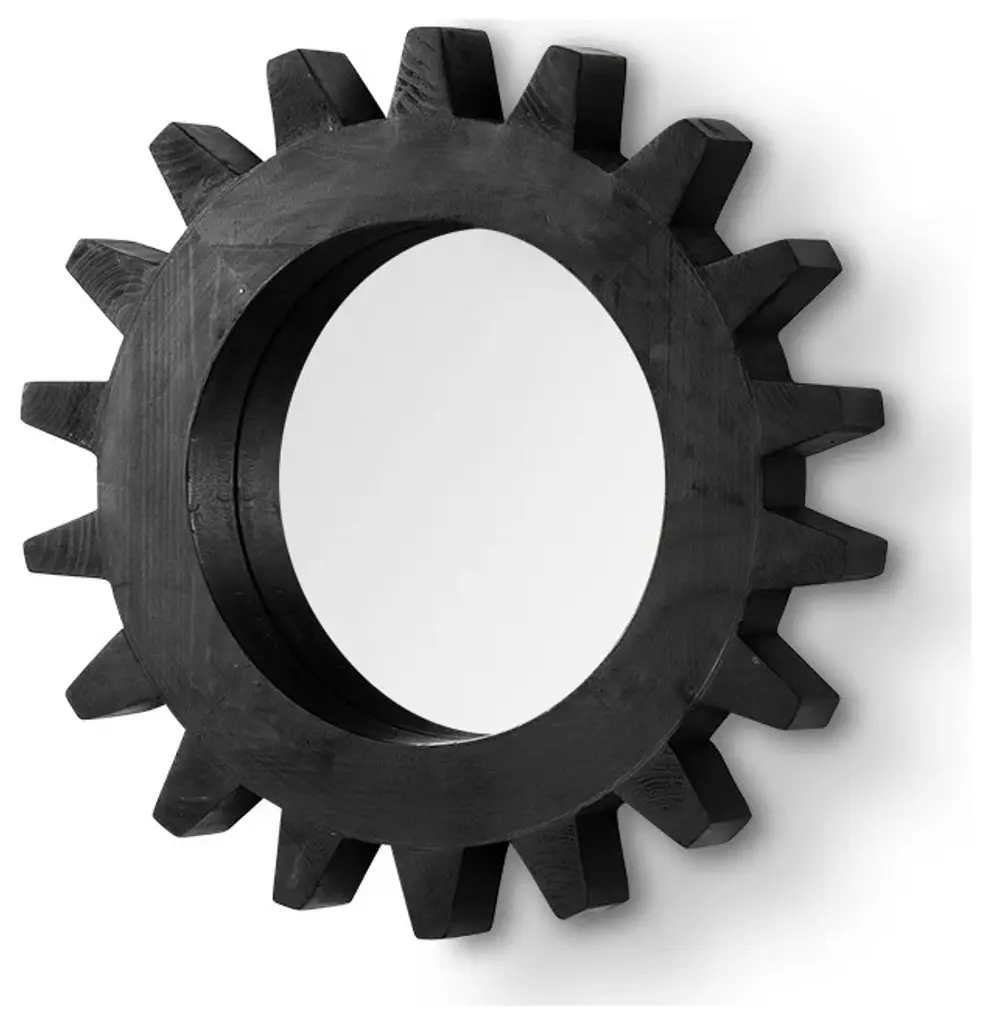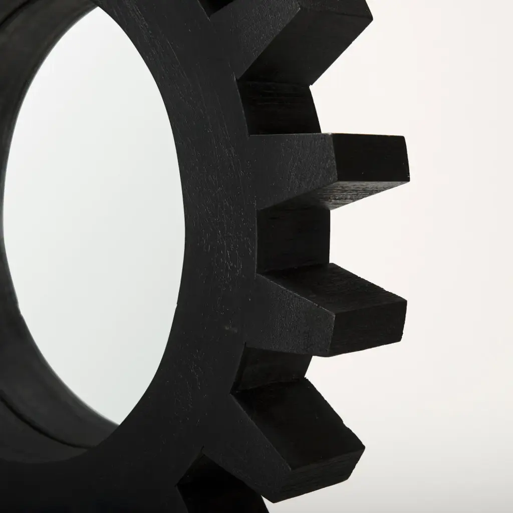 Crafted from wood and finished in a matte-black finish, the Sundance Cog is a stunning round mirror with triangular, cog-like grooves on the frame. Spanning 17" in diameter, this stylish wall mirror looks gorgeous by itself or when grouped with others in the Cog Mirror series as a collection, especially in spaces based on the Industrial design styles.17.0" Round Wall MirrorWith a height of 17" and a length of 17", the Sundance Cog III looks exquisite on its own or hung side-by-side with multiple mirrors to open up a space. Solid Wood ConstructionThe Sundance Cog III, expertly crafted from wood, makes for a sturdy and substantial addition to your space which is built to stand the test of time. Premium FinishThe Sundance Cog III flaunts a superior, black polish that highlights the grains and variation in the wood used, making it a stellar addition to any living room. These stunning industrial-inspired mirrors from the Cog series can be paired with others from the Cog series or the Metal Cog series to create a masterful mirror collection that adds a luxurious touch to any space. Industrial-Inspired DesignFeaturing a unique, industrial-inspired design that resembles mechanical cogs, the Sundance Cog III makes for a great addition to the walls in any space and setting, especially in spaces based on the Mercana Modern and Industrial design styles. No Assembly RequiredDelivered Pre-Assembled and ready to hang, the Sundance Cog III is ready to turn heads in your space as soon as it arrives at the door.